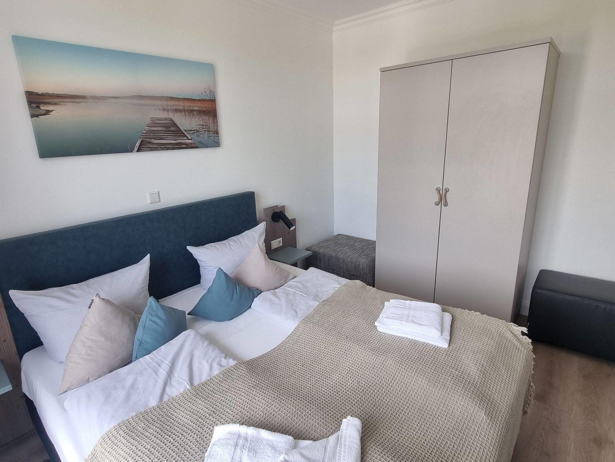 Das Schlafzimmer verfügt über ein 1,80 x 2,00 m Bett, sowie über einen Kleiderschrank und ein TV-Gerät. Die zweite Schlafmöglichkeit ist ein bequemes Schlafsofa mit einer Liegefläche von 1,29 x 1,98 m. Für unsere kleinen Gäste können ein Kinderreisebett und ein Kinderhochstuhl bereitgestellt werden (kostenpflichtig zu buchbar).