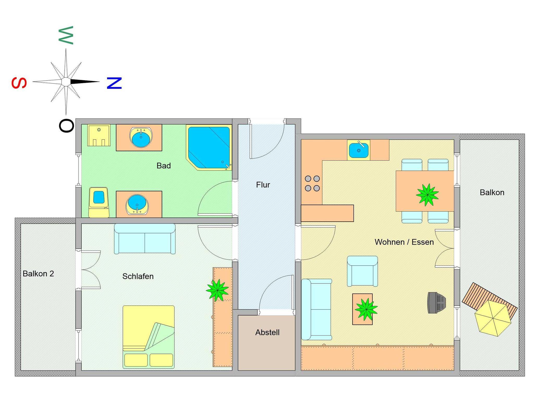 Sie wohnen in einer komfortablen 2-Raum-Ferienwohnung von ca. 70 qm Größe, die sich im ersten Obergeschoss der Villa „Seeadler“ befindet. Es begrüßt Sie ein heller offener Wohn- und Essraum, der mit einer bequemen Couchgarnitur und Flachbild-TV sowie einem Esstisch ausgestattet ist. Es schließt sich die offene Küchenzeile an, die mit allen wichtigen Küchengeräten und -utensilien ausgestattet ist (u.a. Herd mit Backofen, Geschirrspüler, Mikrowelle, Kaffeemaschine, Wasserkocher). Die Wohnung verfügt über zwei Balkone (Richtung Norden und Süden). Ein Schlafzimmer mit Doppelbett sowie das Bad mit Badewanne und WC vervollständigen das Gesamtbild dieser Wohnung.