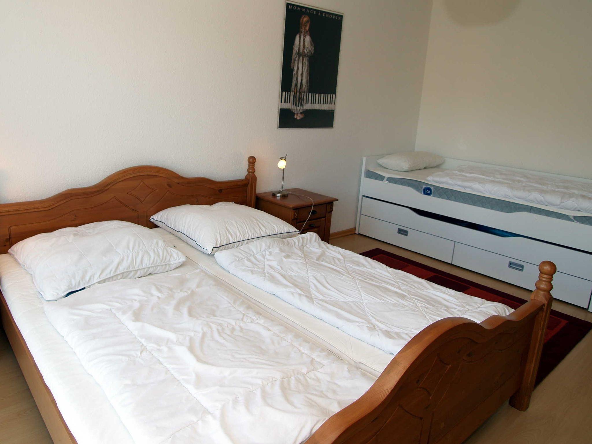 Im Schlafzimmer in der unteren Etage laden Sie ein komfortables Doppelbett (2 x 90 x 200 cm) sowie ein ausziehbares Kastenbett (2 x 90cm x 200cm) zur Nachtruhe ein. Der großzügige Kleiderschrank mit Ganzkörperspiegel bietet genügend Platz für Ihre Urlaubsgarderobe. Als Sichtschutz bzw. zum Verdunkeln ist im Schlafzimmer ein Rollo am Fenster angebracht.