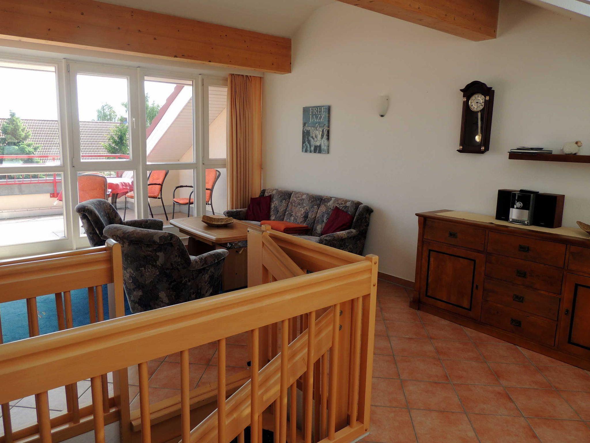Derr helle Wohn- und Schlafbereich im Dachgeschoss ist mit einer Schlafcouch (100cm breit), 2 Sesseln sowie einem 47-Zoll-Flatscreen TV eingerichtet. Von hier betreten Sie die möblierte nach Süden ausgerichtete Dachterrasse. Hier können Sie Sonne tanken, relaxen und den Abend nach einem schönen Tag am Meer ausklingen lassen.