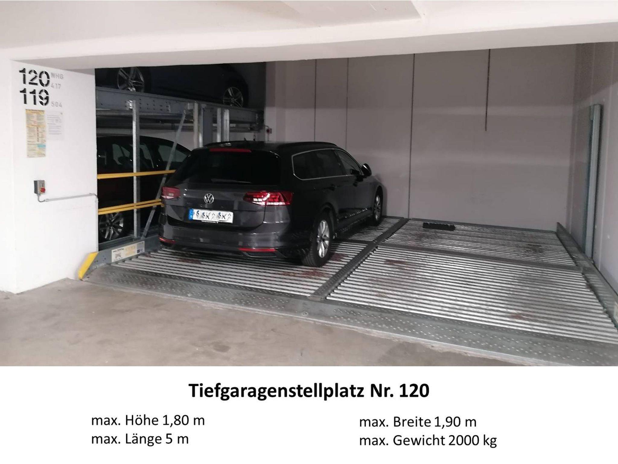 Zur Wohnung gehört ein Tiefgaragenstellplatz mit der Stellplatznummer 120. Dabei handelt es sich um eine Doppelparkanlage (Standardanlage bei Stellplatzbreite 2,30 m). Bitte beachten Sie, dass Ihr Pkw folgende Angaben nicht überschreitet.: