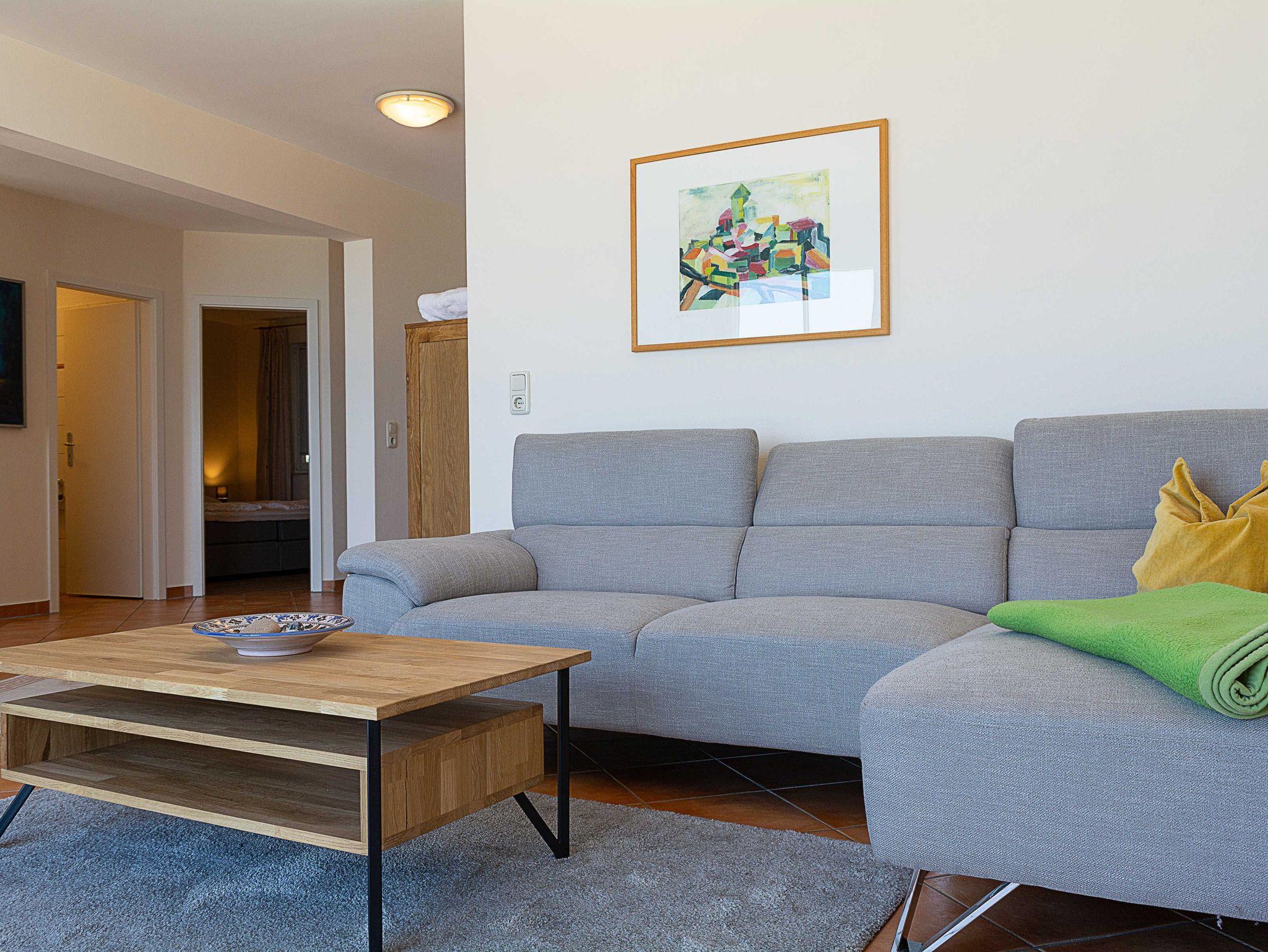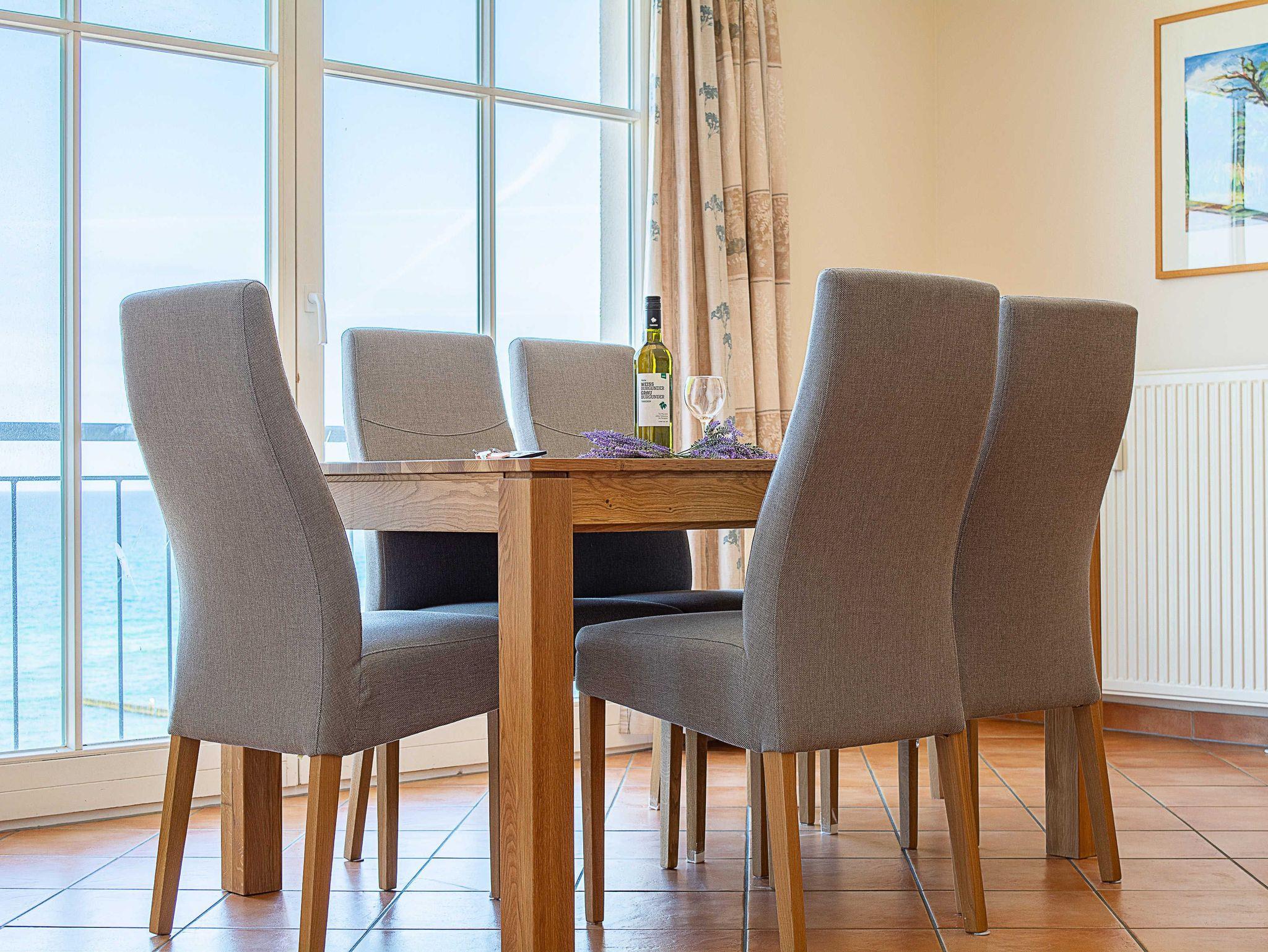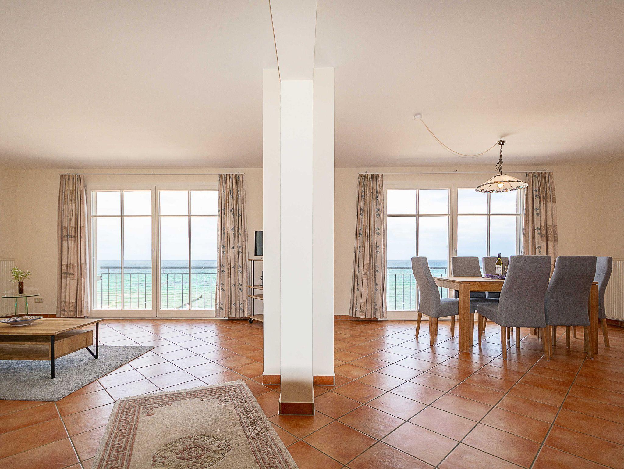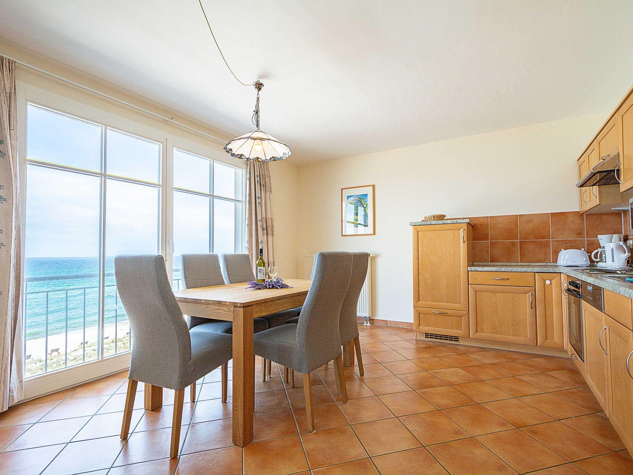 Der lichtdurchflutete Wohn- und Essbereich bietet dank der großen Fensterfront einen atemberaubenden Ausblick auf das Meer. Entspannen Sie sich auf der modernen Wohncouch oder lassen Sie sich von einem Flatscreen-TV und Radio unterhalten. Vom rustikalen Echtholz-Esstisch aus, an dem 6 Personen Platz finden, können Sie nicht nur gemeinsam speisen, sondern auch die wunderschöne Aussicht auf Strand und Promenade genießen.