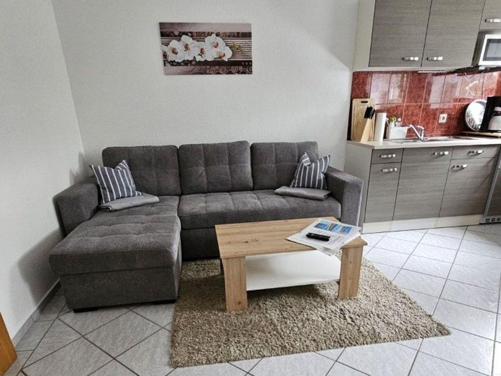 - Wohn/Schlafbereich mit Schlafcouch, integrierter Küche und Essbereich