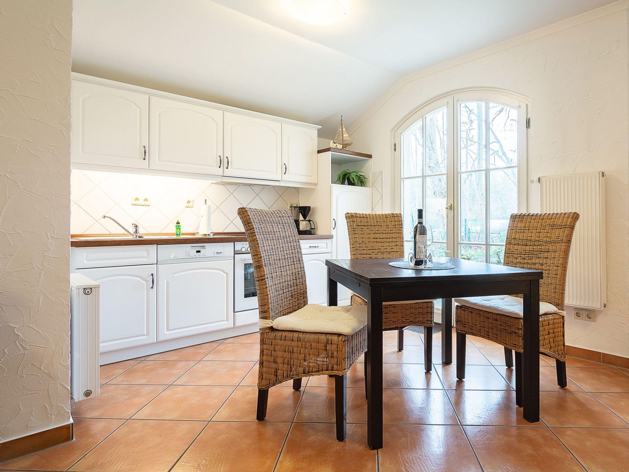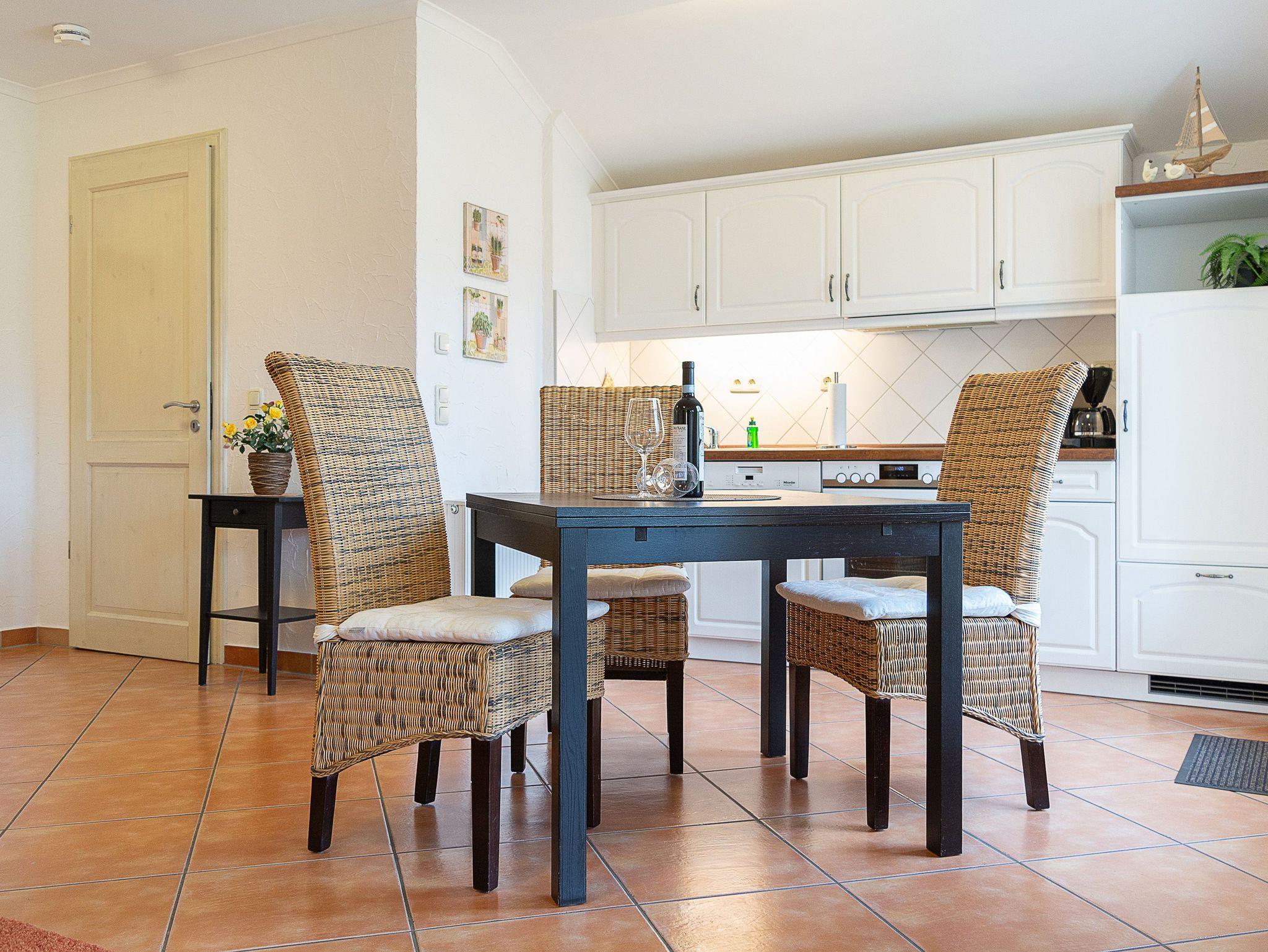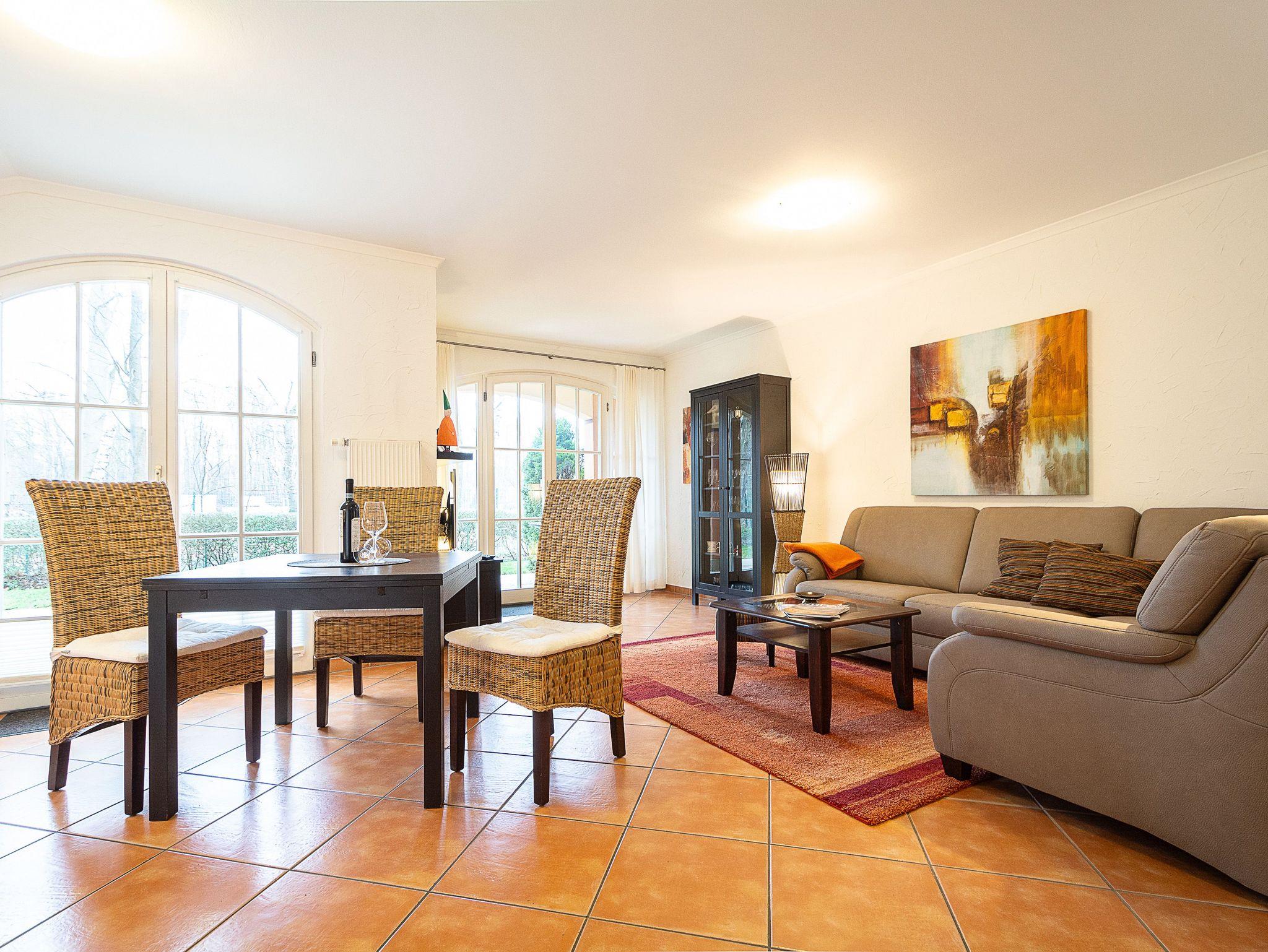 Die 54 m² große 2-Raum-Wohnung befindet sich im Erdgeschoss und wurde mit viel Liebe zum Detail eingerichtet. Der Wohnraum ist ausgestattet mit einer gemütlichen Sitzecke und Schlafcouch, Essplatz, 32 Flat-TV, CD-Stereoanlage mit IPod-Anschluss und Küchenzeile (Geschirrspüler, Herd mit Backofen, Kaffeemaschine etc.). Vom Wohnzimmer erreichen Sie die Südwest-Terrasse mit kleiner Grünfläche und idyllischen Blick auf den Kühlungsborner Stadtwald. Im Schlafzimmer mit Doppelbett befindet sich ein Kleiderschrank, der genügend Platz für Ihre Urlaubsgarderobe bietet. Alle Räume sind mit mediterranen Fliesen versehen. Das großzügige Bad mit zwei Waschbecken und großer Dusche und WC sowie einem Handtuchwärmer vervollständigt das Gesamtbild dieser Wohnung.