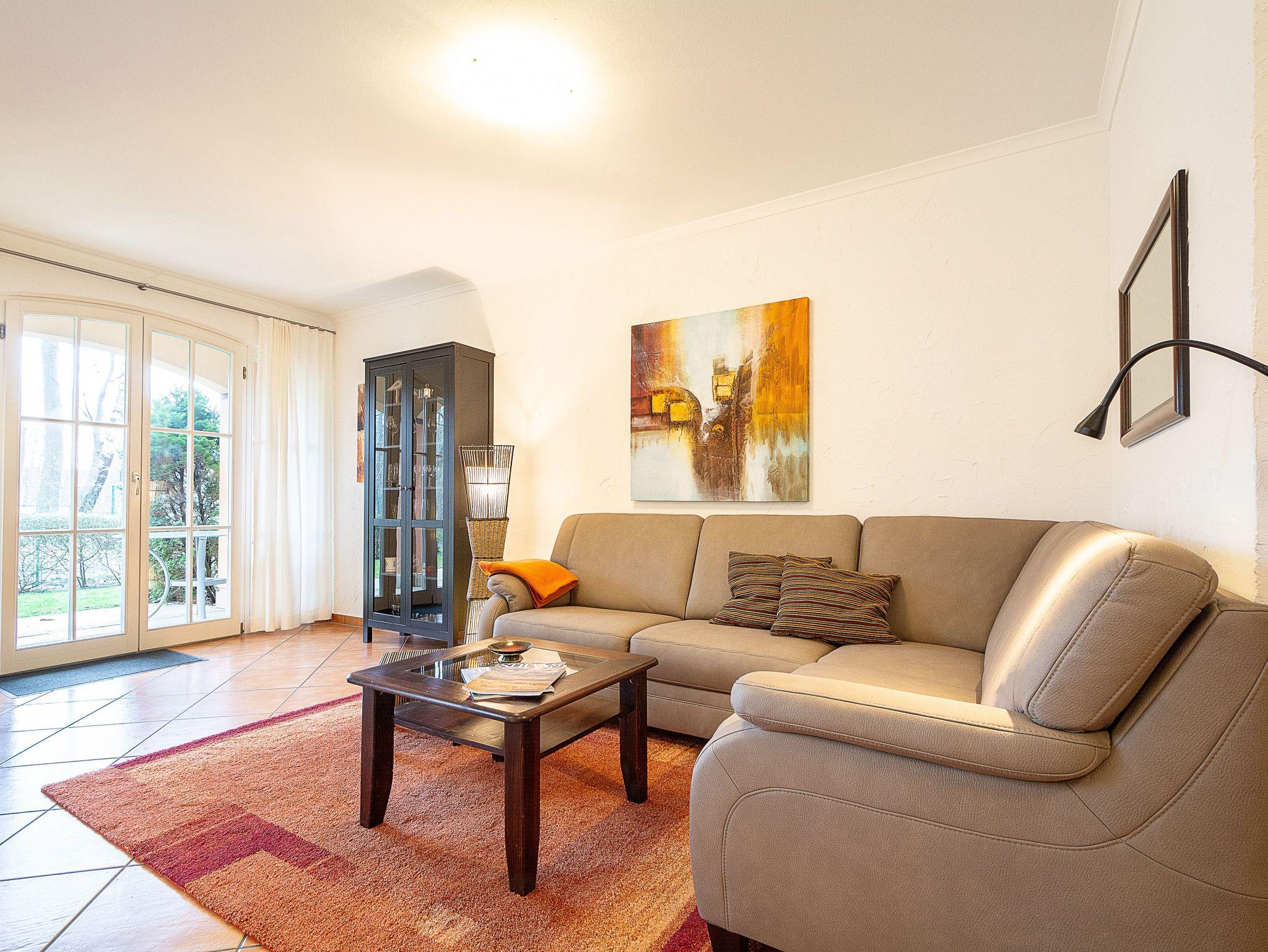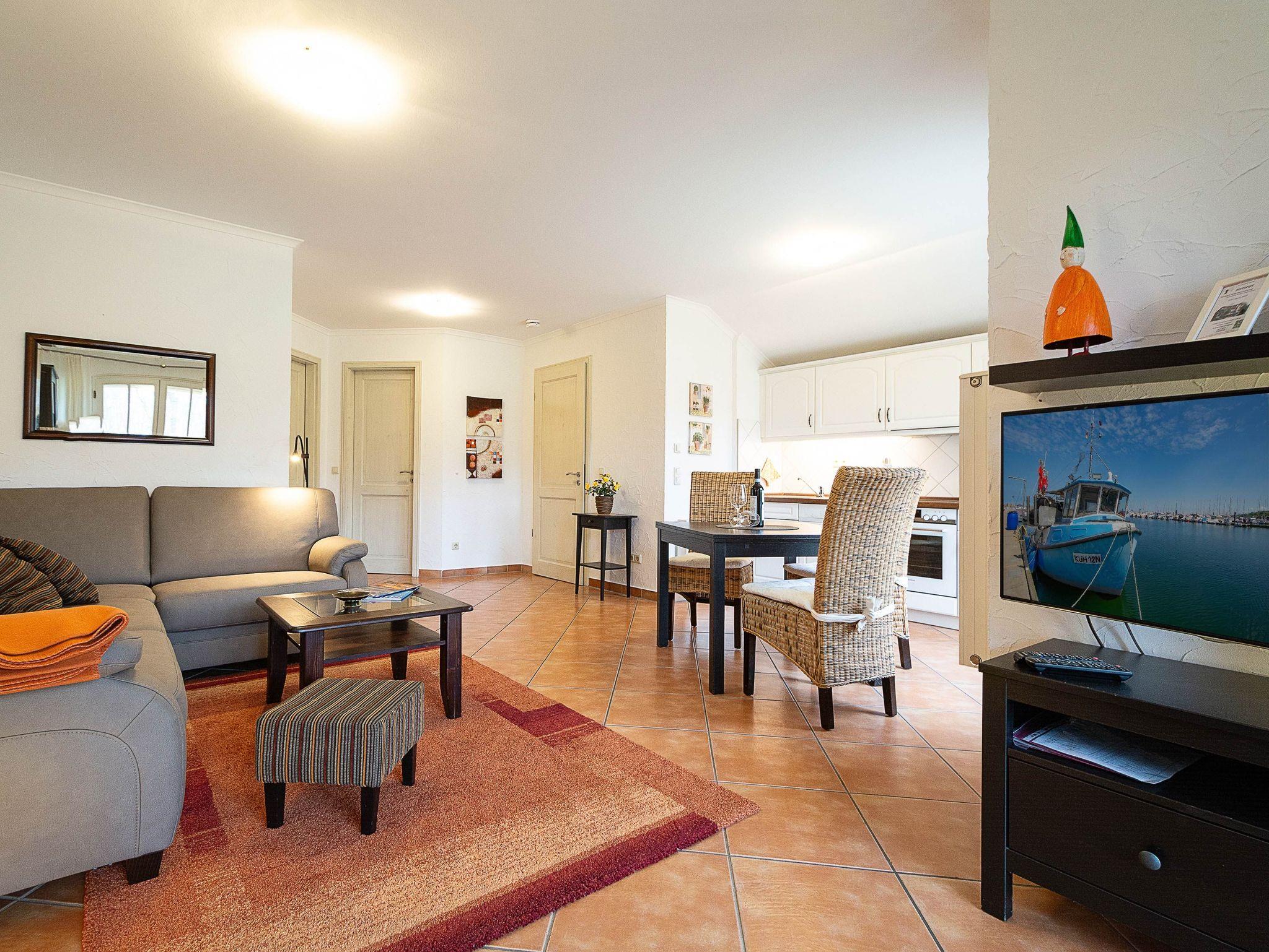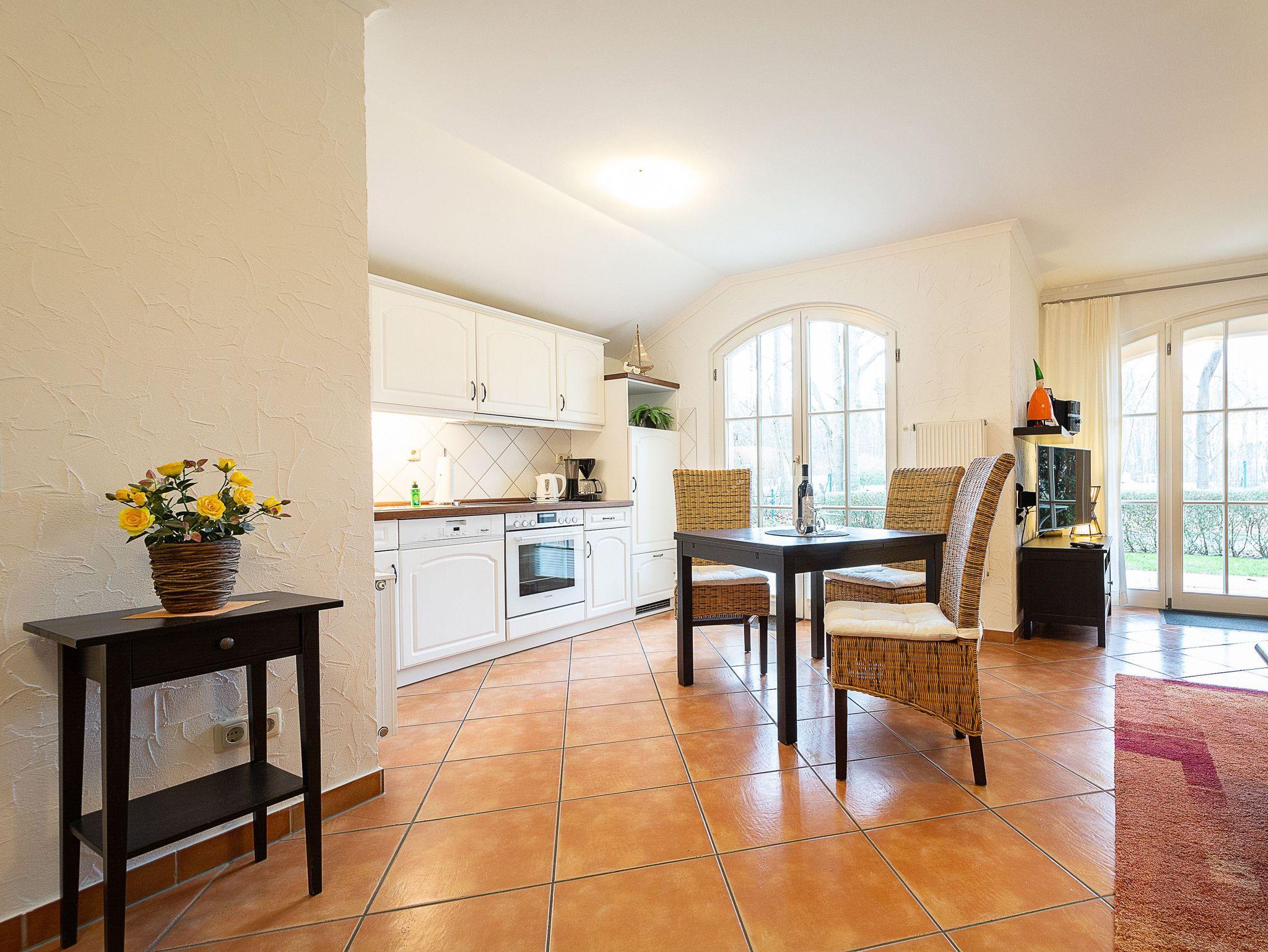 Die 54 m² große 2-Raum-Wohnung befindet sich im Erdgeschoss und wurde mit viel Liebe zum Detail eingerichtet. Der Wohnraum ist ausgestattet mit einer gemütlichen Sitzecke und Schlafcouch, Essplatz, 32 Flat-TV, CD-Stereoanlage mit IPod-Anschluss und Küchenzeile (Geschirrspüler, Herd mit Backofen, Kaffeemaschine etc.). Vom Wohnzimmer erreichen Sie die Südwest-Terrasse mit kleiner Grünfläche und idyllischen Blick auf den Kühlungsborner Stadtwald. Im Schlafzimmer mit Doppelbett befindet sich ein Kleiderschrank, der genügend Platz für Ihre Urlaubsgarderobe bietet. Alle Räume sind mit mediterranen Fliesen versehen. Das großzügige Bad mit zwei Waschbecken und großer Dusche und WC sowie einem Handtuchwärmer vervollständigt das Gesamtbild dieser Wohnung.