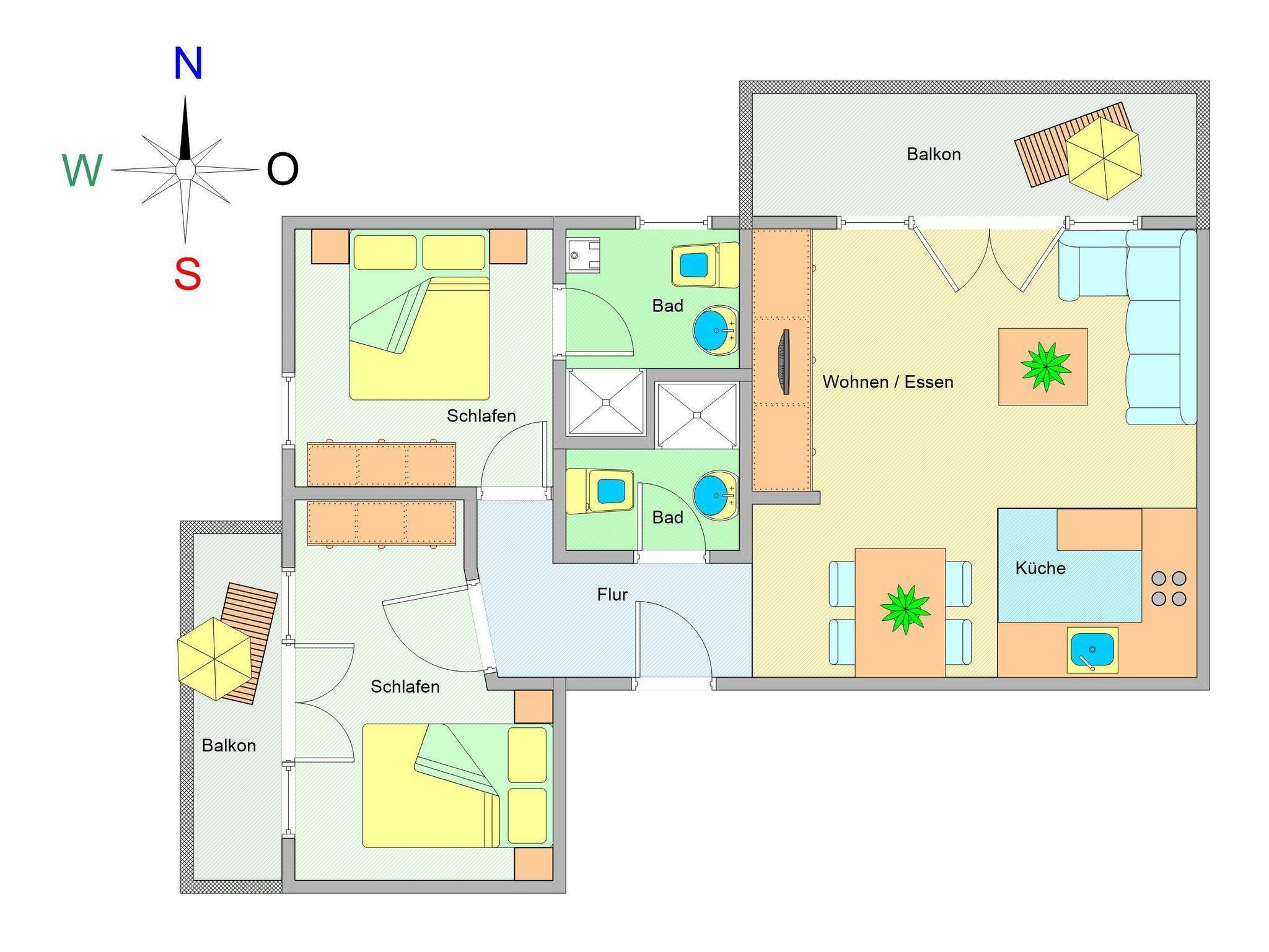 Diese liebevoll eingerichtete 3-Raum-Ferienwohnung liegt im 2. Obergeschoss der Residenz Seestern und bietet auf rund 70 m² alles für einen komfortablen Urlaub. Sie verfügt über zwei Schlafzimmer, zwei vollwertige Bäder, zwei Balkone sowie einen hellen Wohn-/Essbereich und eine voll ausgestattete Küche.