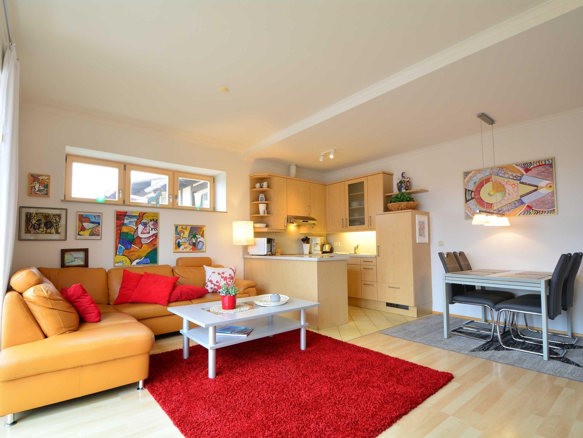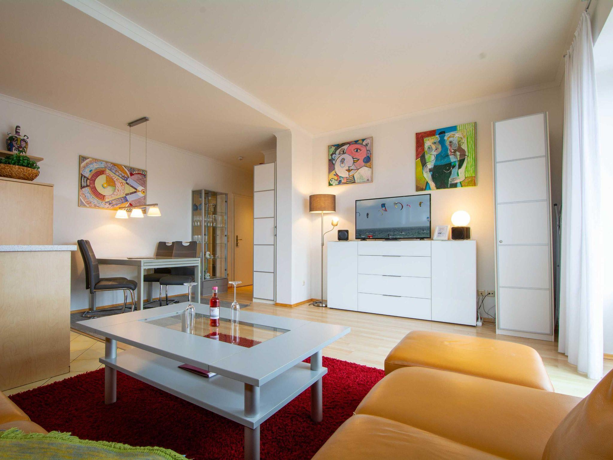 Der helle, offen gestaltete Wohnbereich überzeugt durch seinen besonderen Stil mit farbenfrohen Bildern und gemütlicher Couchgarnitur. Ein moderner 50-Zoll-Flachbild-TV sorgt für beste Unterhaltung. Vom Wohnbereich gelangen Sie direkt auf den nach Norden ausgerichteten Balkon, der zum Entspannen einlädt. Der Essbereich ist harmonisch integriert und bietet Platz für gemeinsame Mahlzeiten.