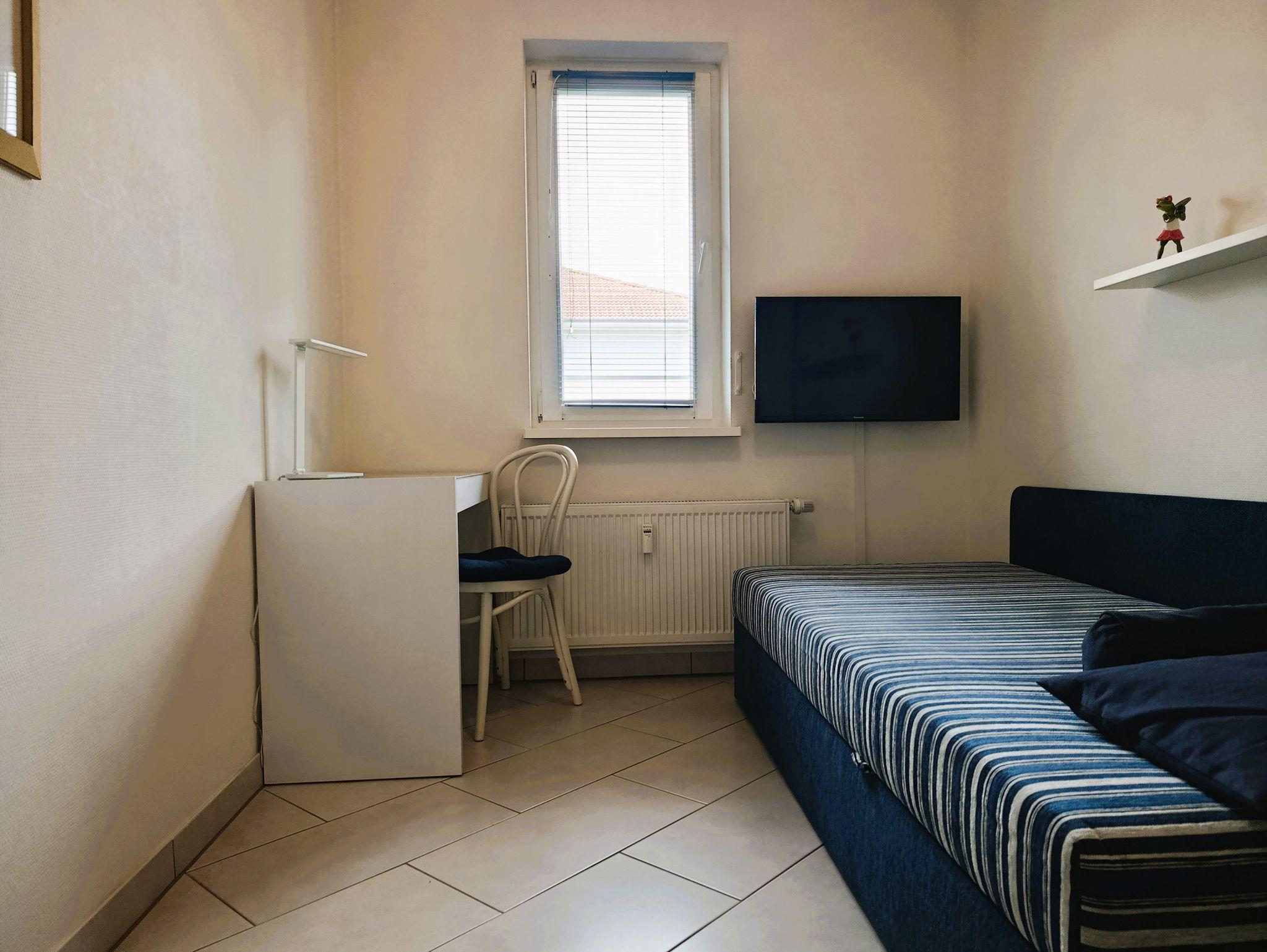 Gästezimmer mit Liege, kleinen Schreibtisch und Kofferbank