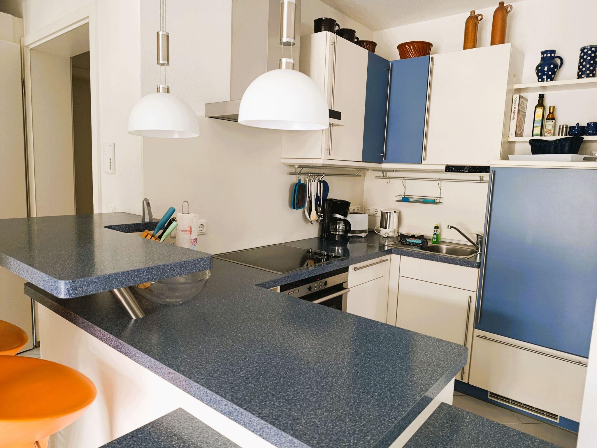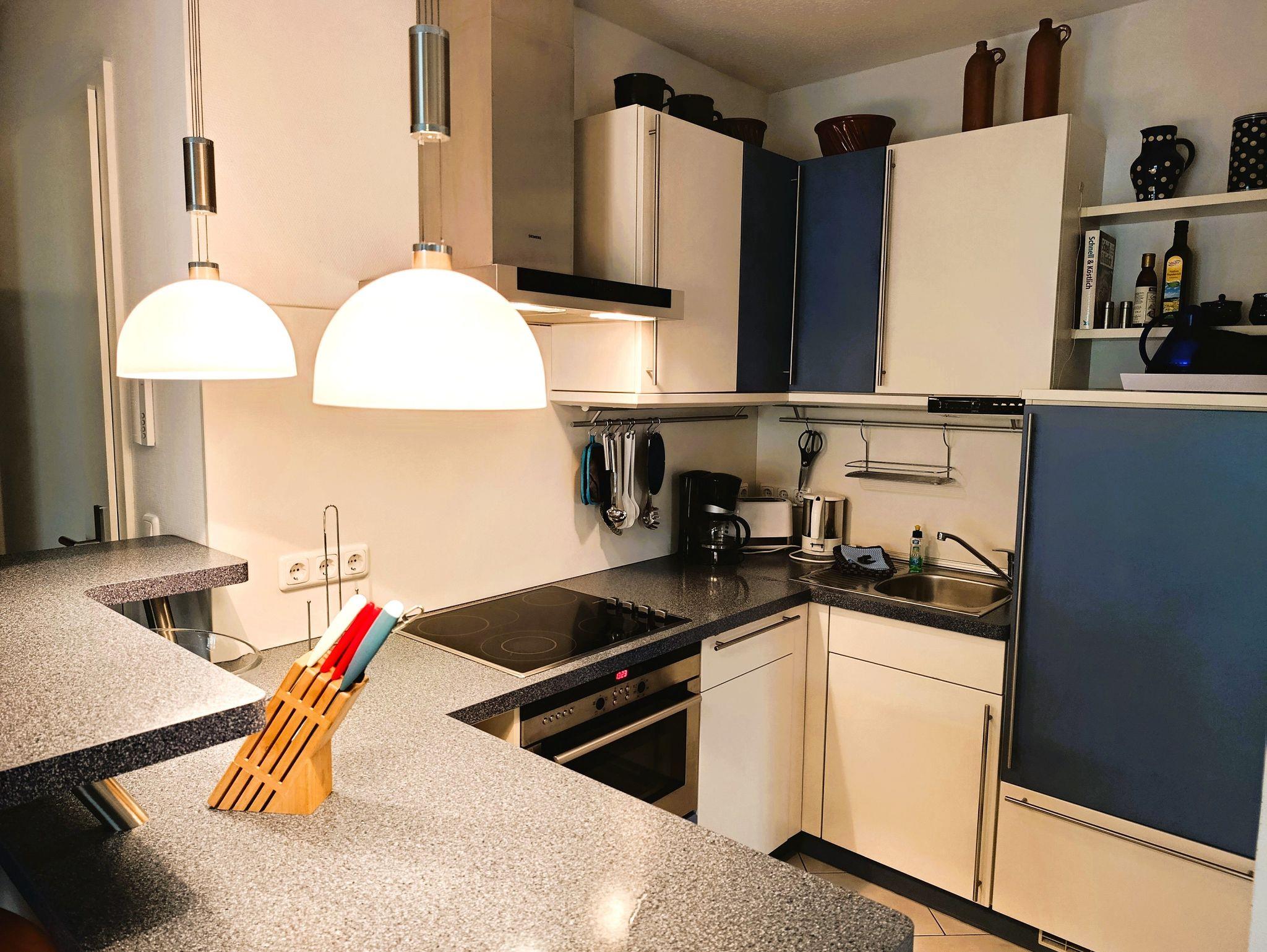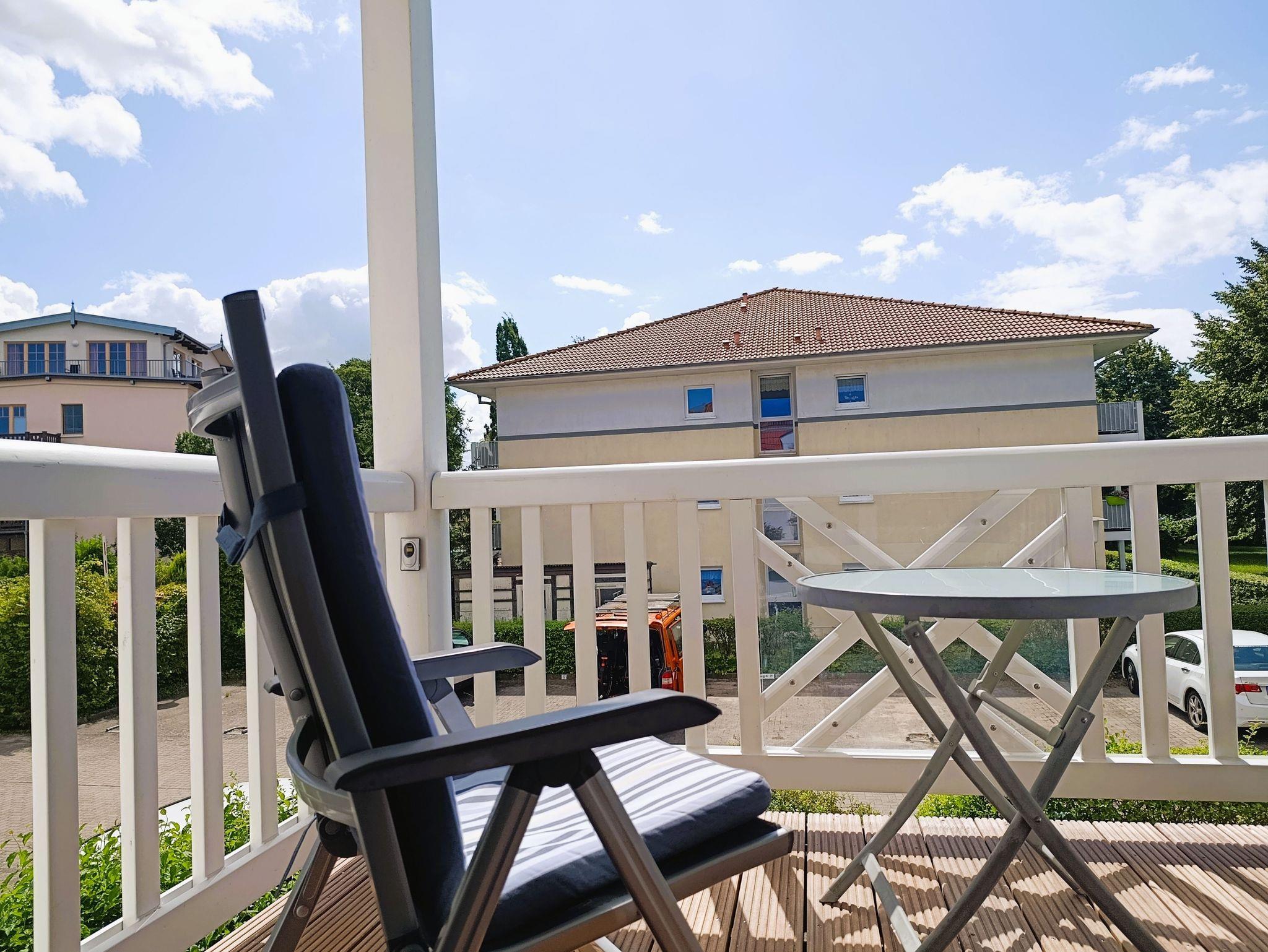 Moderne 3-Raum-Ferienwohnung in Kühlungsborn, nur 100 m von der Ostsee entfernt, mit Balkon und voll ausgestatteter Küche.