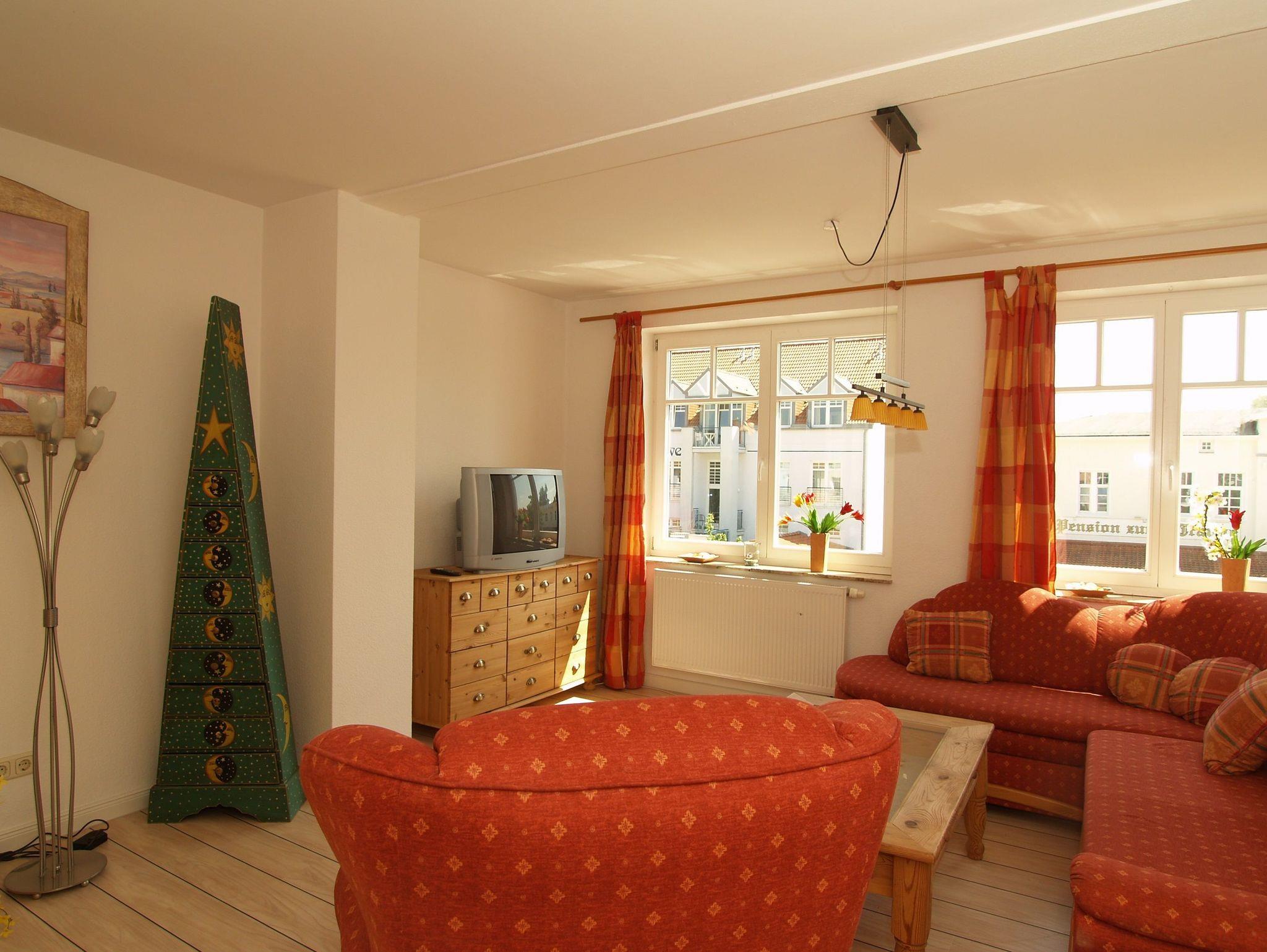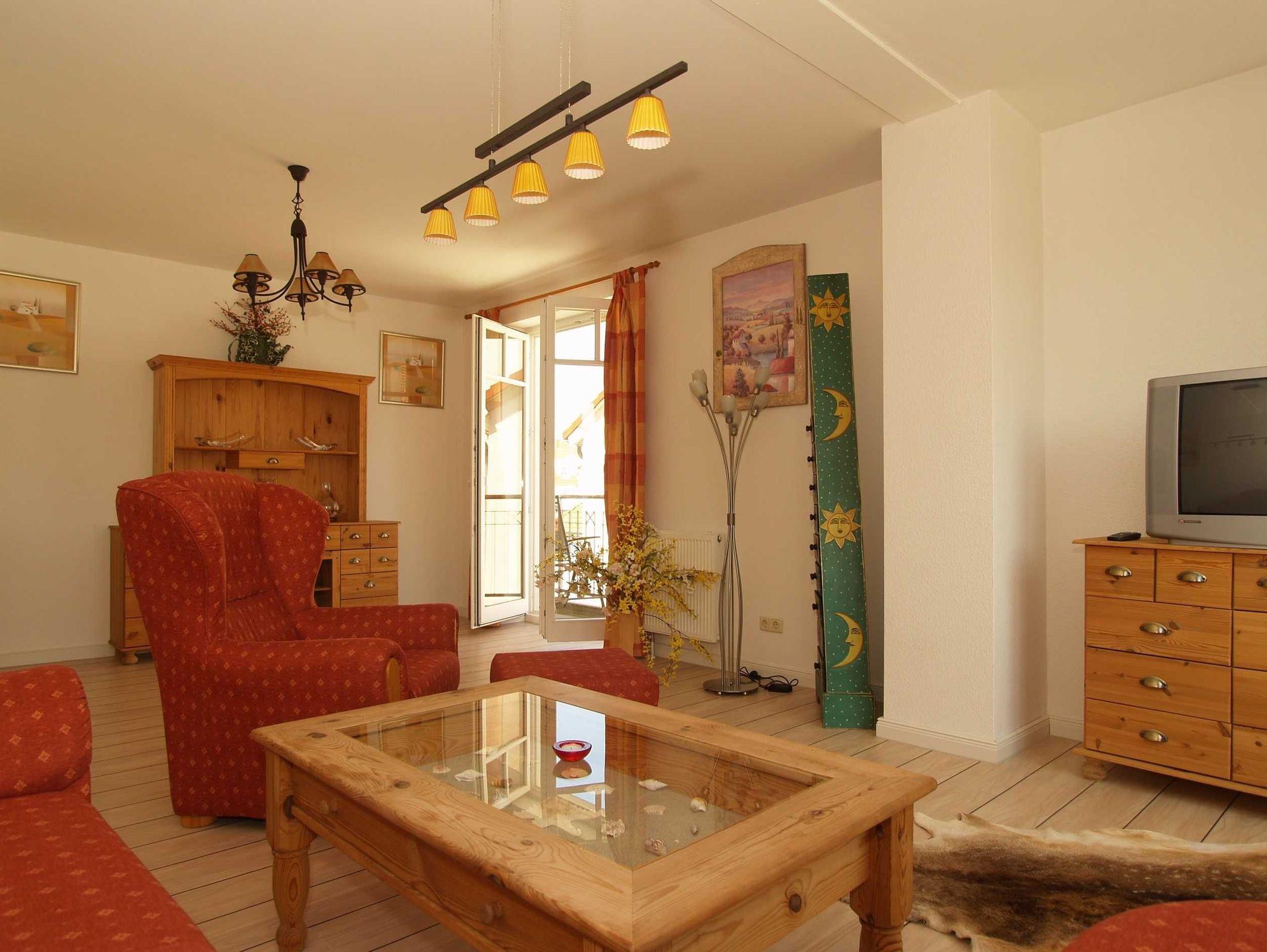 Herzlich willkommen in der Whg. Nr. 08 im Haus Hamburg in der Strandstraße 40. Sie wohnen in einer komfortabel eingerichteten 2-Raum-Ferienwohnung von ca. 45 m² Größe, die sich im zweiten Obergeschoss des Hauses befindet. Es empfängt Sie ein helles gemütliches Wohnzimmer mit einer bequemen Sitzgruppe mit Schlafcouch (ausziehbar 140 cm breit), einem Essplatz sowie einer Stereoanlage und einem 42-Zoll-Flachbild-TV. Von hier betreten Sie den nach Norden ausgerichteten Balkon, der zum Verweilen einlädt.