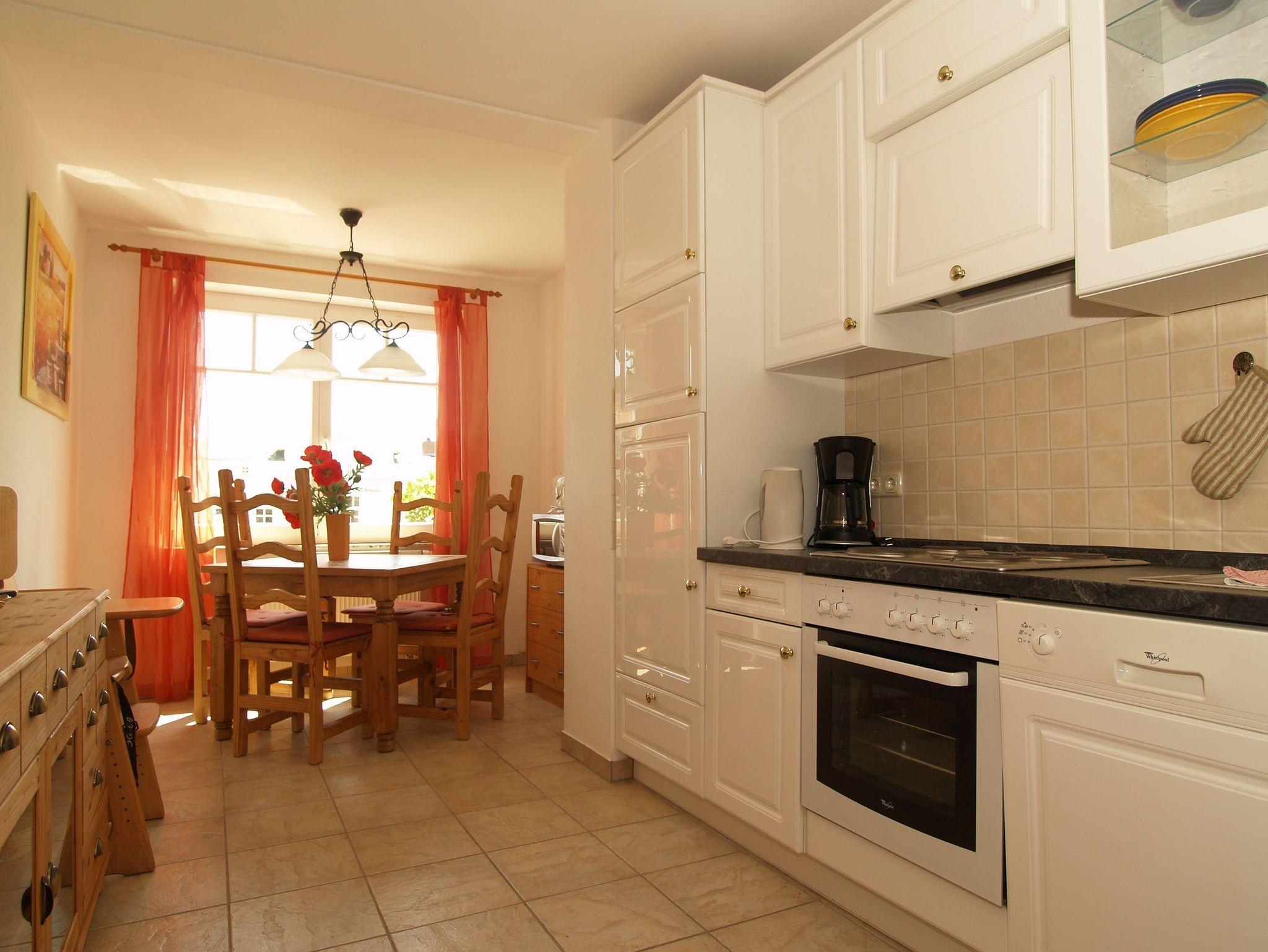 Die separate Küche erreichen Sie über den Wohnflur. Sie ist eingerichtet mit allen wichtigen Küchengeräten und -utensilien, die Sie benötigen. Ein 4-Platten-Herd mit Backofen, ein Geschirrspüler, eine Mikrowelle sowie ein Kühlschrank mit Gefrierfach sind vorhanden. Eine Kaffeemaschine, ein Wasserkocher, ein Toaster sowie ein Esstisch komplettieren die Kücheneinrichtung.