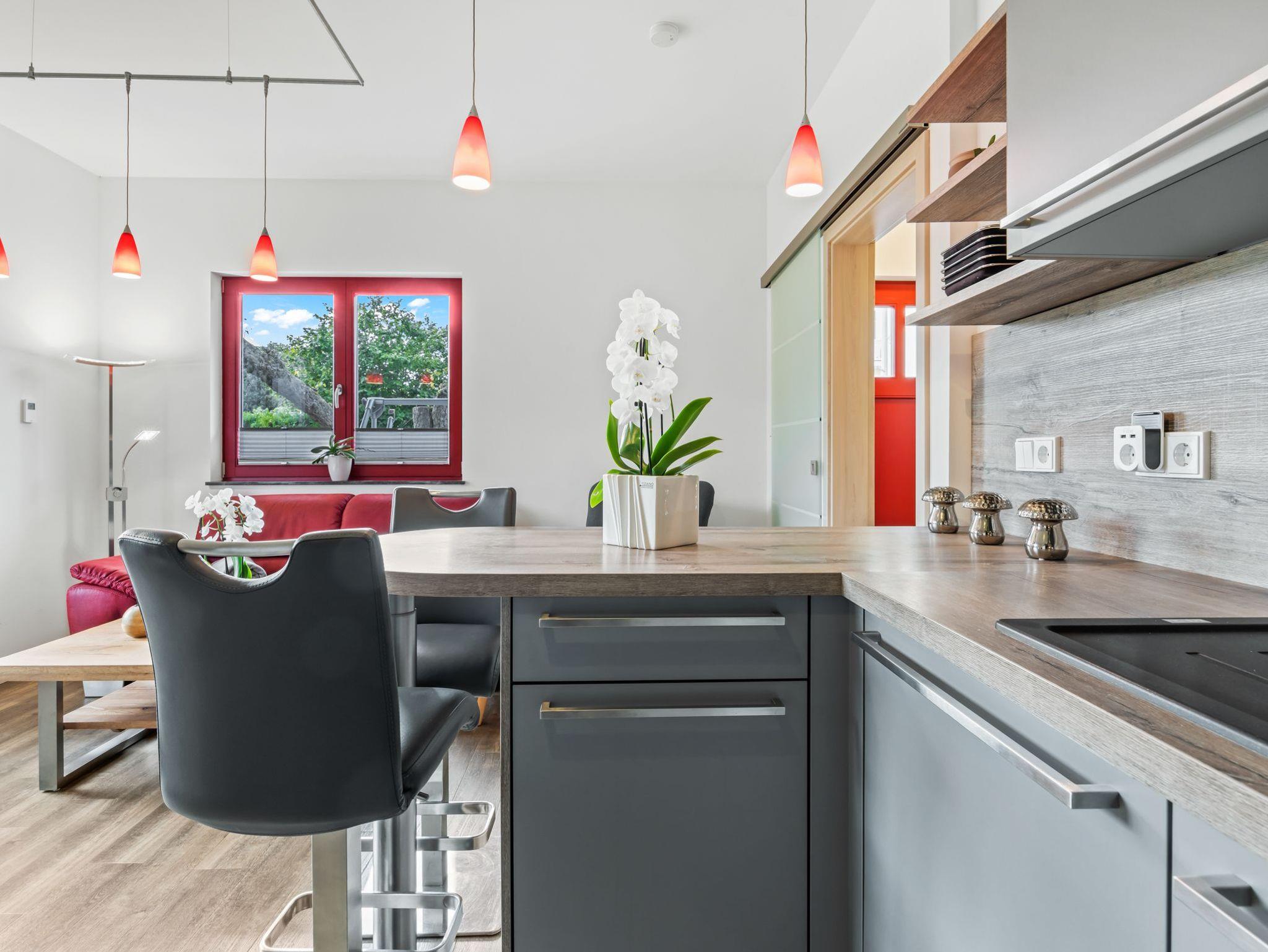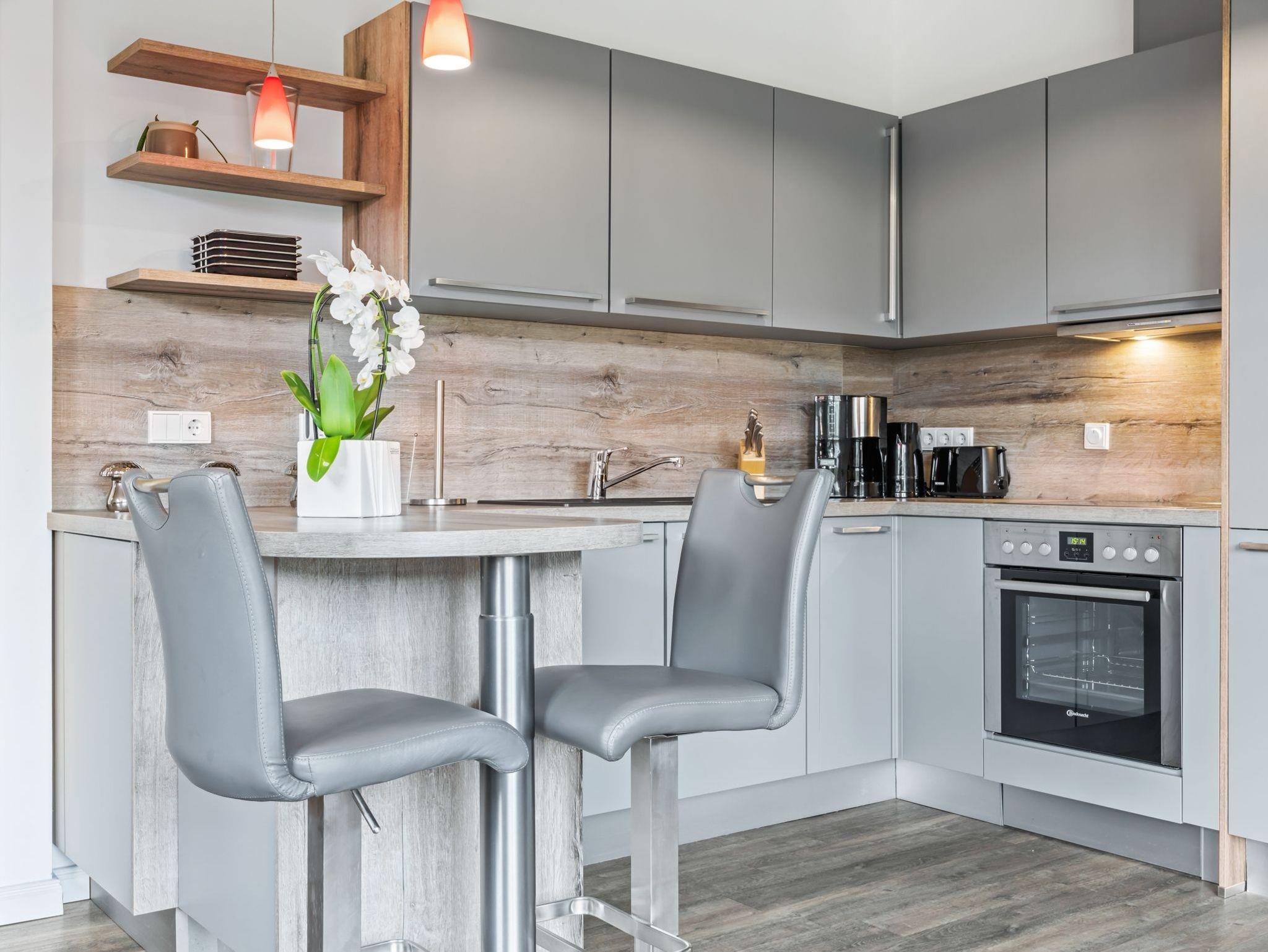 Der offene Küchenbereich ist geschmackvoll und umfangreich ausgestattet. Die Küche verfügt über einen 4- Platten- Herd, Backofen, Kaffeemaschine, Wasserkocher, Toaster, Geschirrspüler und sonstige Küchenutensilien.