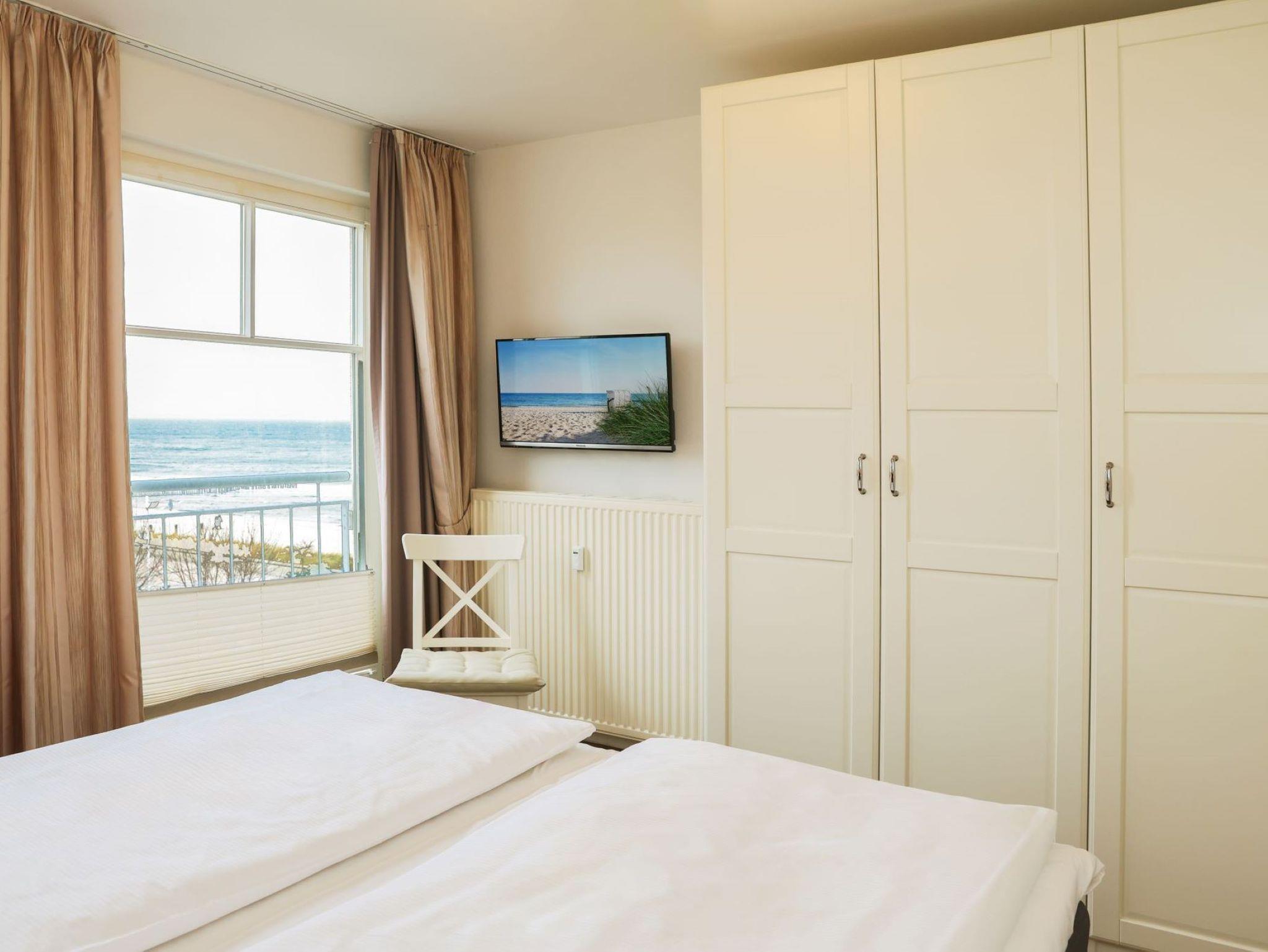 Nur 10 m vom Strand wohnen Sie in einer modern eingerichteten 3-Raum-Ferienwohnung. Die 60 qm große Wohnung liegt in der 4. Etage. Das Wohnzimmer ist mit einer Schlafcouch, Couchtisch, zwei Sessel, Anrichte, Kabel-TV, Radio, Essbereich (Esstisch und 4 Stühle) und Küchenzeile ausgestattet. Das französische Fenster bietet einen freien Blick auf die Ostsee. Im Schlafzimmer stehen ein Doppelbett und ein Kleiderschrank und im Gästezimmer ein Ausziehbares Bett und ein Wäscheschrank. Die Küchenzeile wurde modern ausgestattet mit Mikrowelle, Kühlschrank, Kaffeemaschine, Zweiplattenkochfeld, Geschirrspüler, Toaster und Wasserkocher. Das Bad mit Dusche/WC und der Flur mit Garderobe komplettieren die Wohnung.