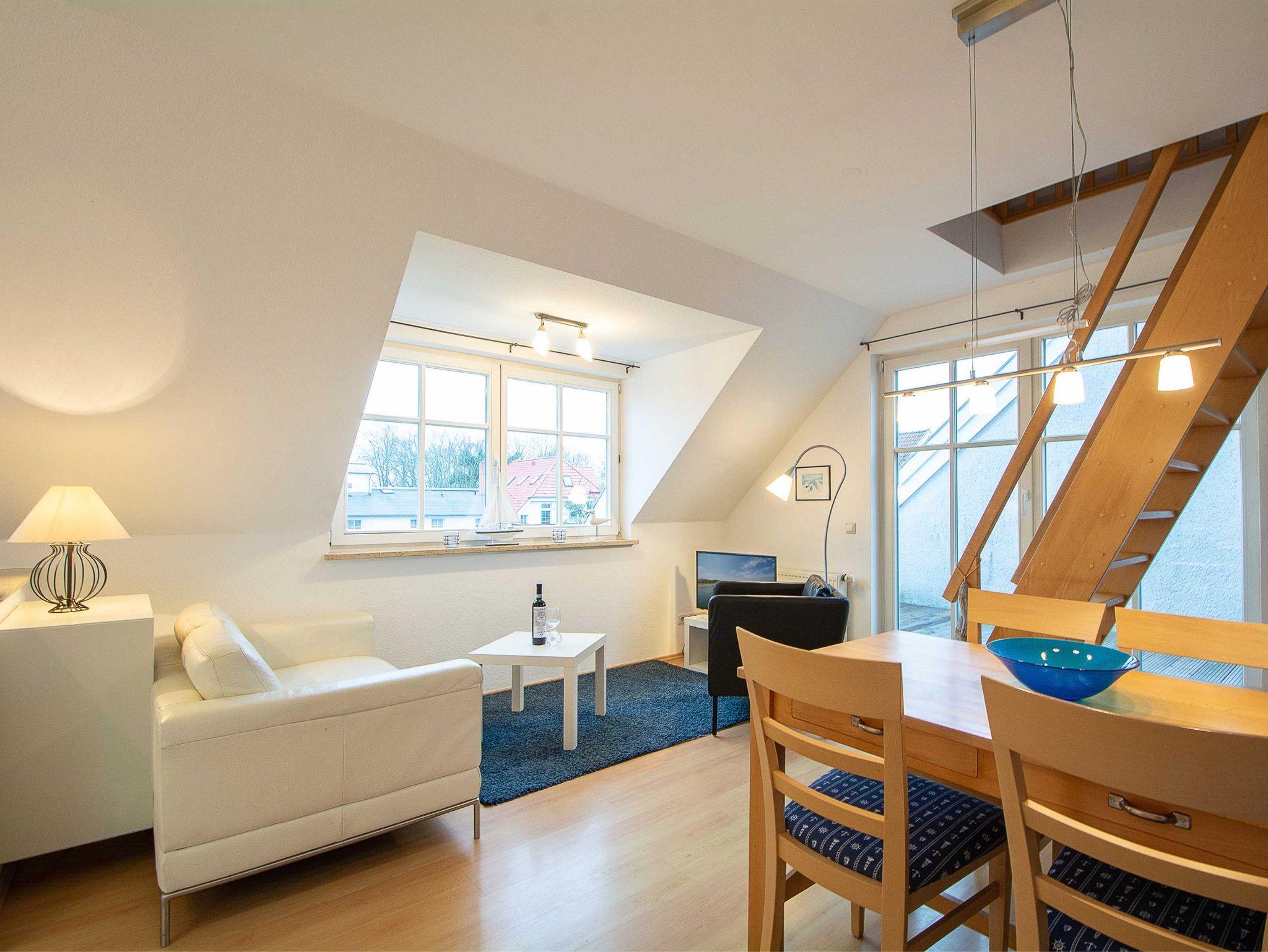 Die helle und freundliche Maisonette-Ferienwohnung von 60 qm Größe ist für bis zu 5 Personen eingerichtet und befindet sich im zweiten Obergeschoss. Der offene und helle Wohnraum empfängt Sie mit einer gemütlichen Couchgarnitur, 31-Zoll-Flatscreen-TV und Musikanlage sowie einem Esstisch. Von hier betreten Sie den möblierten West-Balkon.