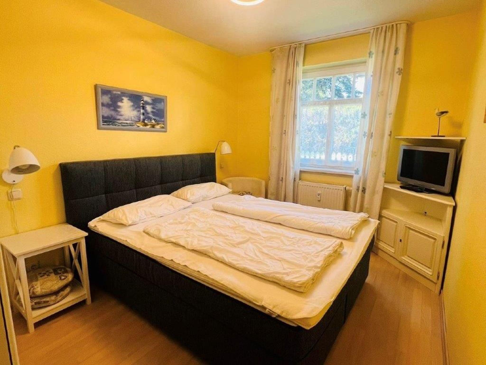 - 1 Schlafzimmer mit Boxspringbett, Kleiderschrank und TV