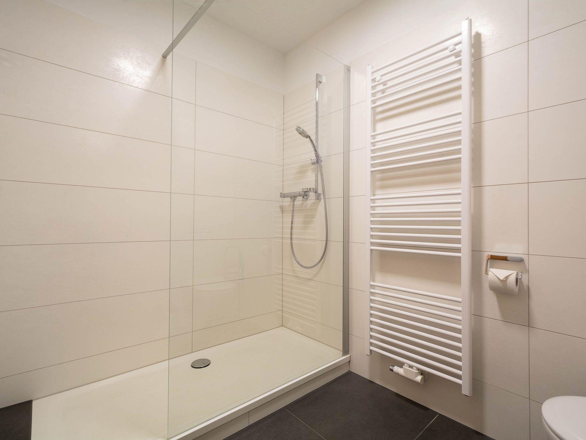 Das moderne Bad verfügt über eine ebenerdige Dusche, WC, Handtuchheizung und Haarföhn.