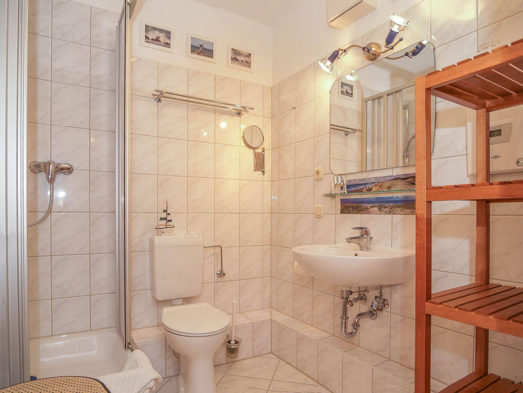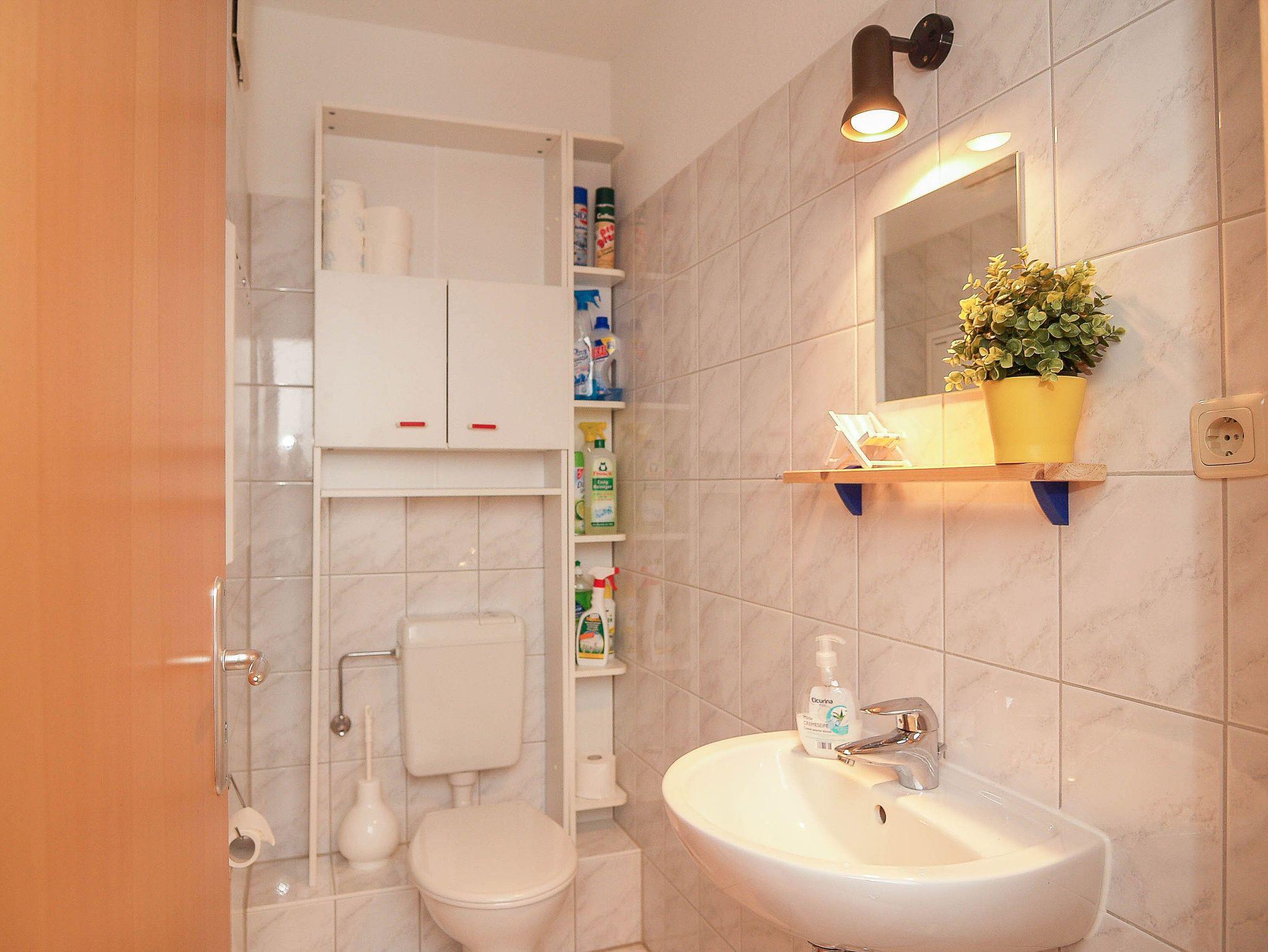 Das geflieste Bad mit einer Dusche, Waschbecken und WC sowie ein zusätzliches Gäste-WC vervollständigen das Gesamtbild dieser Wohnung.