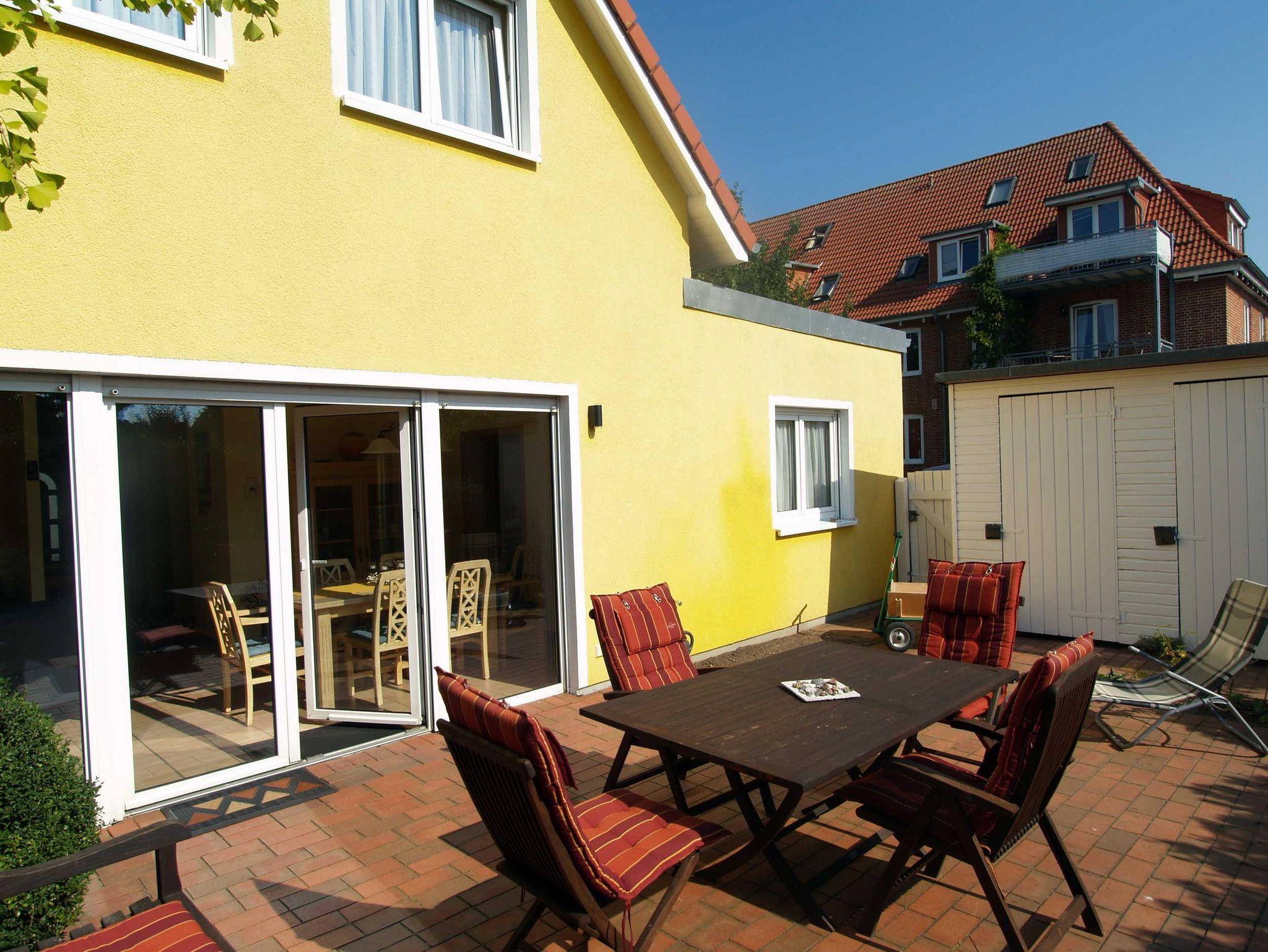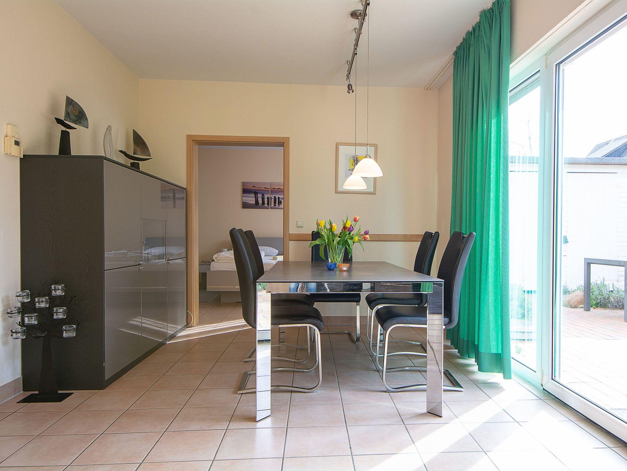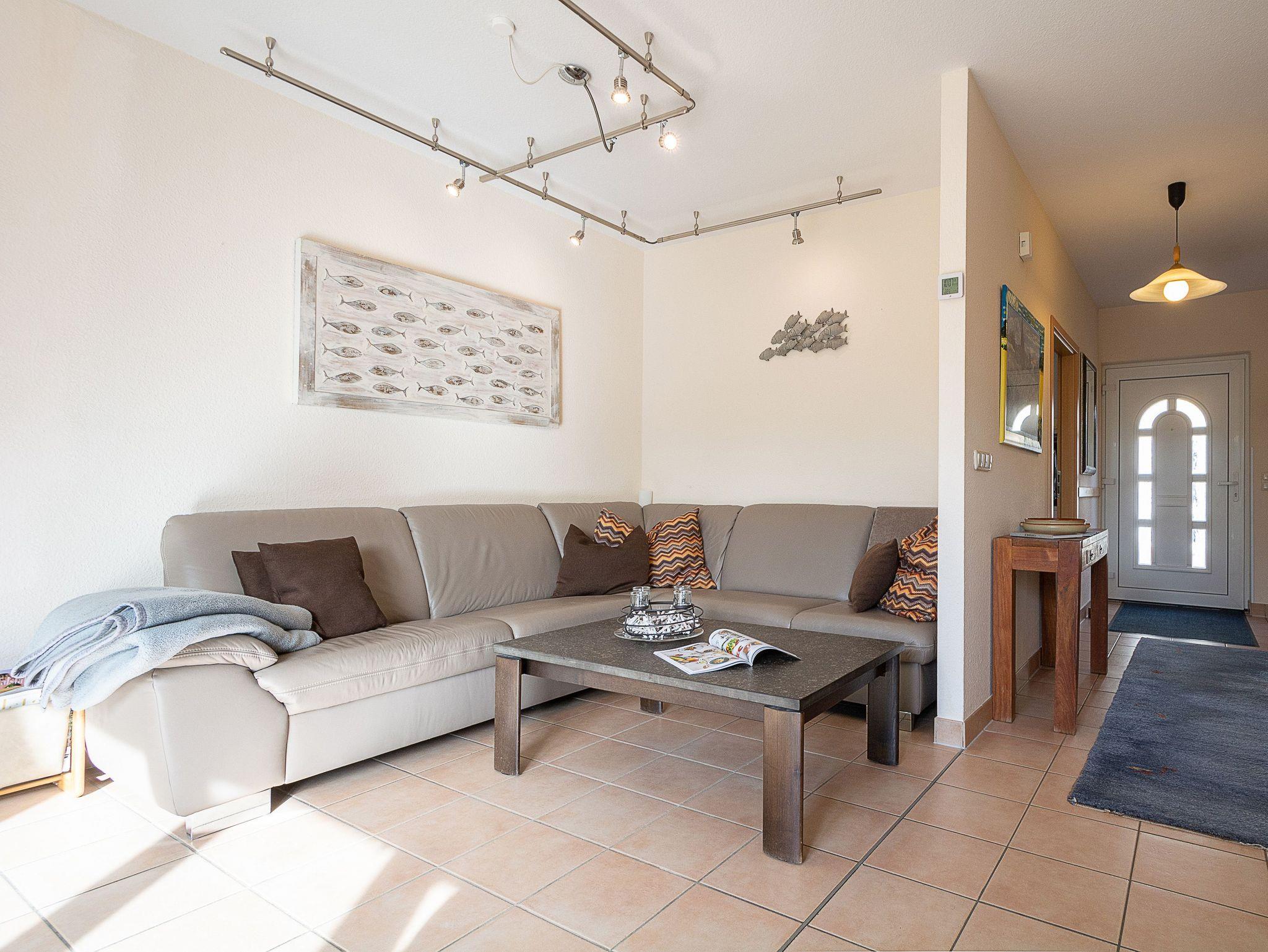 Der liebevoll eingerichtete Wohnbereich ist mit einer gemütlichen Couchgarnitur und Flatscreen-TV eingerichtet. Der angrenzende Essbereich bietet Ihnen reichlich Platz für gemeinsame Mahlzeiten. Vom Wohnbereich gelangen Sie auf die große möblierte Südterrasse. Hier können Sie Sonne tanken, relaxen und den Abend nach einem schönen Tag am Meer ausklingen lassen. Alle Türen im Erdgeschoss sind breit genug, um mit einem Rollstuhl bequem hindurch zu fahren.