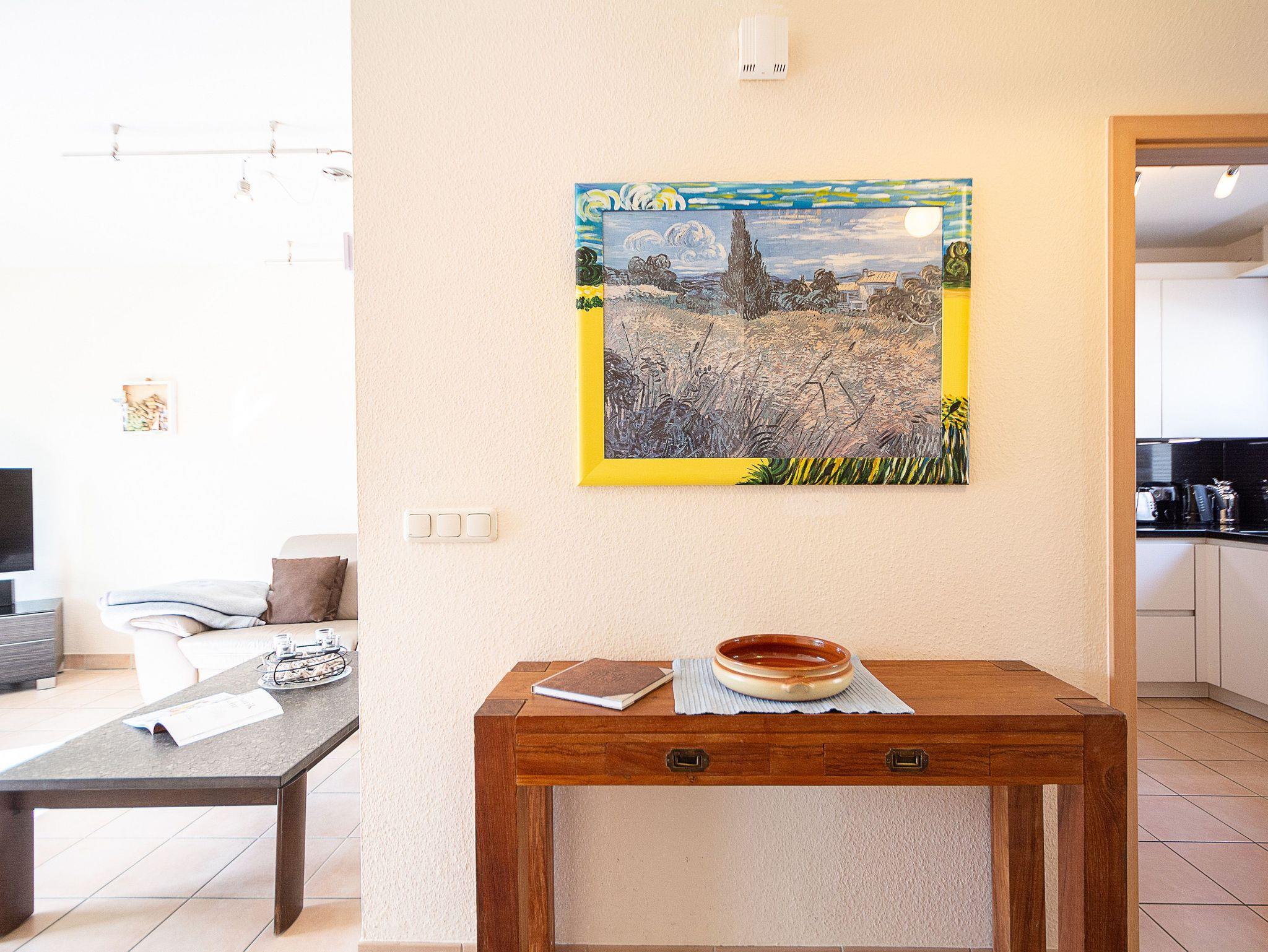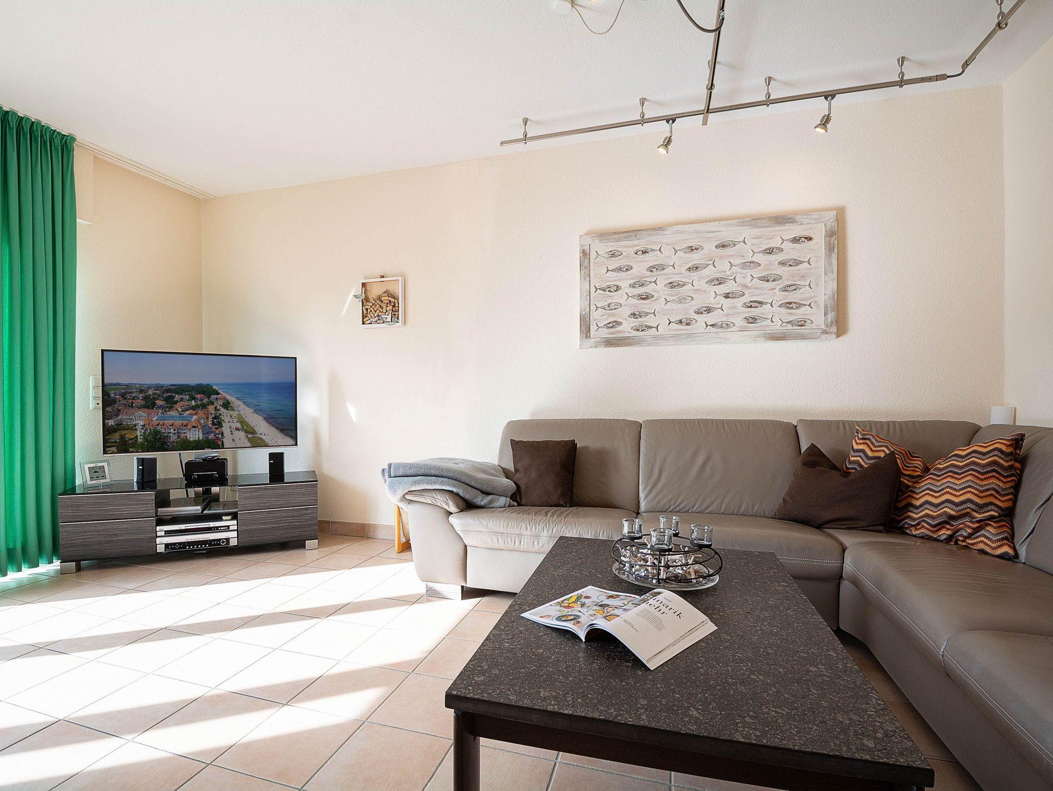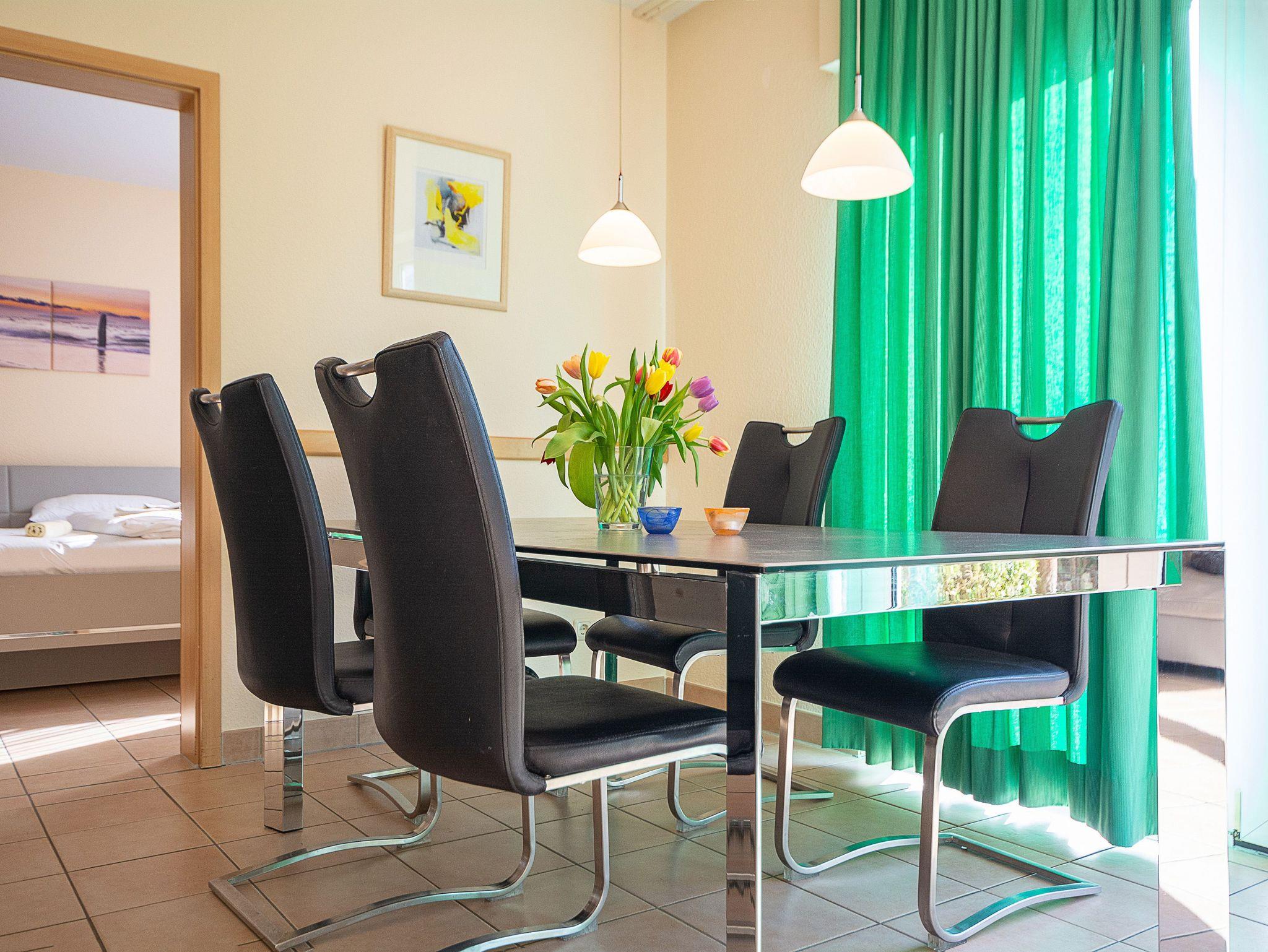 Der liebevoll eingerichtete Wohnbereich ist mit einer gemütlichen Couchgarnitur und Flatscreen-TV eingerichtet. Der angrenzende Essbereich bietet Ihnen reichlich Platz für gemeinsame Mahlzeiten. Vom Wohnbereich gelangen Sie auf die große möblierte Südterrasse. Hier können Sie Sonne tanken, relaxen und den Abend nach einem schönen Tag am Meer ausklingen lassen. Alle Türen im Erdgeschoss sind breit genug, um mit einem Rollstuhl bequem hindurch zu fahren.