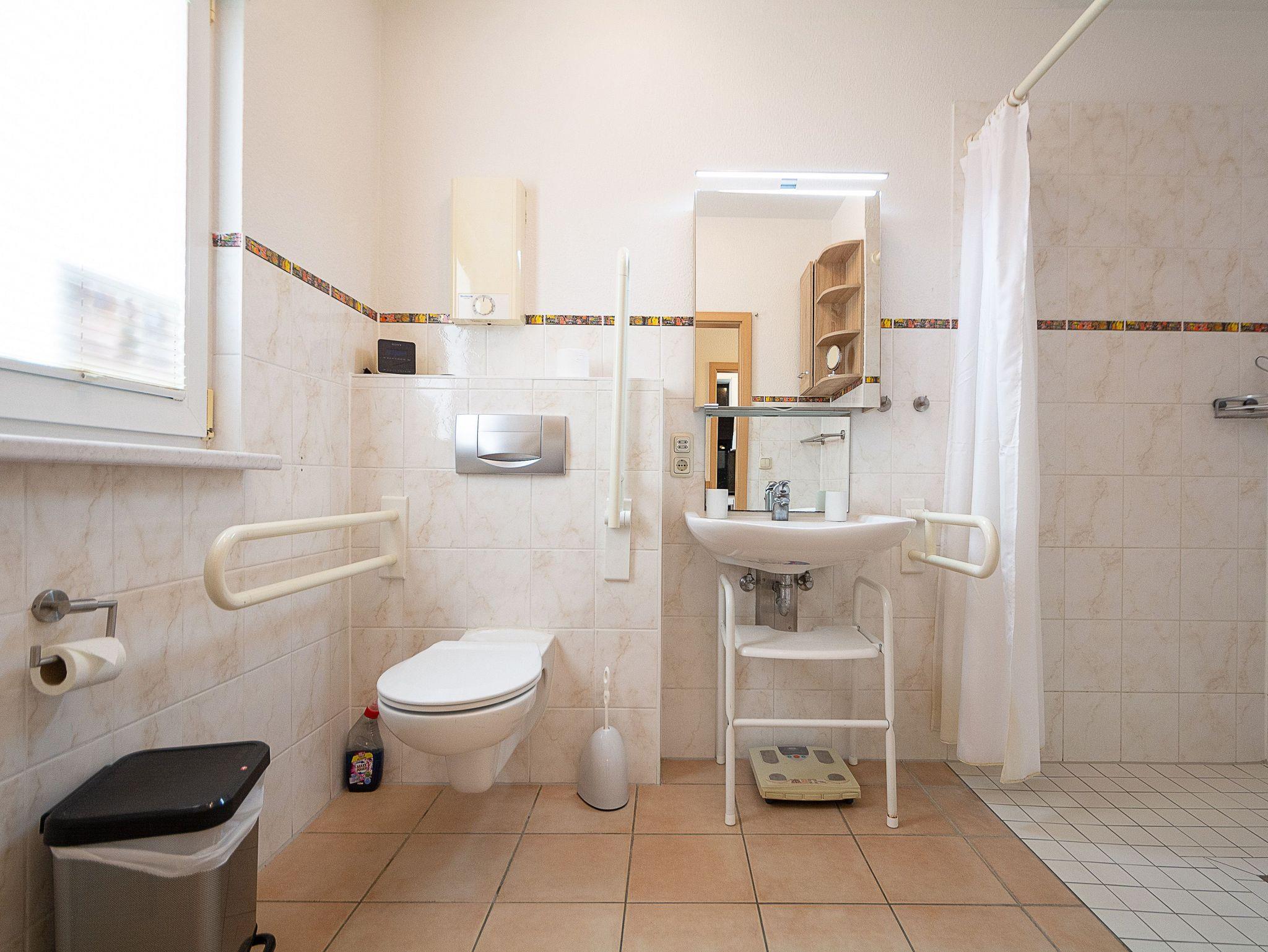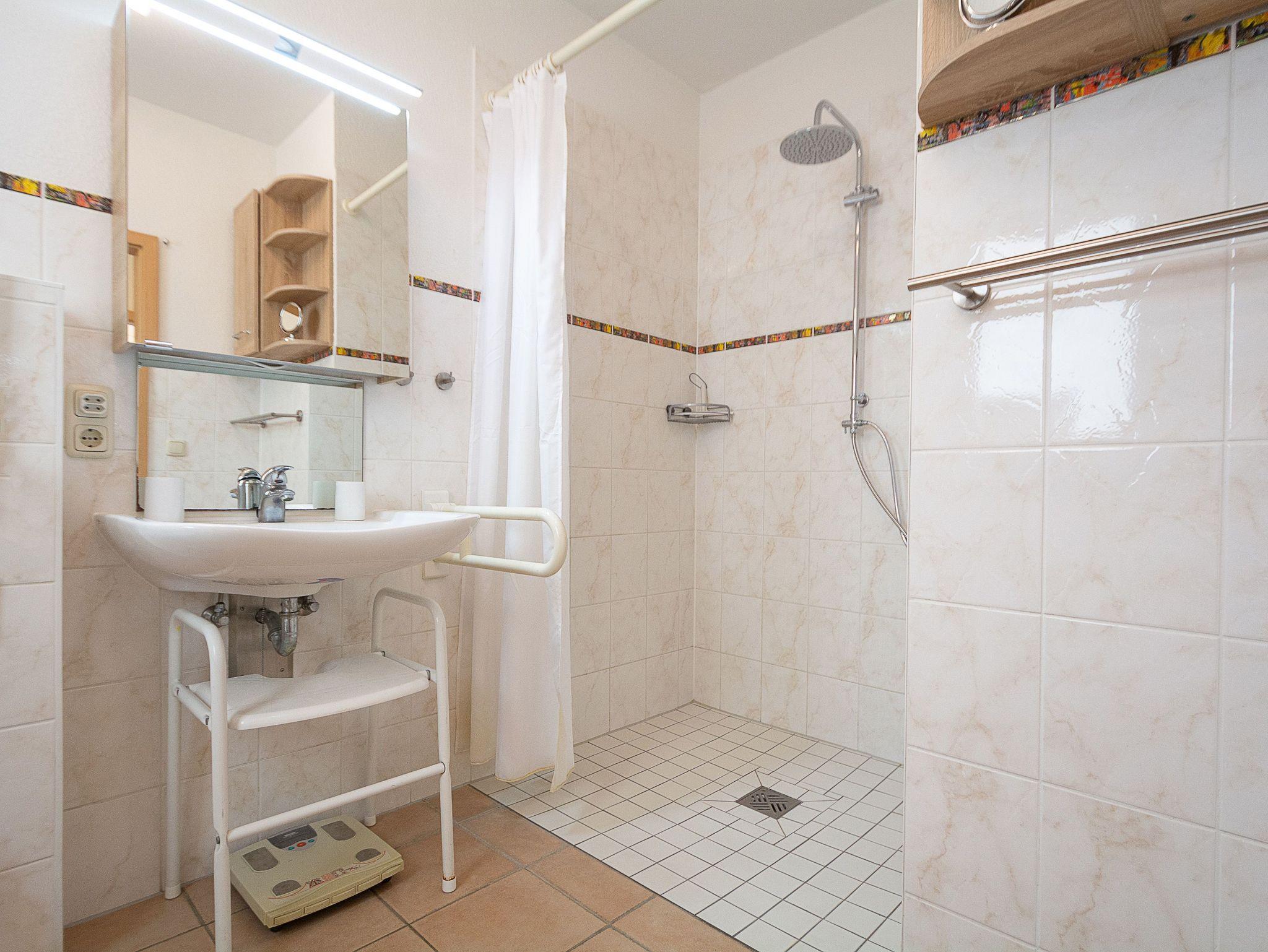 Das Tageslichtbad im Erdgeschoss ist barrierearm mit bodengleicher Dusche und Haltegriffen in Dusche und an der Toilette sowie einem unterfahrbaren Waschbecken konzipiert. Das zweite Duschbad in der oberen Etage ist ein Tageslichtbad mit flacher Duschwanne und bietet den Zugang zur hauseigenen Sauna.