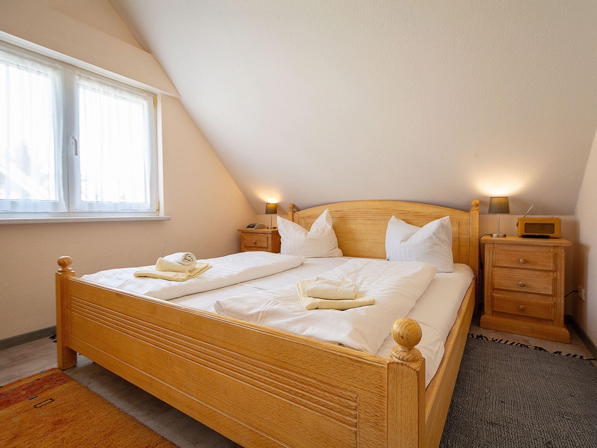 Im Schlafzimmer lädt Sie ein komfortables Doppelbett (2 x 90cm x 200 cm) in bequemer Einstiegshöhe zur Nachtruhe ein. Der großzügige Kleiderschrank mit Ganzkörperspiegel bietet genügend Platz für Ihre Urlaubsgarderobe. In der oberen Etage befinden sich ebenfalls zwei Schlafzimmer mit je einem Doppelbett (2 x 90cm x 200cm) und großen Kleiderschränken. Als Sichtschutz bzw. zum Verdunkeln sind in den Schlafzimmern und im Wohnbereich Außenrollos an den Fenstern angebracht.