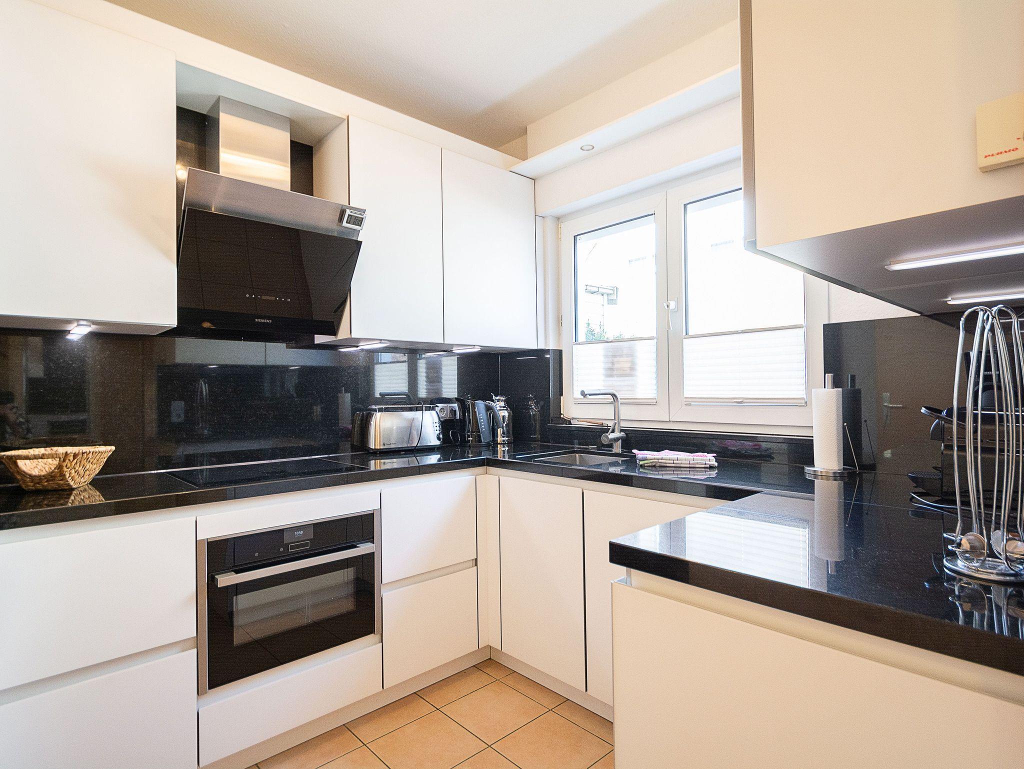 Die separate moderne Designer-Küche mit einer Granitarbeitsplatte hält für Sie alle wichtigen Küchengeräte und -utensilien bereit, die Sie für Ihr perfektes Dinner benötigen: Ein 4-Zonen-Induktionskochfeld mit Dunstabzug, ein Backofen mit integrierter Mikrowelle, ein Geschirrspüler sowie ein Kühl- Gefrierkombination befinden sich in der Küche. Eine Kaffeemaschine, ein Wasserkocher und ein Toaster sowie genügend Koch- und Essgeschirr vervollständigen die Kücheneinrichtung.