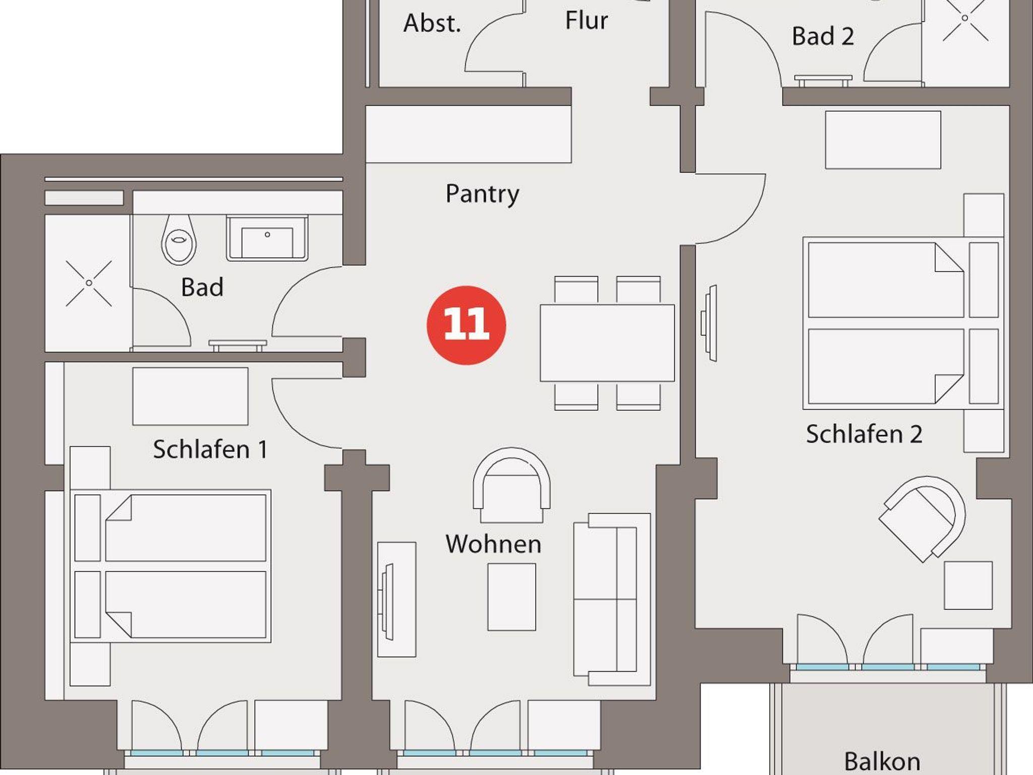 Das Apartment bietet mit seinen zwei Schlafzimmern genügend Platz für 4 Personen (bis zu 6 Personen auf Anfrage). Außerdem verfügt es neben seiner Wohnfläche von ca. 67 qm auch über drei Balkone. Diese sind mit Balkonmöbeln und einem Sonnenschirm ausgestattet.