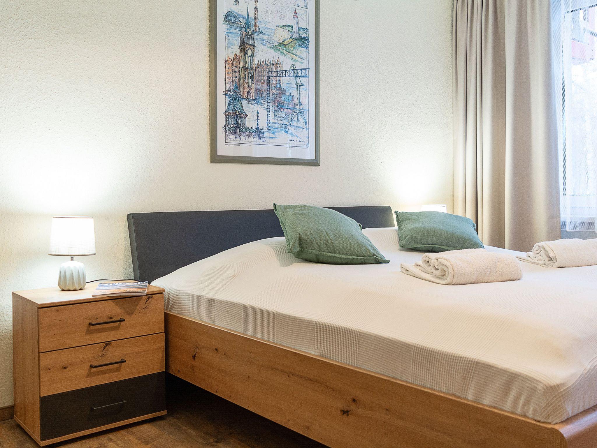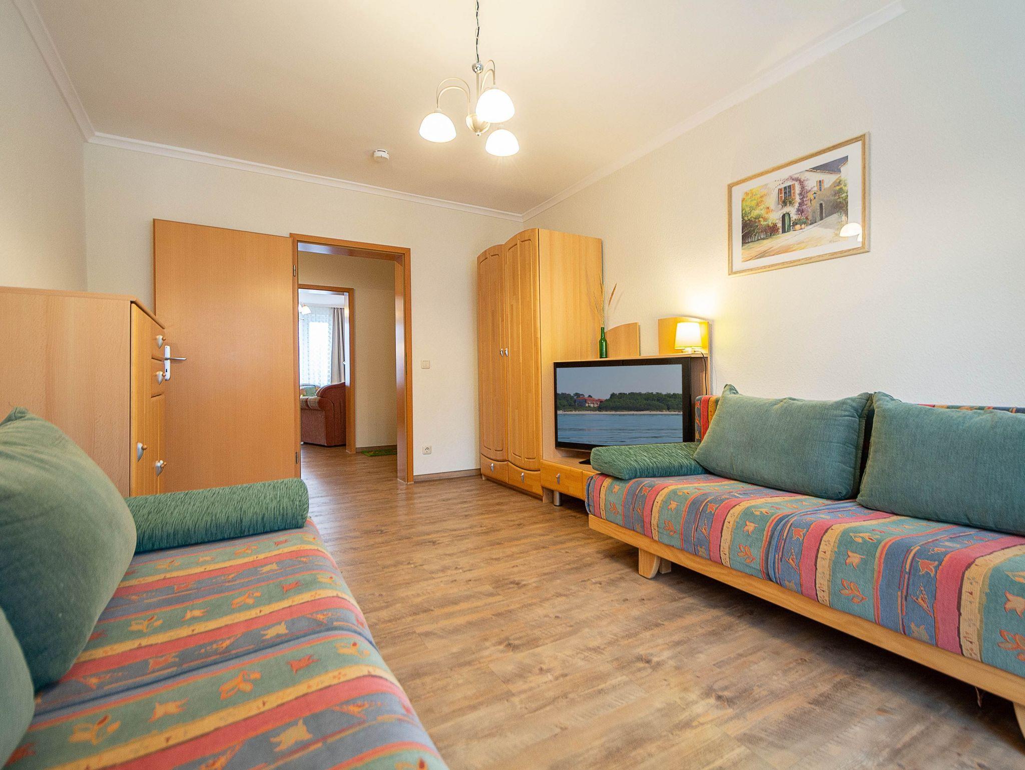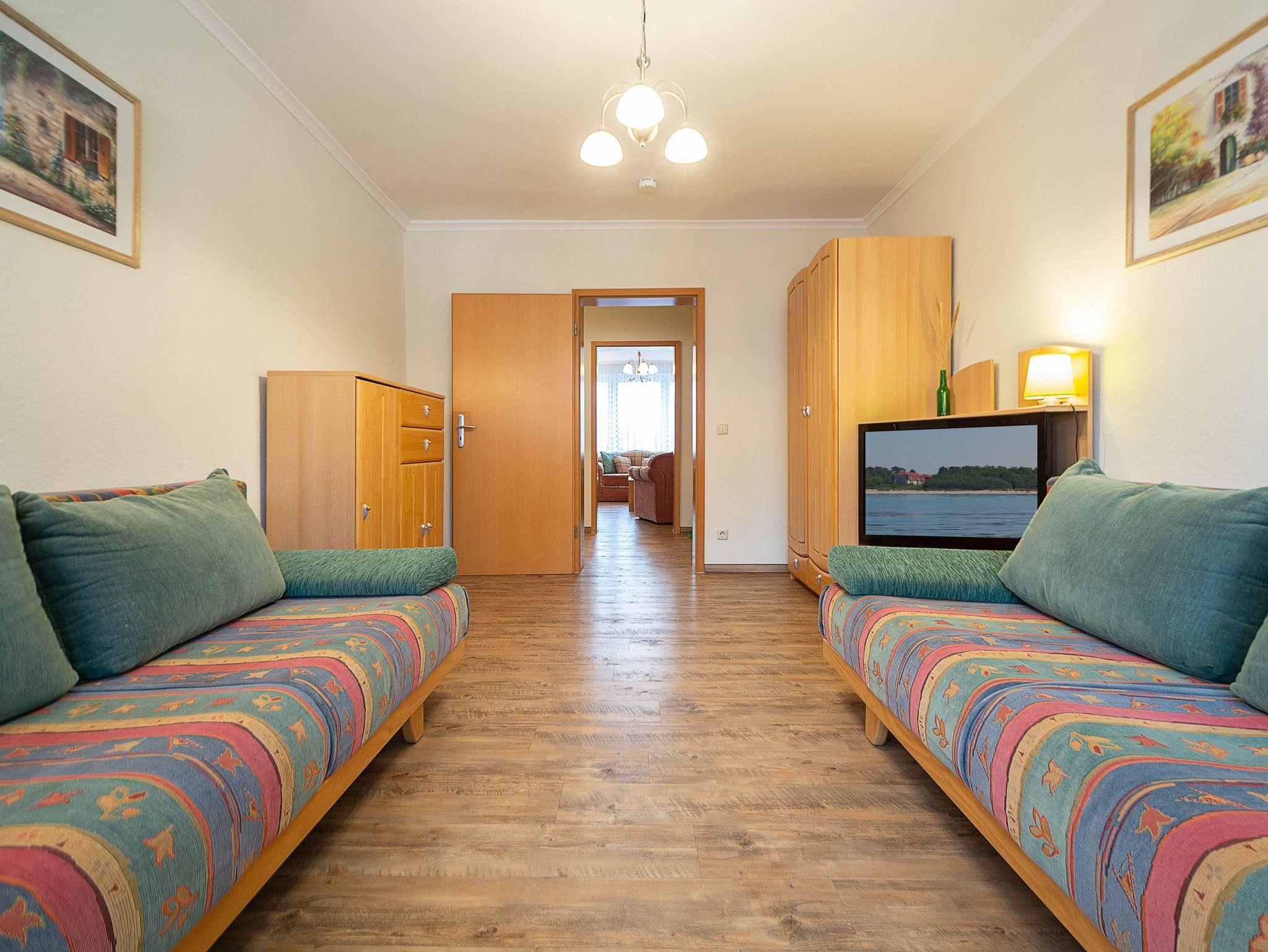 Im ersten Schlafzimmer lädt Sie ein komfortables Doppelbett (2 x 90 x 200 cm) zur Nachtruhe ein. Der großzügige Kleiderschrank mit Ganzkörperspiegel bietet genügend Platz für Ihre Urlaubsgarderobe. Das zweite Schlafzimmer besteht aus zwei getrennt hintereinander stehenden Schlafcouchen, die jeweils auf eine Breite von 140cm ausgezogen werden können. Hier befindet sich auch ein weiteres TV-Gerät (42 Zoll). Vom zweiten Schlafraum können Sie die möblierte Ost-Terrasse betreten, die zum leckeren Frühstück in der Morgensonne einlädt. Als Sichtschutz bzw. zum Verdunkeln sind in beiden Schlafzimmern und im Gardinen und Vorhänge an den Fenstern angebracht.