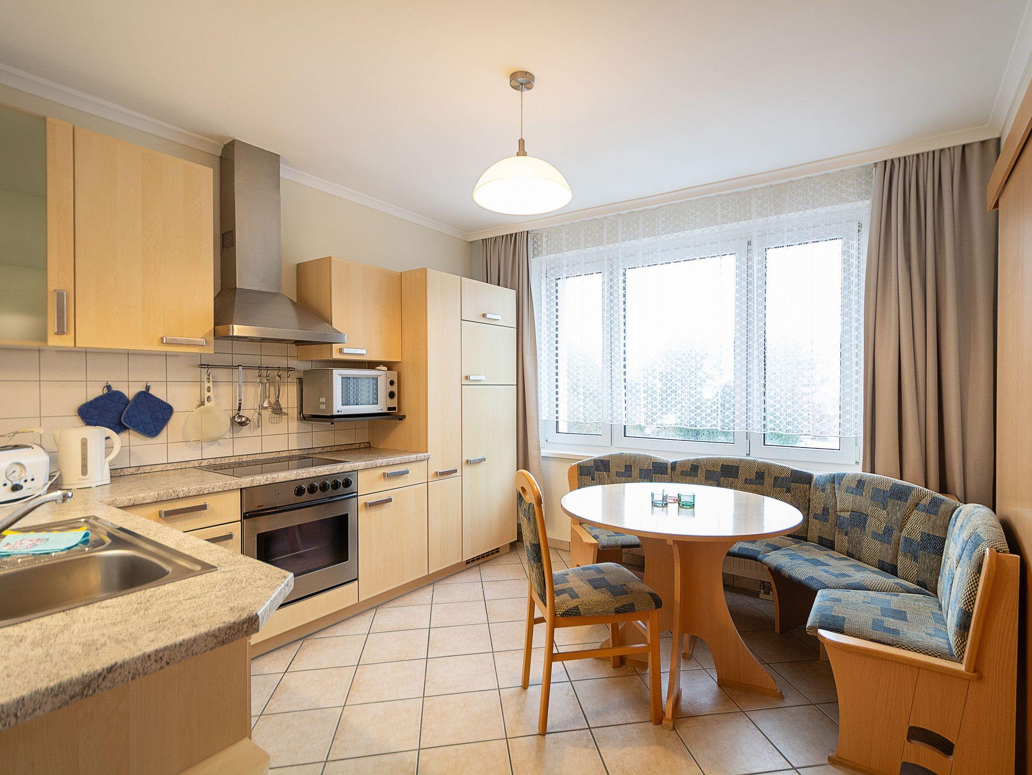 Der gemütliche Wohnraum ist ausgestattet mit einer Wohnlandschaft und einem 43-Zoll-Flachbild-TV. Die separate großzügig gestaltetet Küche mit einem gemütlichen Essbereich hält für Sie alle wichtigen Küchengeräte und -utensilien bereit, die Sie für Ihr perfektes Dinner benötigen: Ein 4-Zonen-Cerankochfeld mit Dunstabzug, ein Backofen, Kühlschrank mit Gefrierfach, ein Geschirrspüler sowie Mikrowelle befinden sich in der Küche. Eine Kaffeemaschine, ein Wasserkocher und ein Toaster sowie genügend Koch- und Essgeschirr vervollständigen die Kücheneinrichtung.