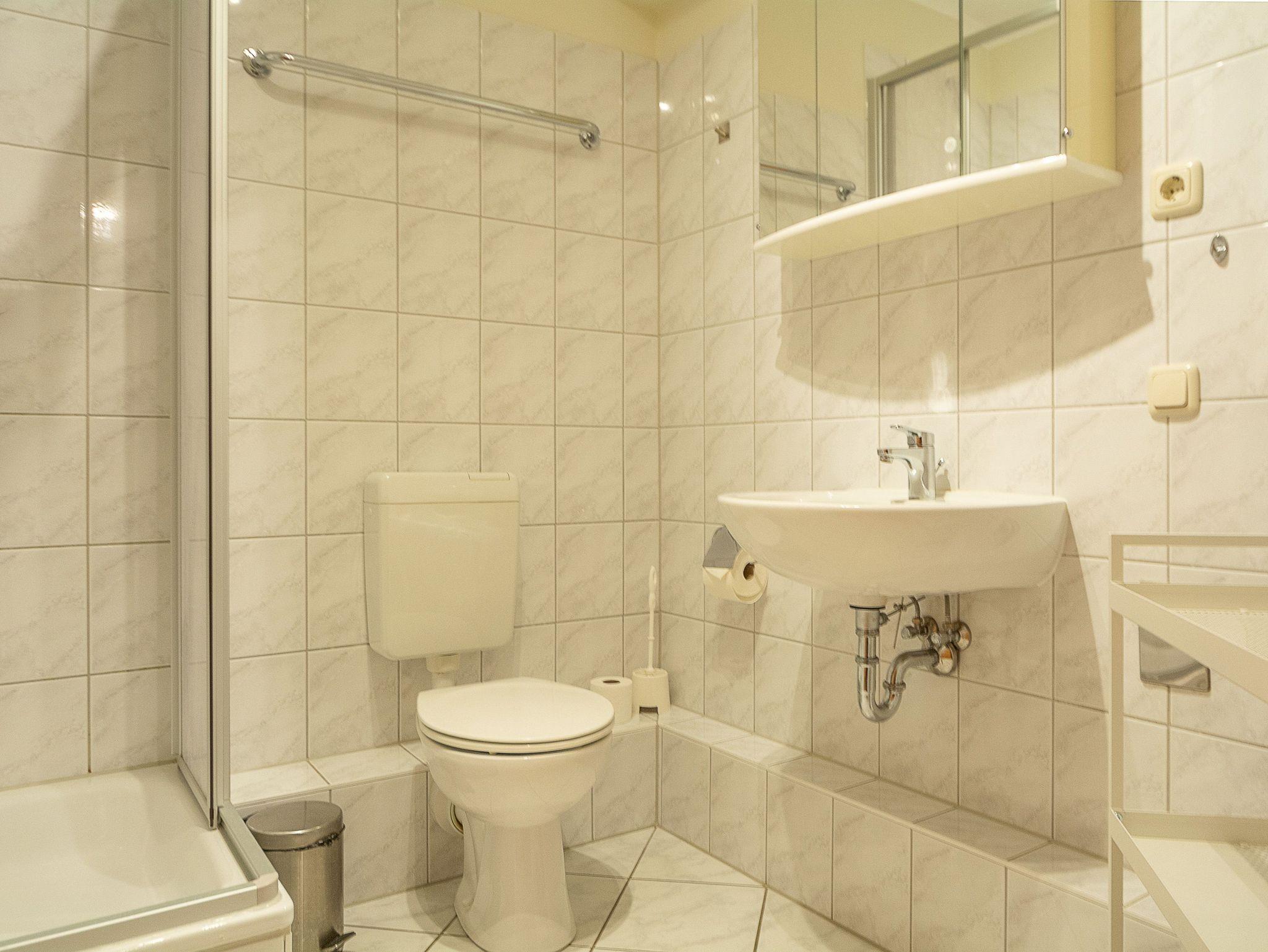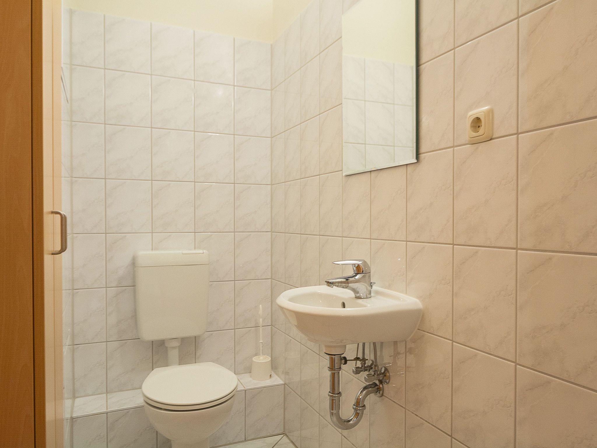 Das geflieste Bad ist ausgestattet mit einer Dusche, Waschbecken und WC. Ein Gäste-WC befindet sich direkt nebenan.