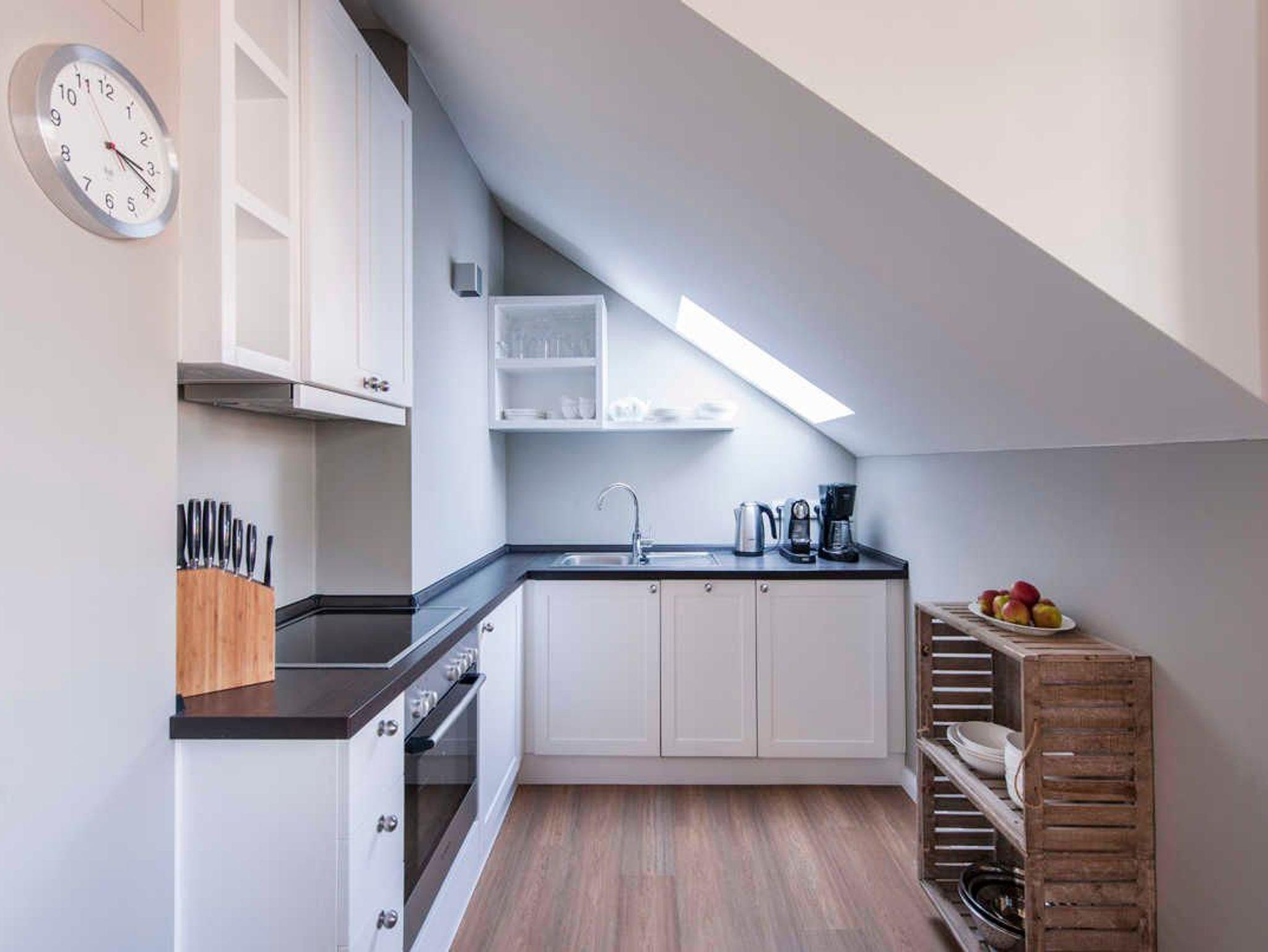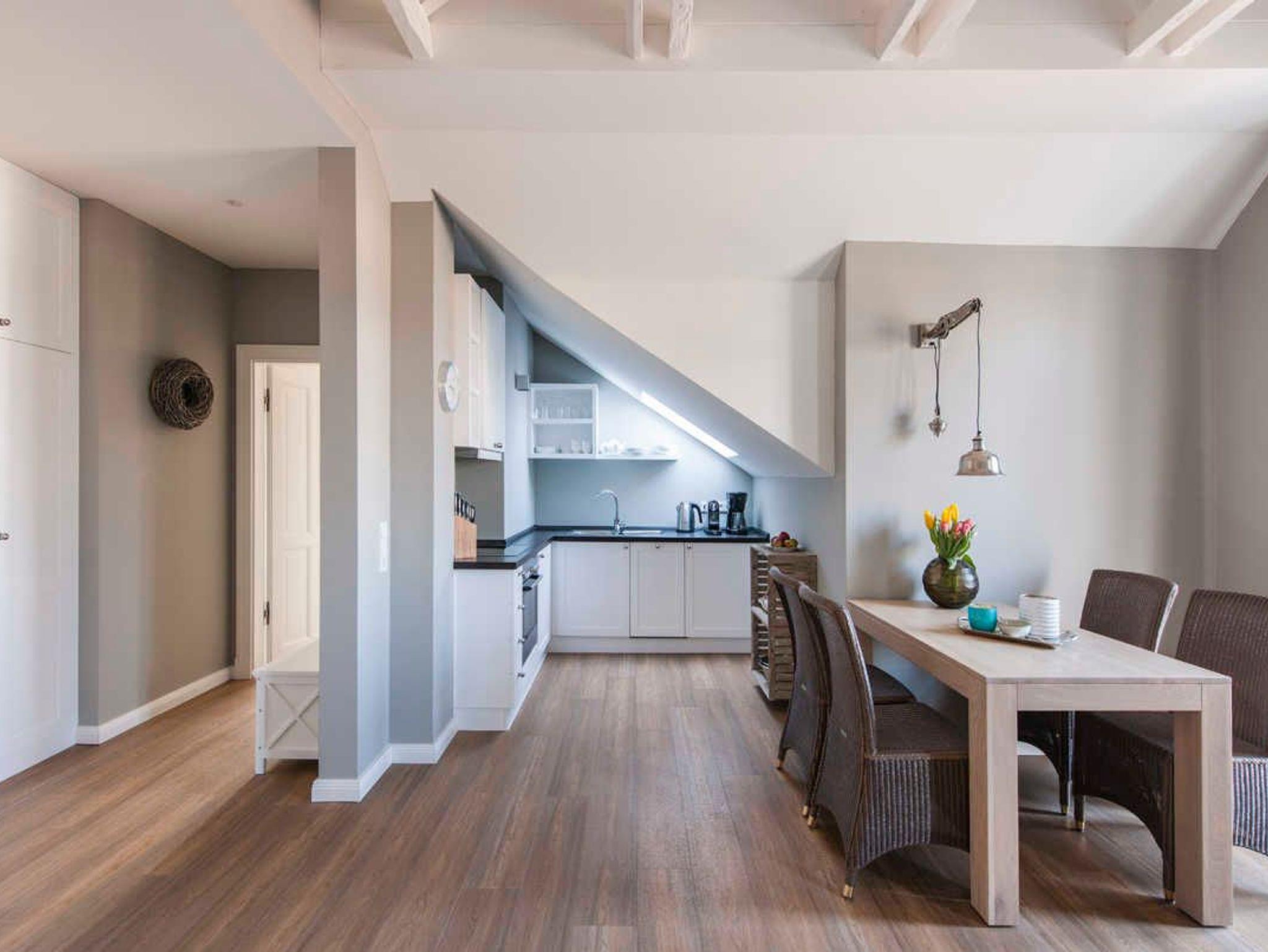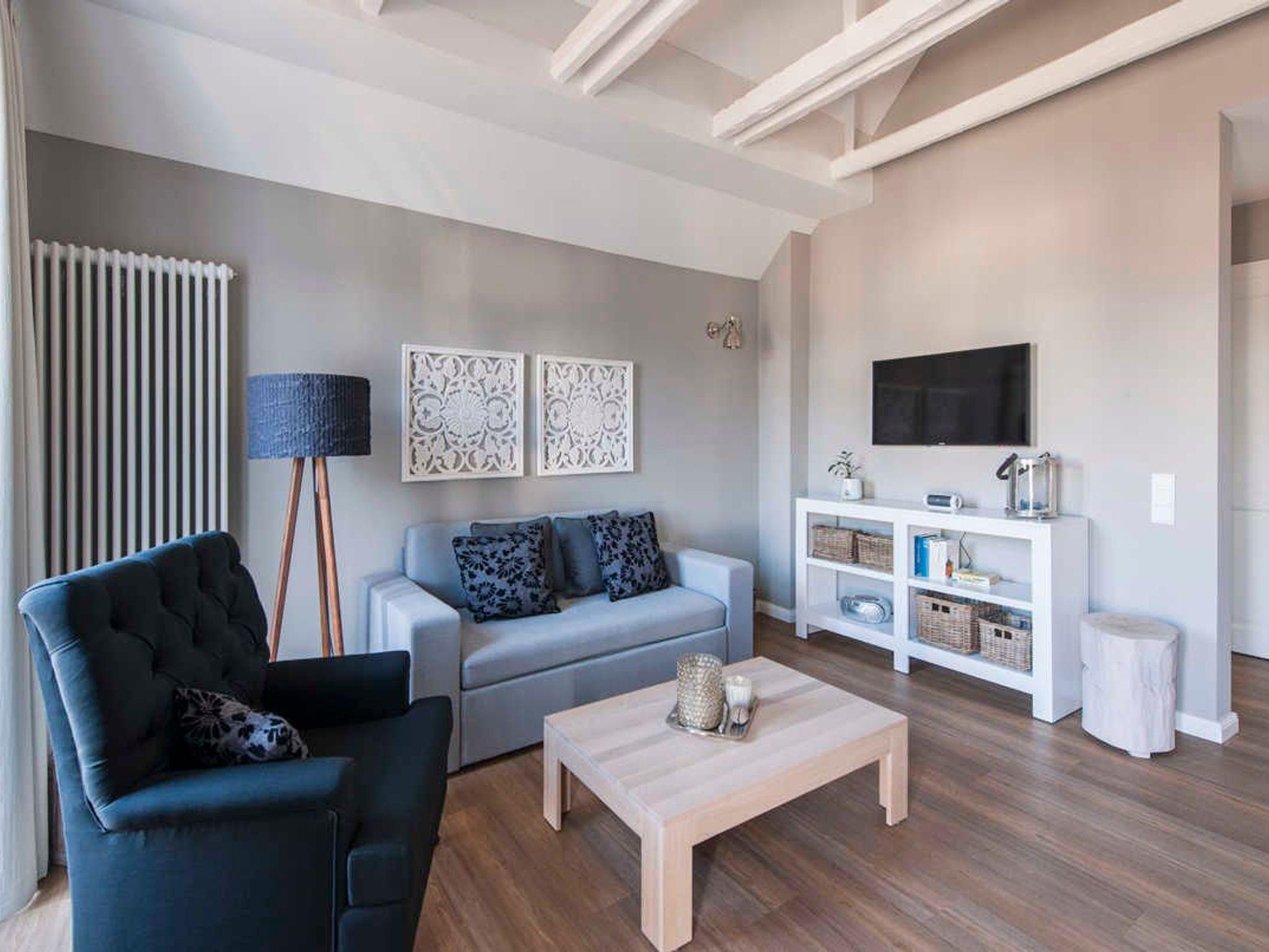 Zur Ausstattung der 53 m² großen Wohnung gehören u.a. eine komplette Küche mit Herd, Backofen, Spülmaschine, Kühlschrank mit Gefrierfach, Kaffeemaschine, Toaster, Nespresso-Maschine, Handmixer etc.; CD-Radio & Bluetooth-Lautsprecher, TV in Wohn- und Schlafzimmer (Doppelbett 180x200 m), WLAN-Hotspot, Bügeleisen und-brett, Fön, Schranksafe, etc. Alle Möbel wurden exklusiv und individuell aus Holz von einem Tischler gefertigt, ebenso die nach historischem Vorbild erstellten Fenster und Türen. Die Wohnung ist insgesamt sehr hochwertig und geschmackvoll eingerichtet und mit entsprechendem Ambiente geschmückt. Natürliche Materialien und schöne, ruhige Farben geben Ihnen ein hochwertiges Umfeld für Ihren Urlaub.