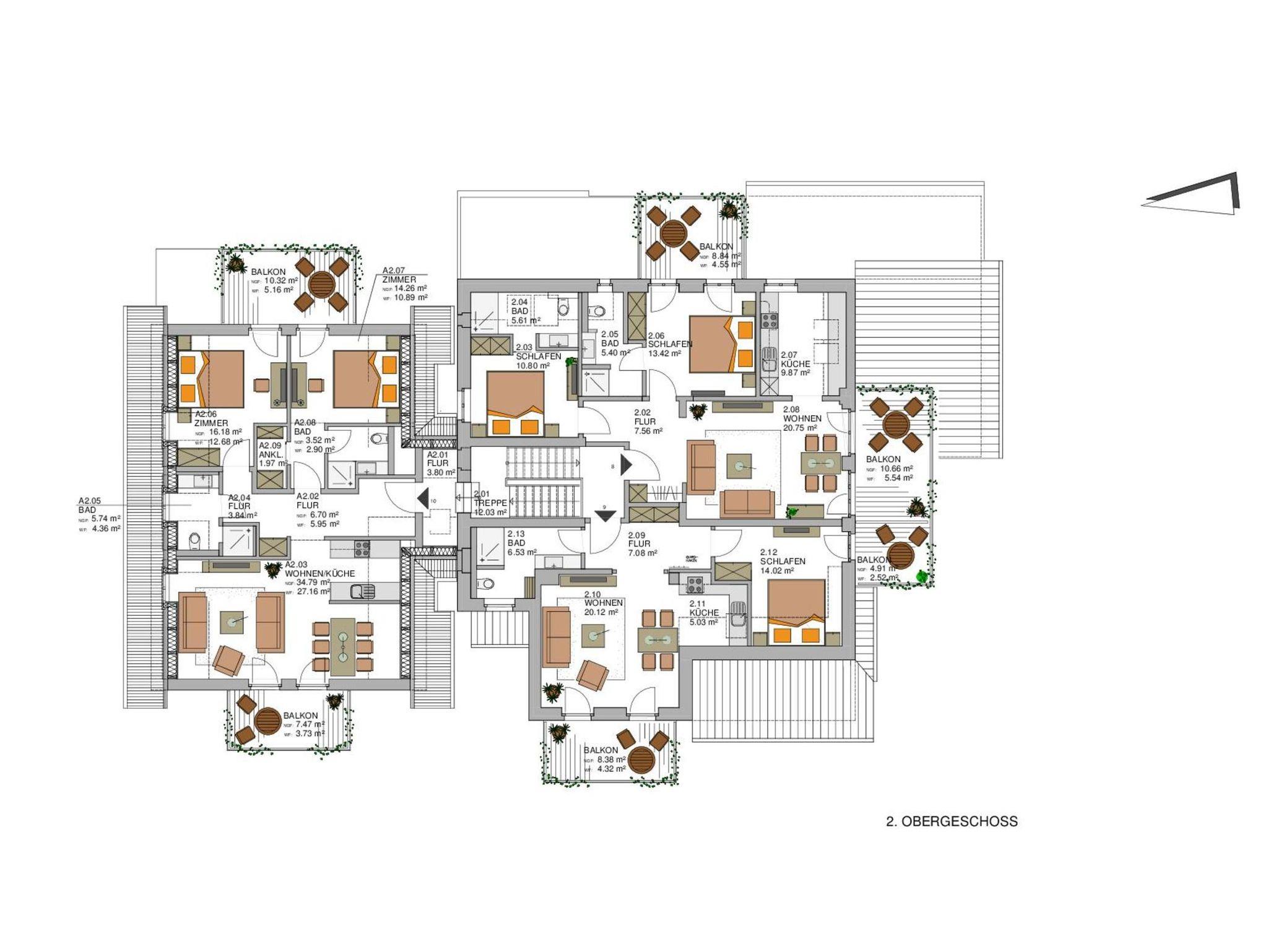 4 Wohnungen mit zwei Schlafzimmern und jeweils zwei Badezimmern.