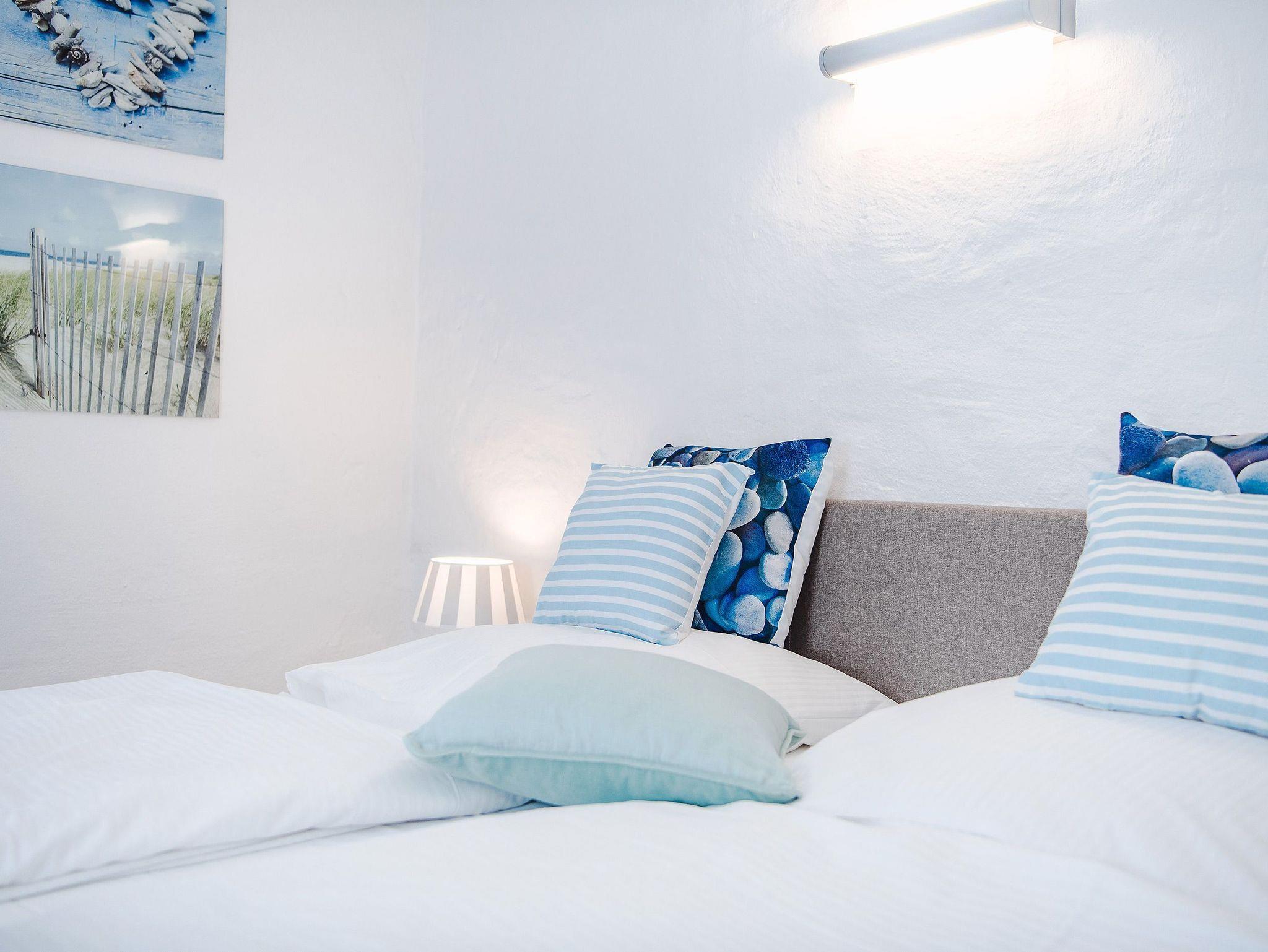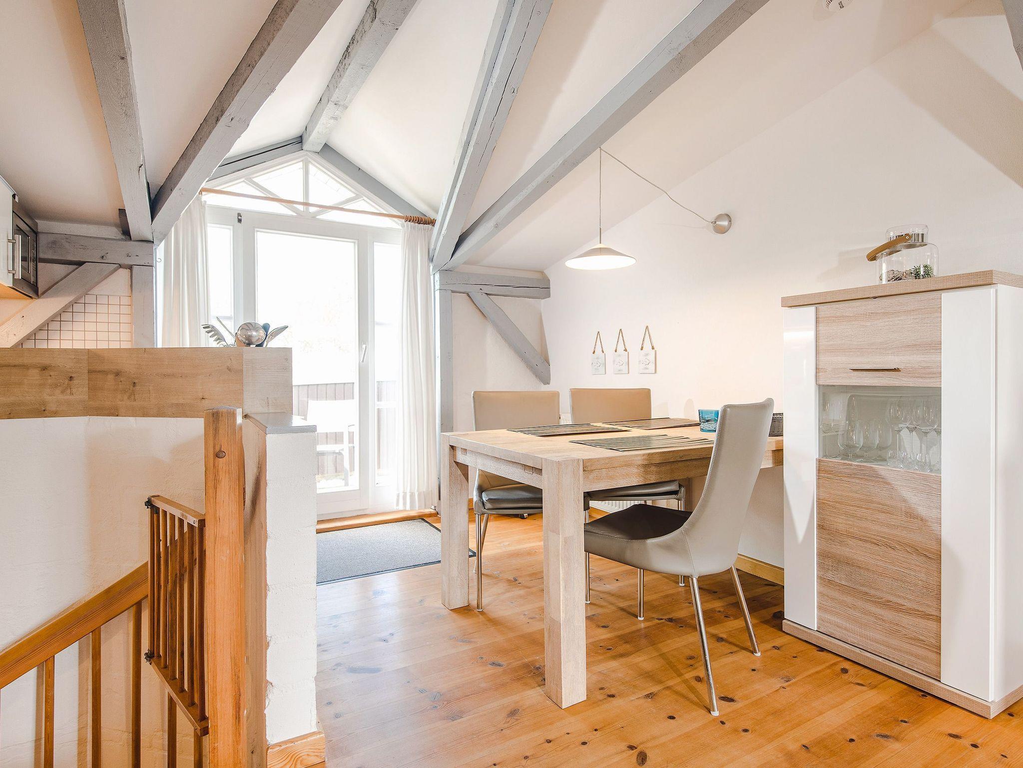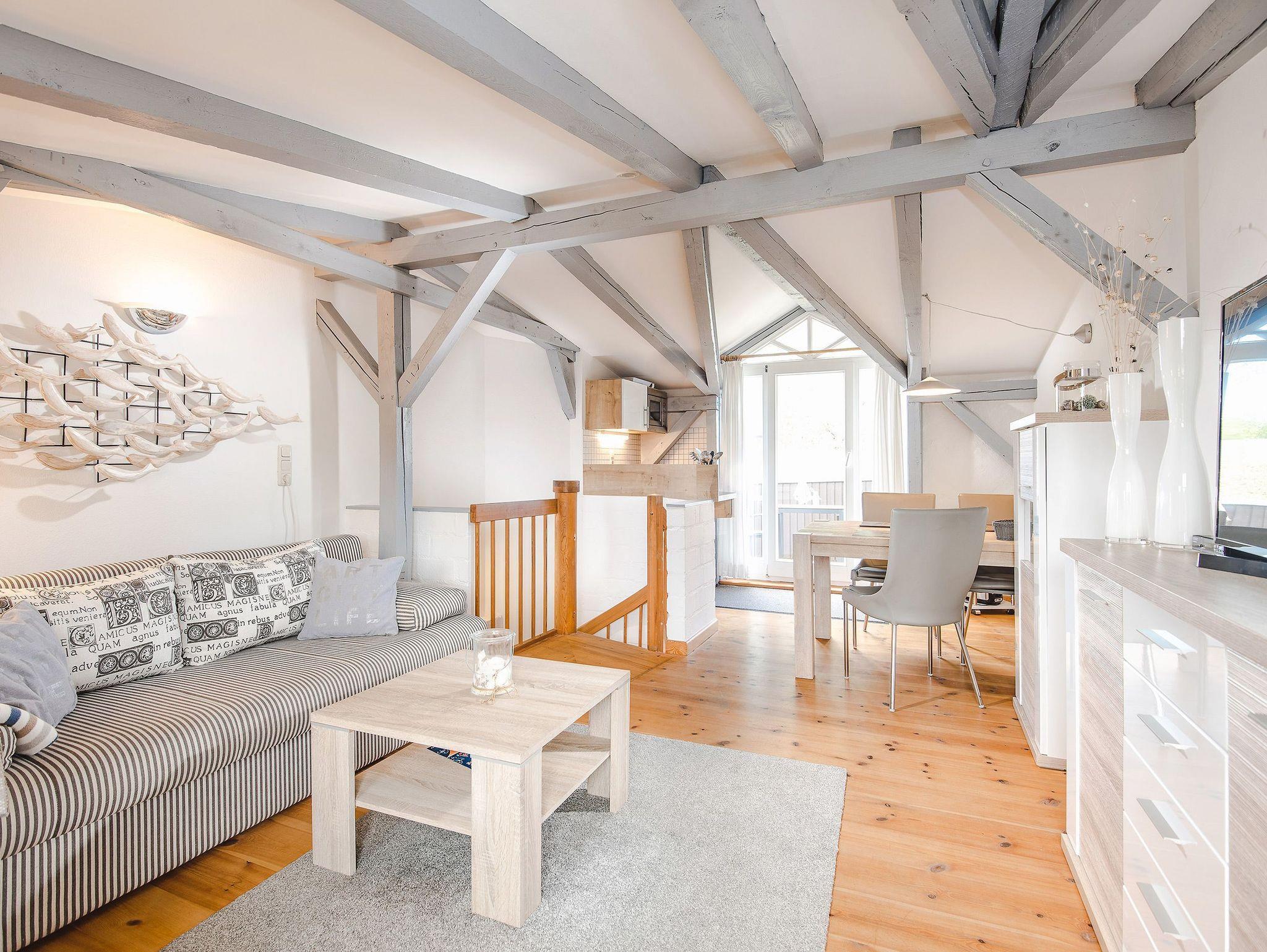 Die Wohnung befindet sich im Obergeschoss und besteht aus einem offenen Wohn- und Küchenbereich. Die Küche ist mit einem Ceranfeld-Herd, einem Kühlschrank, einer Mikrowelle, einer Kaffeemaschine, einem Toaster und einem Wasserkocher ausgestattet. Vom Küchenbereich aus gelangen Sie auf den Balkon, auf dem Gartenmöbel zur Verfügung stehen. Über eine Spindeltreppe gelangen Sie in das Erdgeschoss, wo sich das Badezimmer mit Dusche und das liebevoll eingerichtete Schlafzimmer befinden. Das Schlafzimmer verfügt über ein großes Boxspringbett, einen Kleiderschrank und eine Kommode mit Schubfächern. Ein PKW-Stellplatz gehört ebenfalls zur Wohnung.