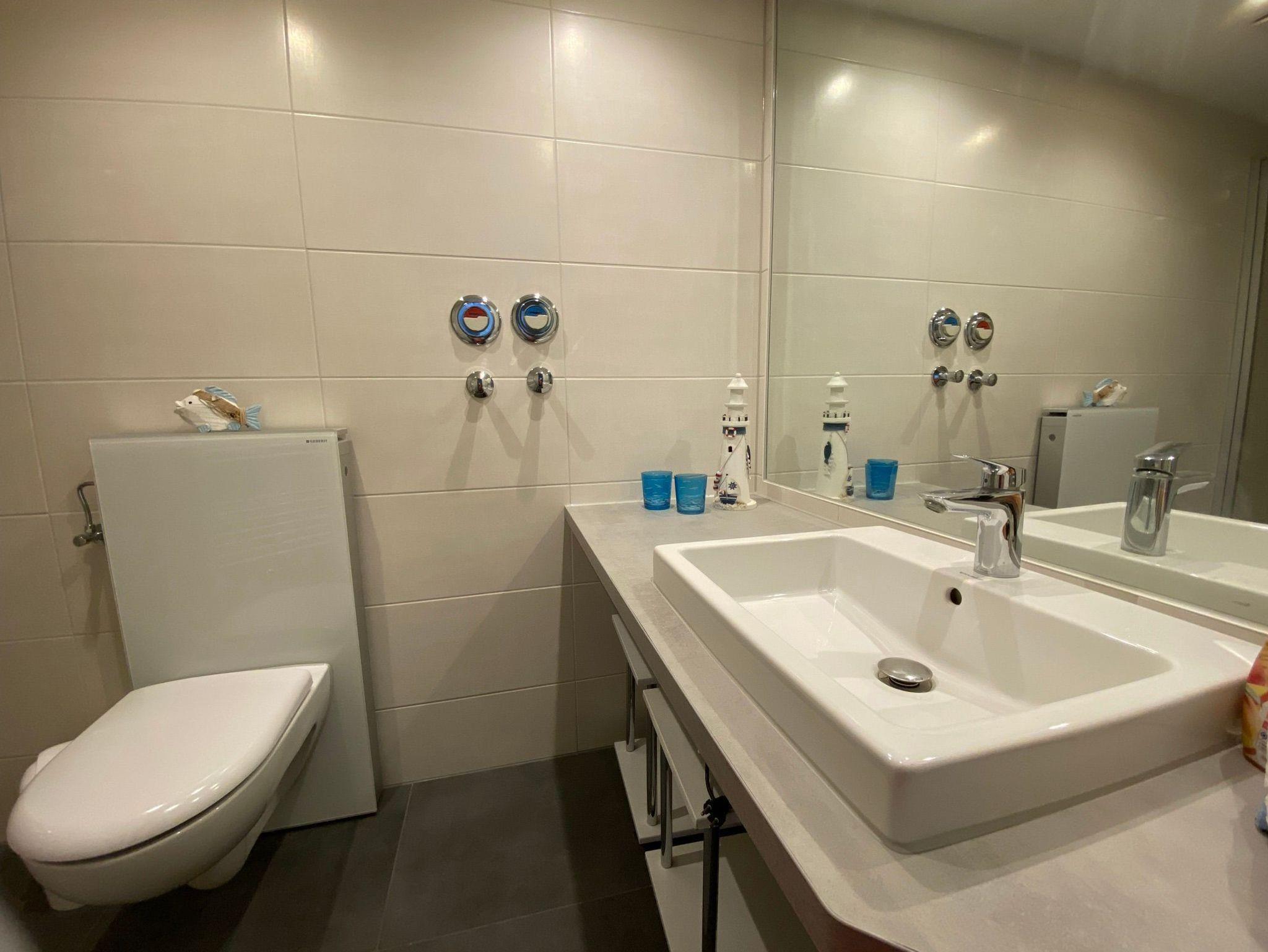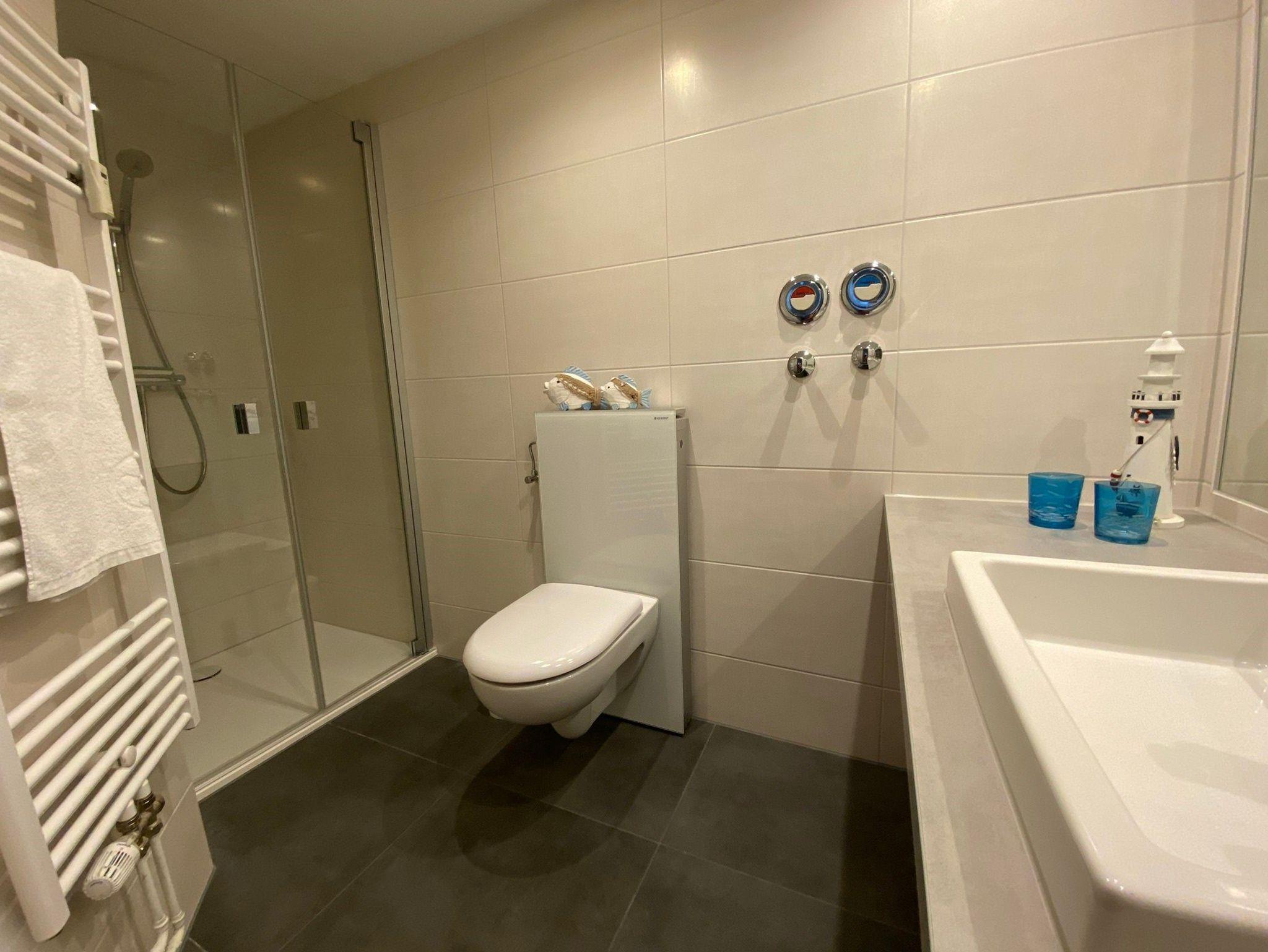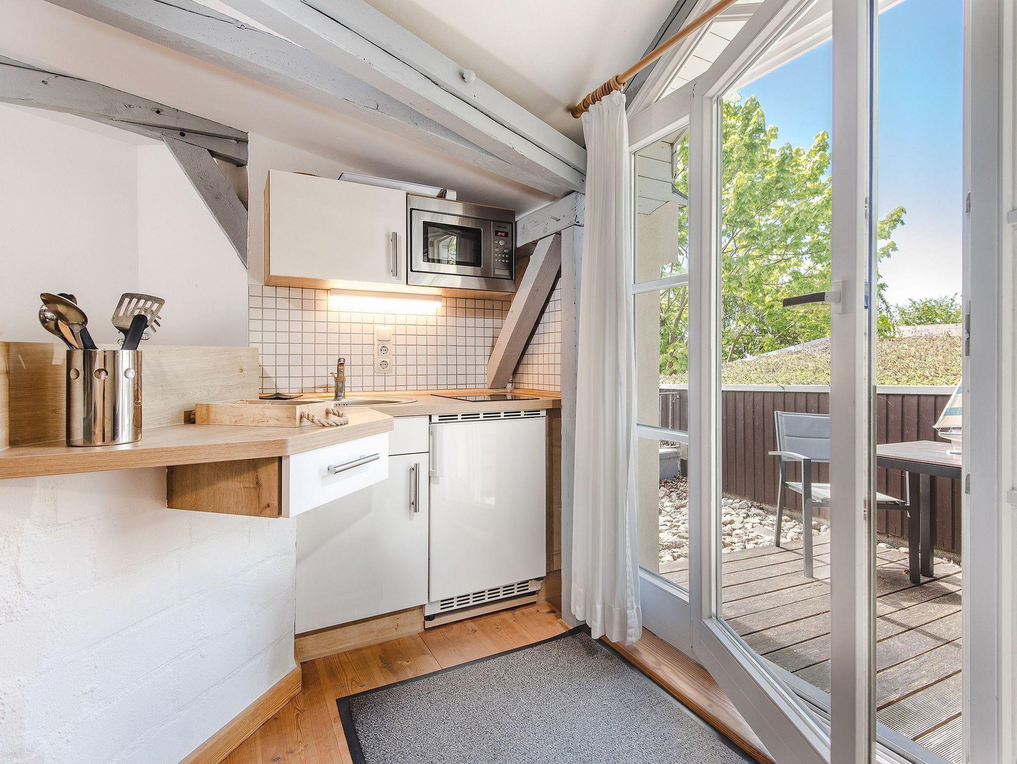 Die Wohnung befindet sich im Obergeschoss und besteht aus einem offenen Wohn- und Küchenbereich. Die Küche ist mit einem Ceranfeld-Herd, einem Kühlschrank, einer Mikrowelle, einer Kaffeemaschine, einem Toaster und einem Wasserkocher ausgestattet. Vom Küchenbereich aus gelangen Sie auf den Balkon, auf dem Gartenmöbel zur Verfügung stehen. Über eine Spindeltreppe gelangen Sie in das Erdgeschoss, wo sich das Badezimmer mit Dusche und das liebevoll eingerichtete Schlafzimmer befinden. Das Schlafzimmer verfügt über ein großes Boxspringbett, einen Kleiderschrank und eine Kommode mit Schubfächern. Ein PKW-Stellplatz gehört ebenfalls zur Wohnung.
