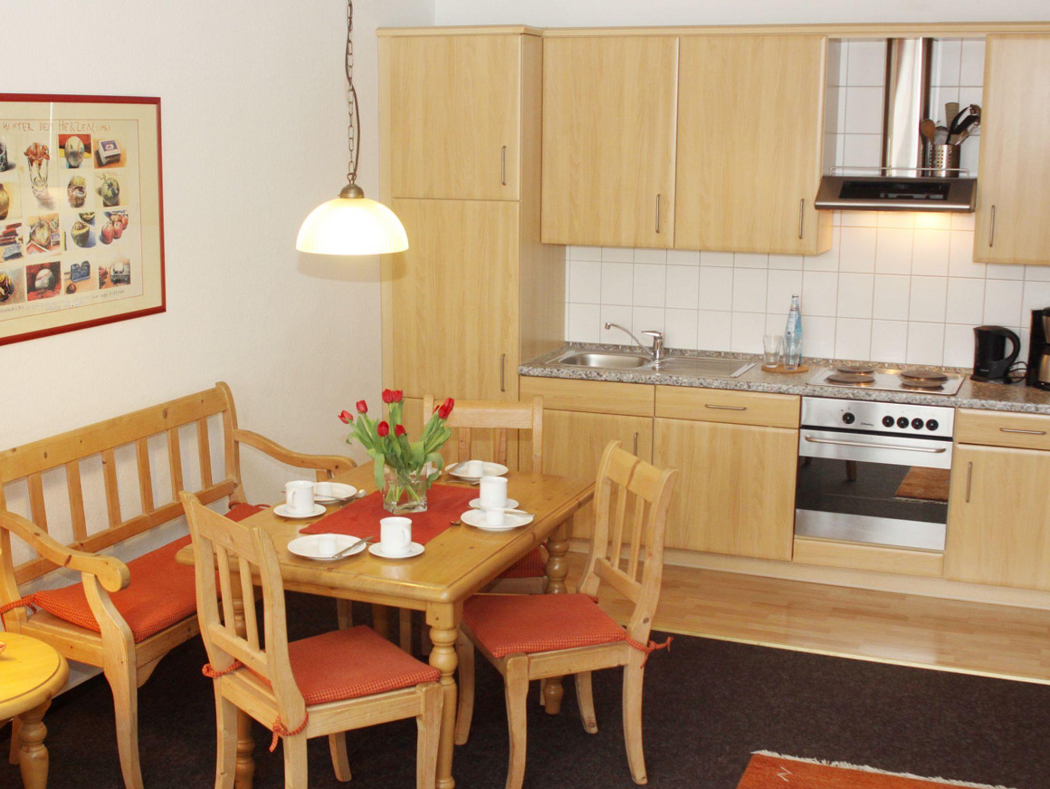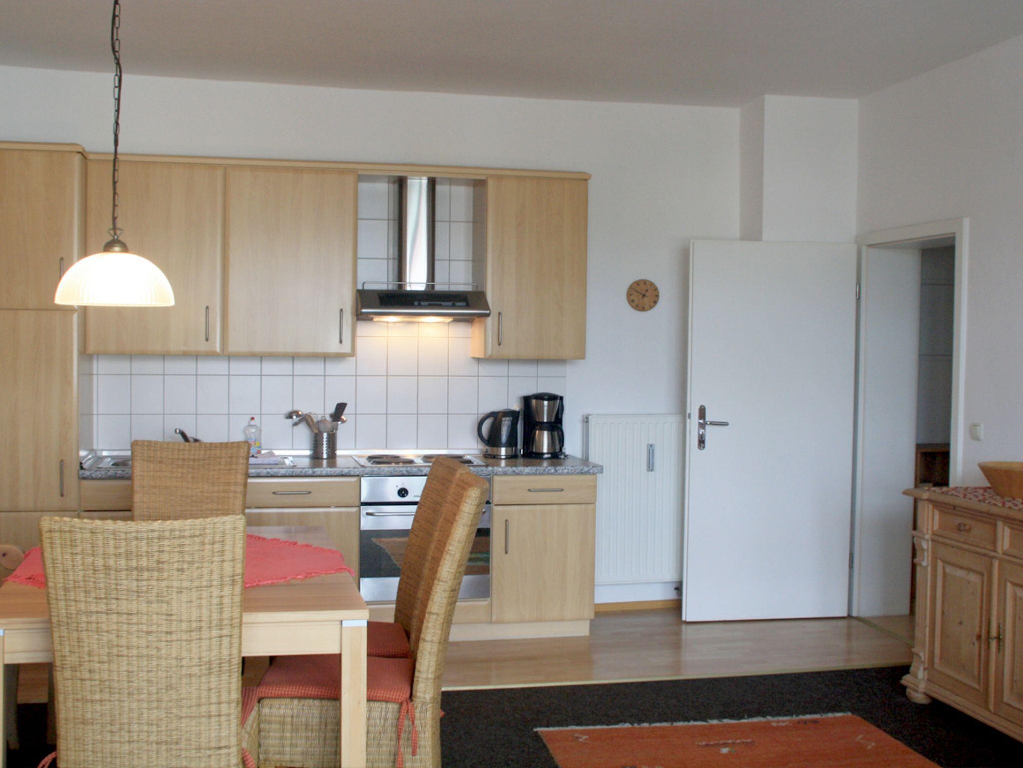 Vom Entree mit Garderobe und Zugang zum schönen Bad betreten Sie den großen Wohn- und Essraum mit Küche (Spülmaschine, Kühlschrank, Backofen, Vierplattenherd, Kaffeemaschine, Toaster, Wasserkocher und ausreichend Geschirr).