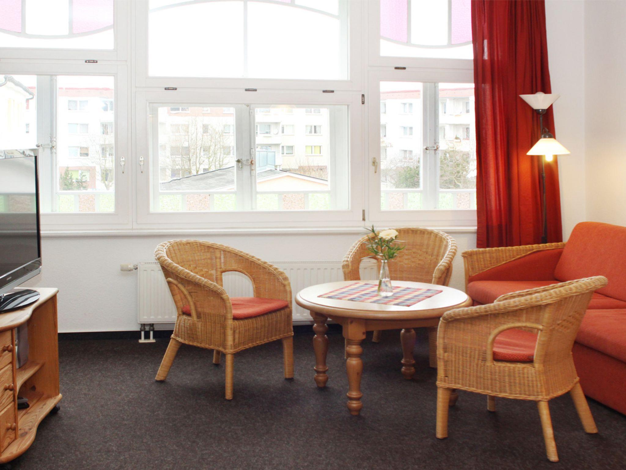 Unsere Ostsee-Ferienwohnung Horizont für vier Personen und 2 Aufbettungen, ca. 65 qm groß, befindet sich im zweiten Obergeschoss der Villa Waldfrieden, unserem renovierten Altbau mit den typischen, hohen Räumen und den großflächigen, bunten, denkmalgeschützten Jugendstilfenstern.