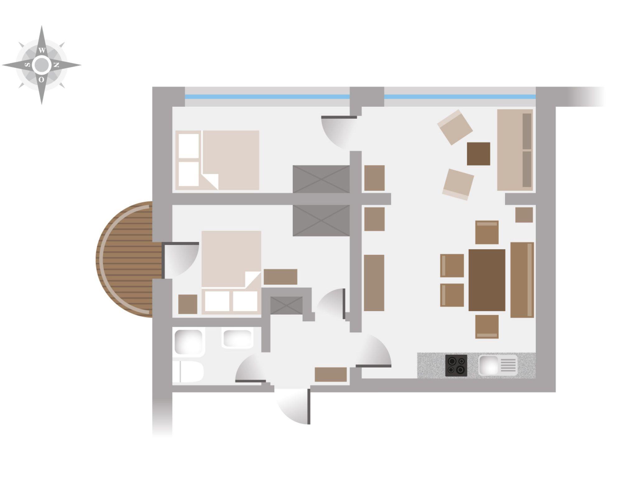 Wohnraum mit Ausziehcouch, offene Küche und Esstisch, zwei Schlafzimmer mit Doppelbett, Flur mit Garderobe, Bad, Südbalkon, Tiefgaragenplatz 6 Euro pro Nacht.