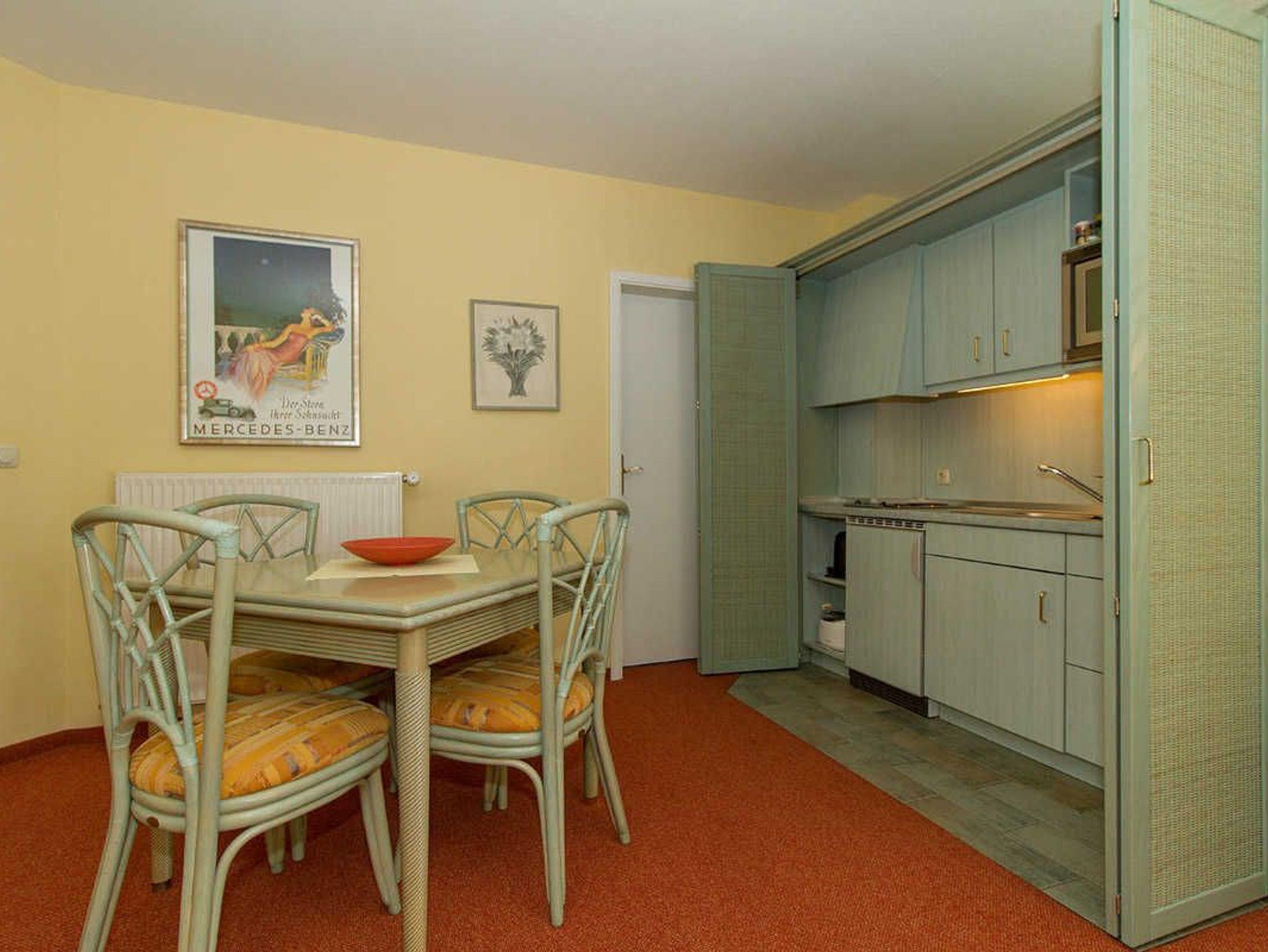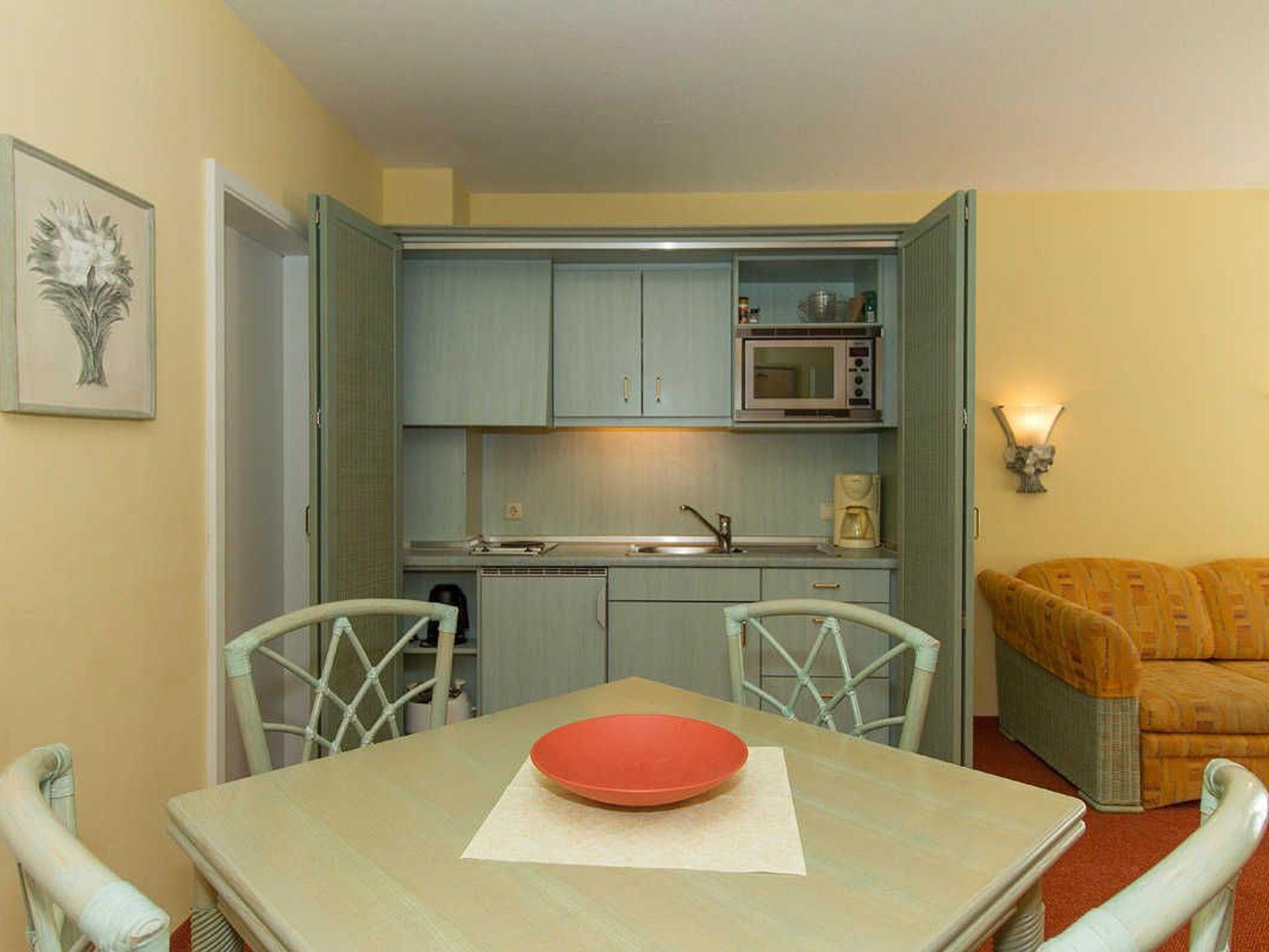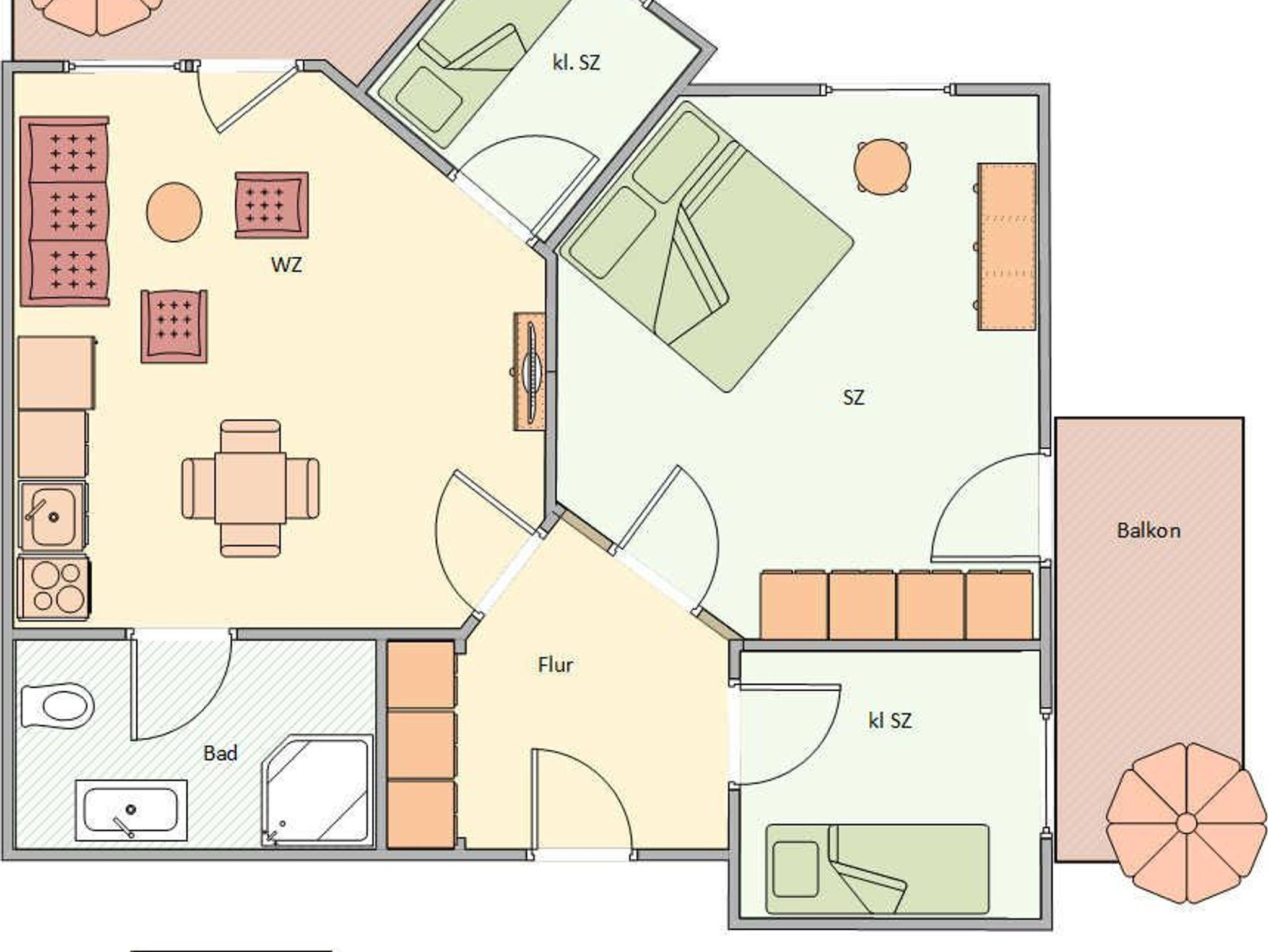 Die Wohnung ist im 1. Obergeschoss gelegen und hat zwei Balkone zur West- und Südseite. Die Wohnungsgröße beträgt ca. 66 qm und teilt sich in Wohnzimmer, angrenzende Küche, Schlafzimmer, 2 kl. Kinderzimmer, Badezimmer mit Wanne und Flur. Im Wohnzimmer befindet sich ein Esstisch mit 4 Stühlen. Küche ist mit Kühlschrank, 2 Kochfelder, Mikrowelle mit Backofen, Tresor, HD-Sat TV und Telefon.