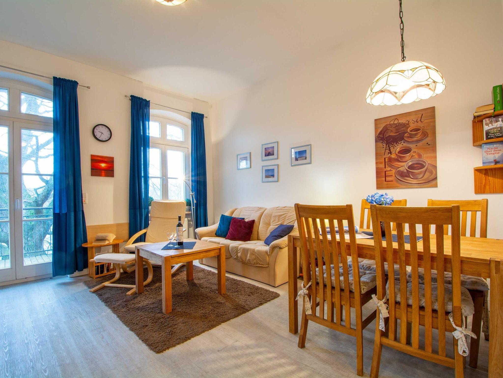 Die liebevoll eingerichtete 2-Raum-Ferienwohnung befindet sich in der zweiten Etage der Villa Waldhaus. Der kombinierte Wohn- und Essraum ist ausgestattet mit einer Schlafcouch (130cm Breite), Fernsehsessel mit Fußablage, einem 32-Zoll-Flachbild-TV, Radio sowie einem Esstisch mit 4 Stühlen. Von hier betreten Sie den möblierten Balkon, der nach Westen ausgerichtet ist. Vom Balkon können Sie bis zum Meer rüber schauen.