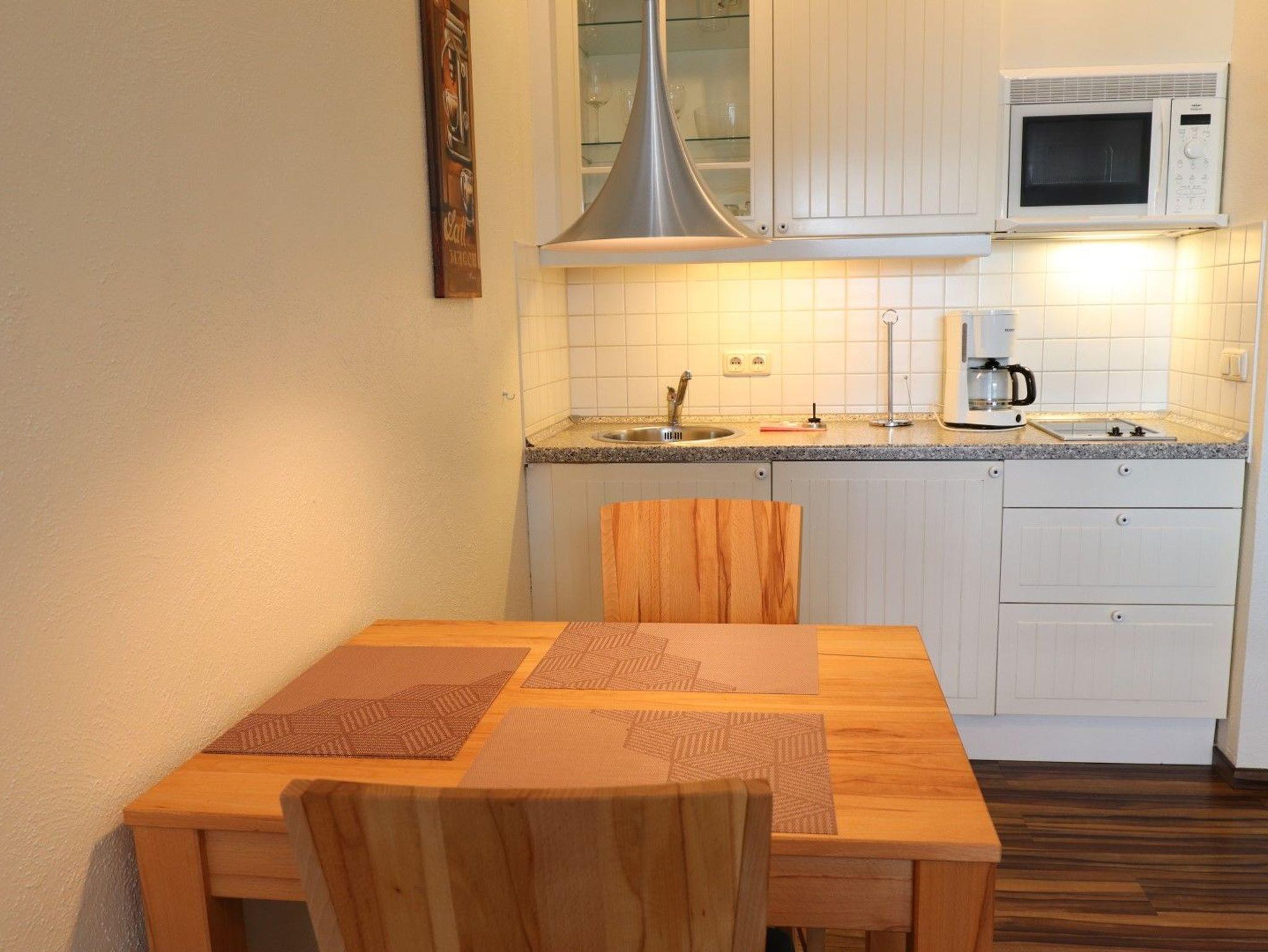 Die Küchenzeile mit Mikrowelle ist im Wohnbereich integriert.