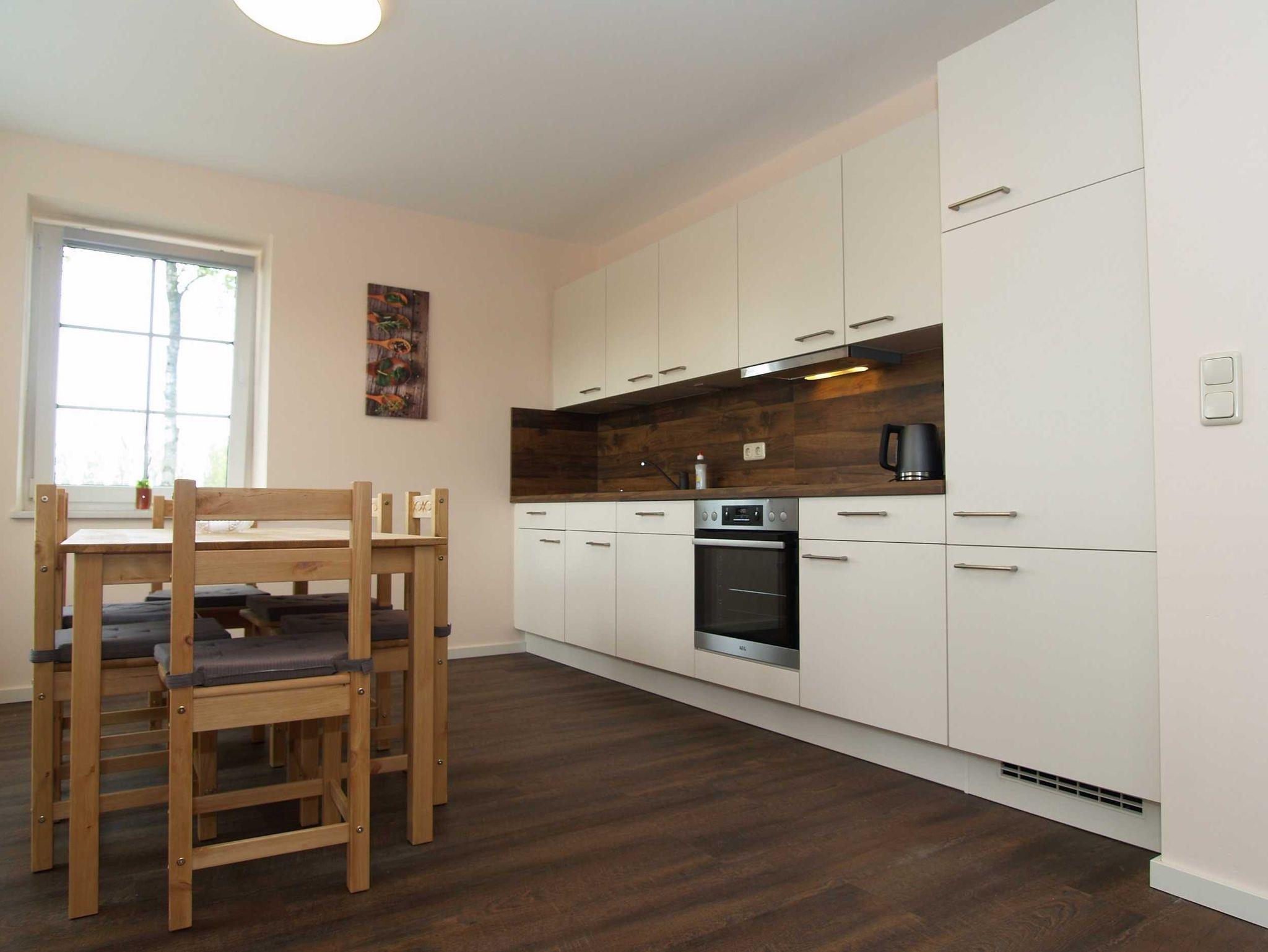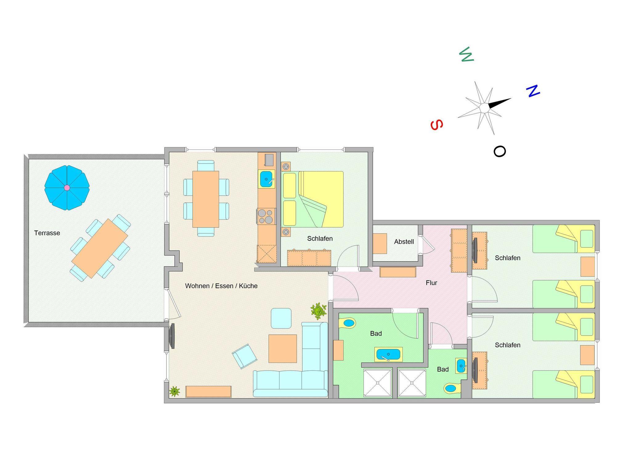 Sie wohnen in einer komfortablen 4-Raum-Wohnung, die sich im Erdgeschoss befindet. Über eine Terrasse betreten Sie das Wohnzimmer. Diese ca. 87 qm große Wohnung verfügt über einen kombinierten Wohn- und Essbereich mit Küchenzeile (Herd mit Backofen, Kühlschrabk mit Gefrierfach, Mikrowelle, Kaffeemaschine, Toaster), in dem sich auch eine gemütliche Couchgarnitur und ein Flachbild-TV befinden. Ein Schlafzimmer mit Doppelbett und großem Kleiderschrank sowie zwei weitere Schlafzimmer mit jeweils zwei Einzelbetten (ebenfalls mit Flachbild-TV ausgestattet) sowie zwei Bäder mit Dusche und WC vervollständigen das Gesamtbild dieser modern eingerichteten Wohnung.
