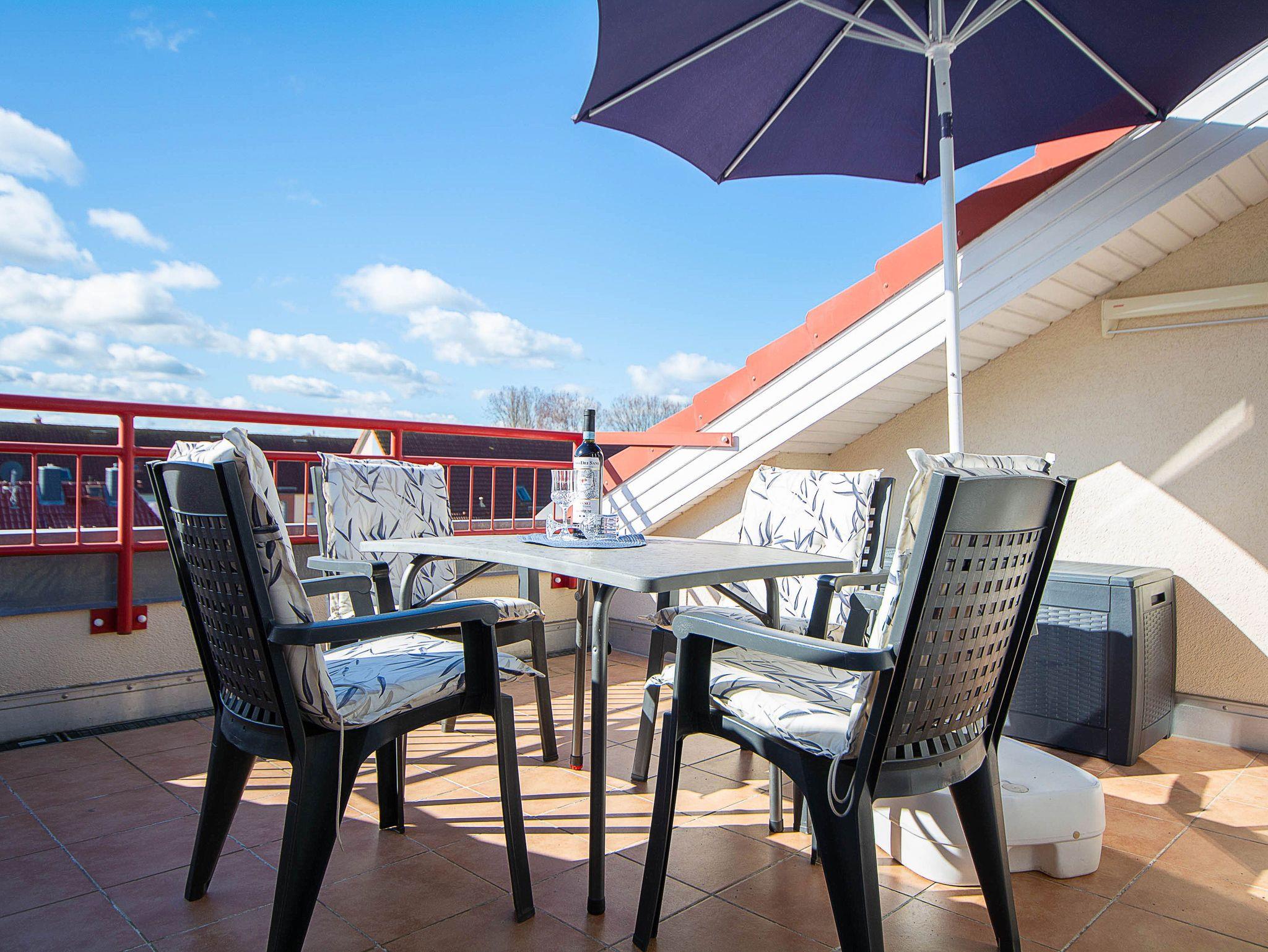 Moderne Maisonettewohnung mit Dachterrasse und Meerblick in familienfreundlicher Anlage nahe Strand.