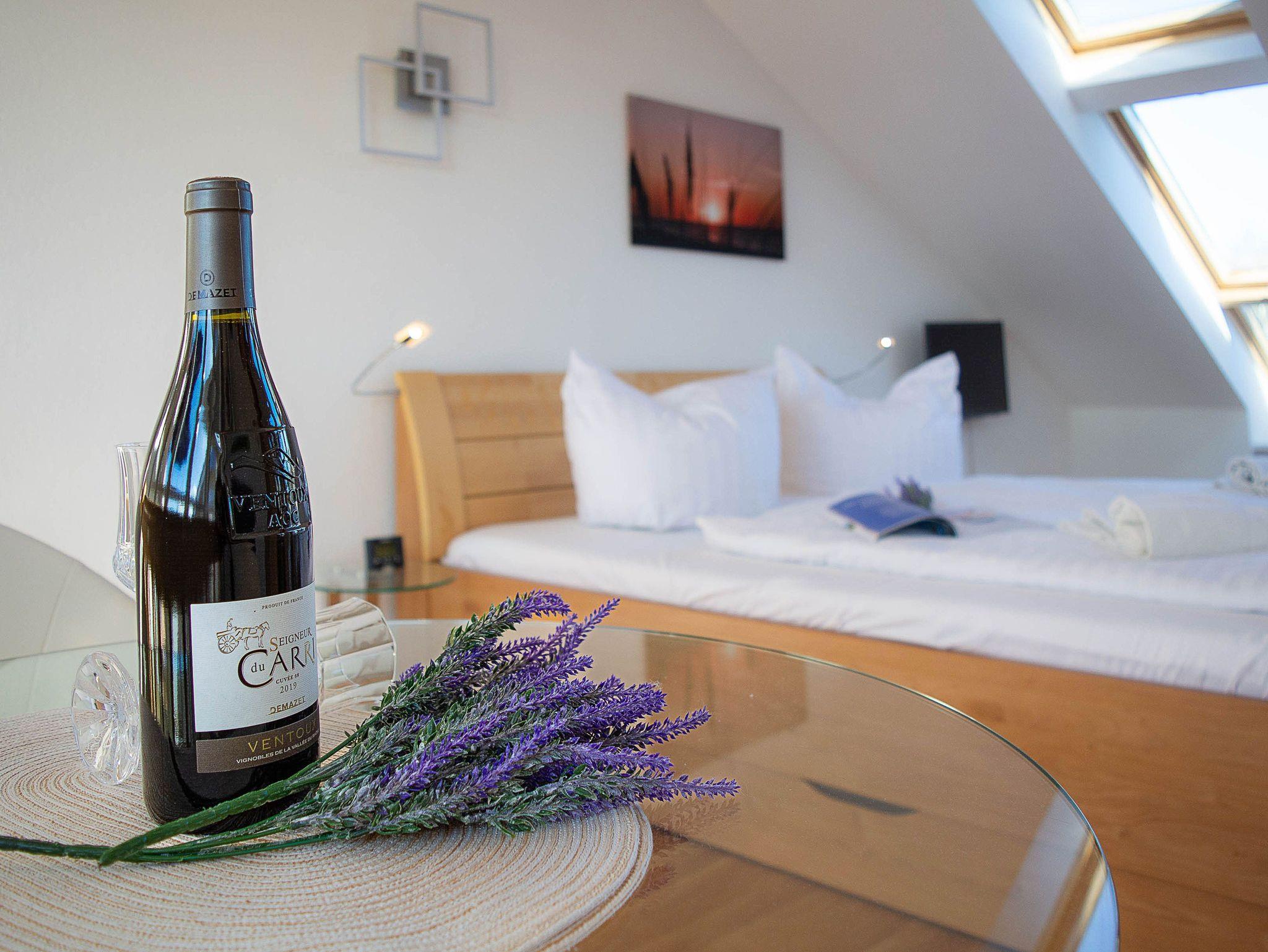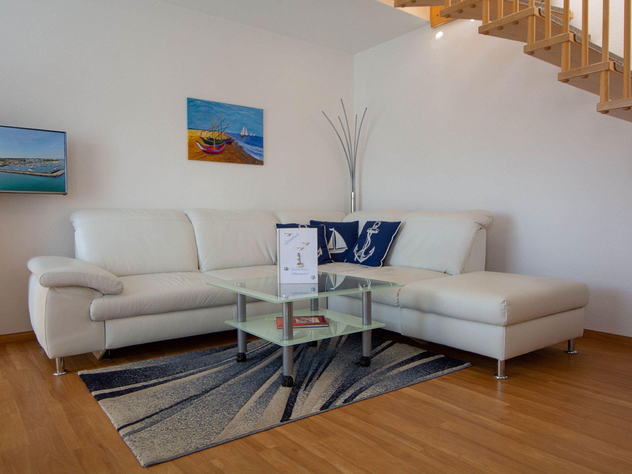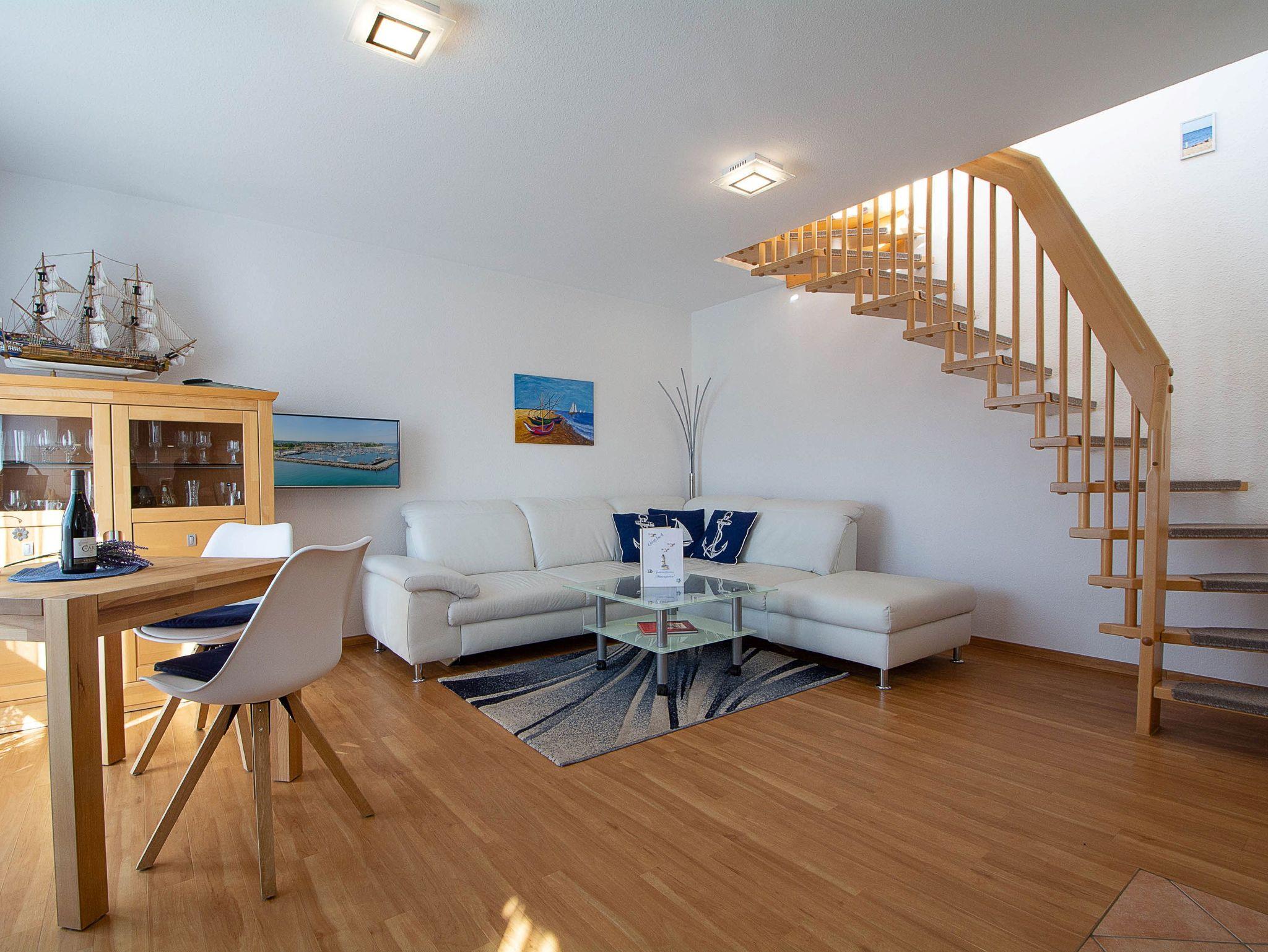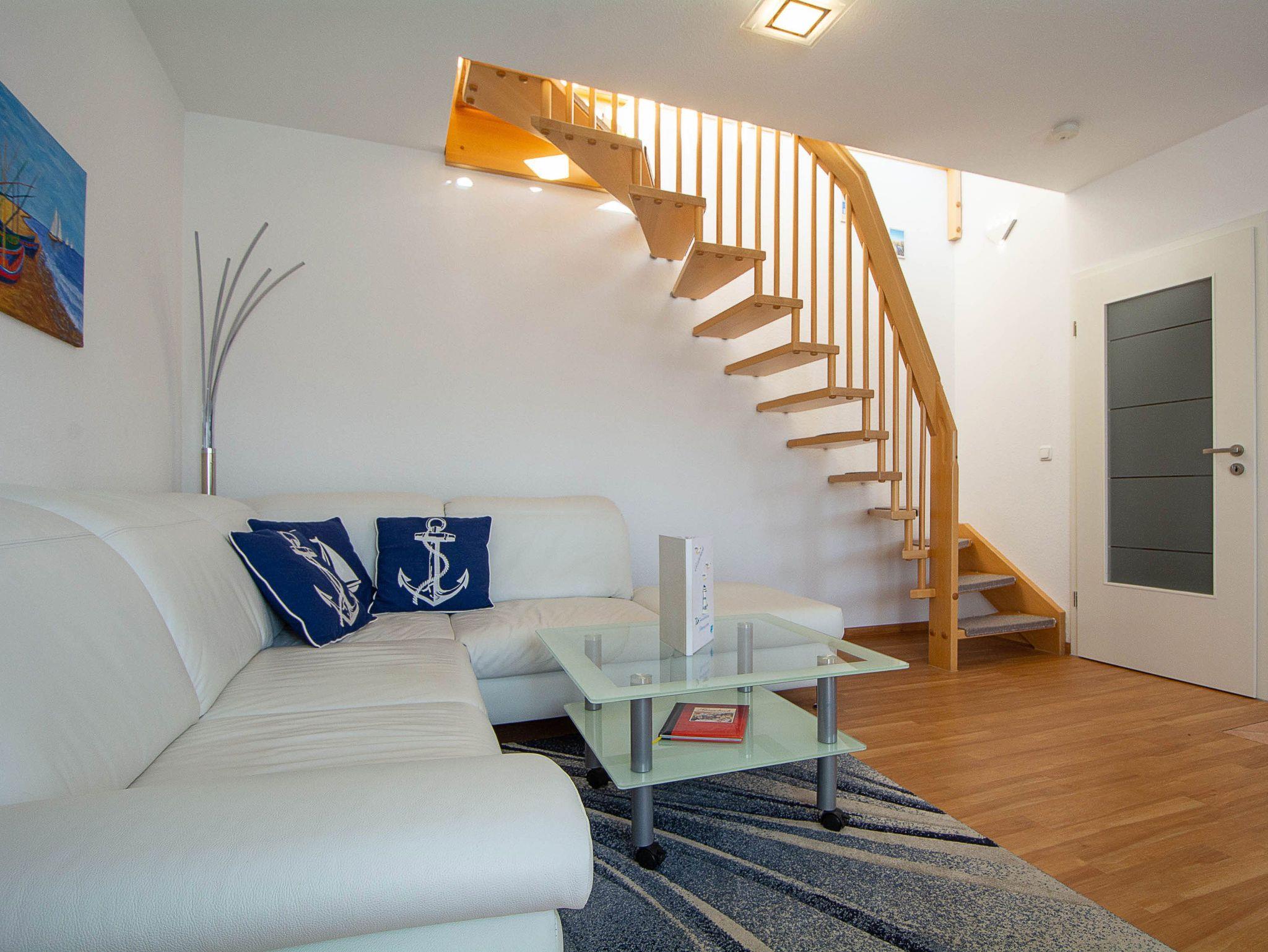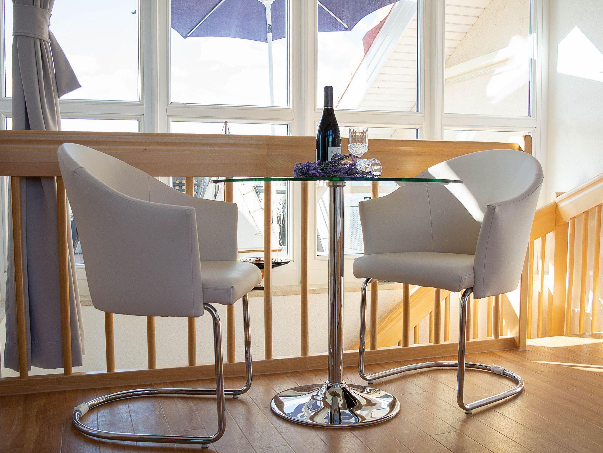 Hier werden Urlaubsträume wahr! Herzlich willkommen in der liebevoll eingerichteten 2-Raum-Ferienwohnung in der Residenz Dünengarten. Die helle lichtdurchflutete Maisonettewohnung erstreckt sich über 2 Etagen vom 2. Obergeschoss bis zum Dachgeschoss und bietet mit etwa 55qm Wohnfläche genügend Platz für 2 Personen, die es gerne etwas großzügiger haben möchten. In der unteren Etage empfängt Sie der offene Wohn- und Essbereich mit Couchgarnitur und Flachbild-TV, Küchenzeile und Esstisch. Die Küche ist ausgestattet mit allen wichtigen Küchengeräten und -utensilien, die Sie für Ihr perfektes Dinner benötigen: Backofen mit Dunstabzug und 4-Platten-Induktionsfeld, Geschirrspüler, Mikrowelle, Kühlschrank, Kaffeemaschine mit Thermoskanne, Wasserkocher, Toaster, Handmixer, Küchenwaage u.v.m. Ebenfalls in der unteren Etage befindet sich das geflieste Tageslicht-Bad mit Dusche, WC und Fön.