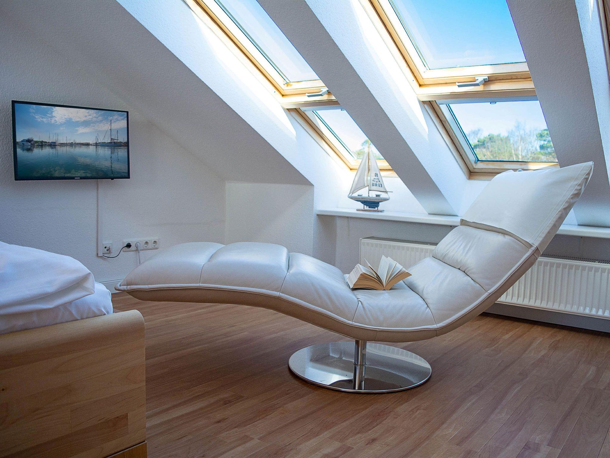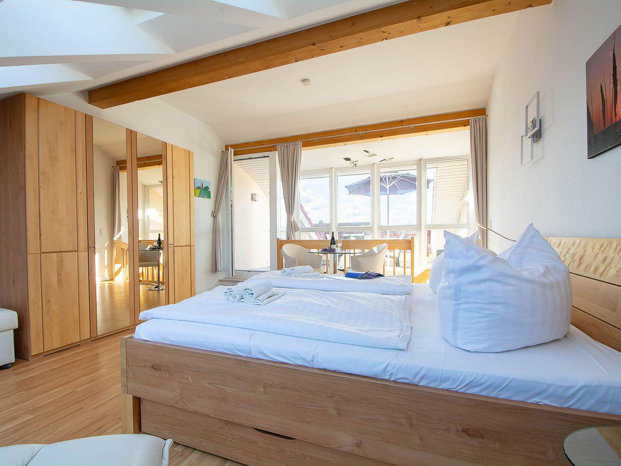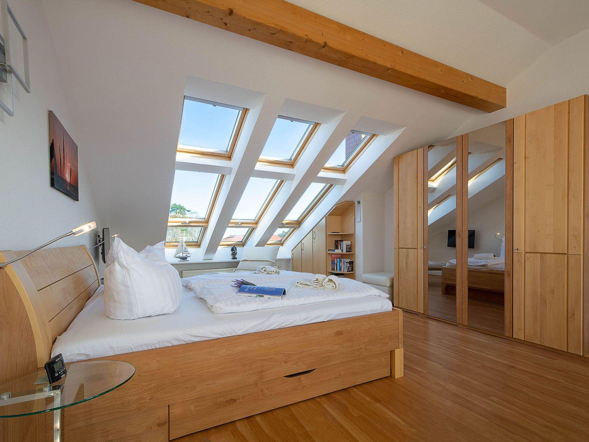 Über die offene Treppe im Wohnbereich gelangen Sie ins Dachgeschoss - dem Herzstück dieser liebevoll eingerichteten Ferienwohnung. Hier befindet sich der Schlafbereich und die große Dachterrasse. Das großzügige lichtdurchflutete Schlafzimmer mit Doppelbett und kleiner Sitzecke und Flachbild-TV besticht durch seine großen Dach-Fenster nach Norden und Süden. Auf der Nordseite können Sie eine herrliche Aussicht auf die gesamte Anlage bis hin zur Ostsee genießen. Von der Südseite betreten Sie die möblierte große Dachterrasse, die zum Relaxen und Sonnenbaden einlädt.