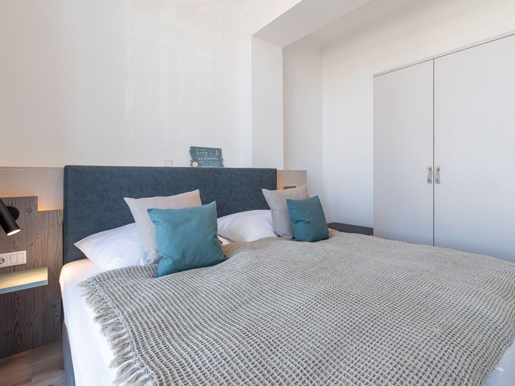 Das Schlafzimmer verfügt über ein 1,80 x 2,00 m Bett, sowie über einen Kleiderschrank und ein TV-Gerät. Die zweite Schlafmöglichkeit ist ein bequemes Schlafsofa mit einer Liegefläche von 1,50 x 1,95 m. Für unsere kleinen Gäste können ein Kinderreisebett und ein Kinderhochstuhl bereitgestellt werden (kostenpflichtig zu buchbar).