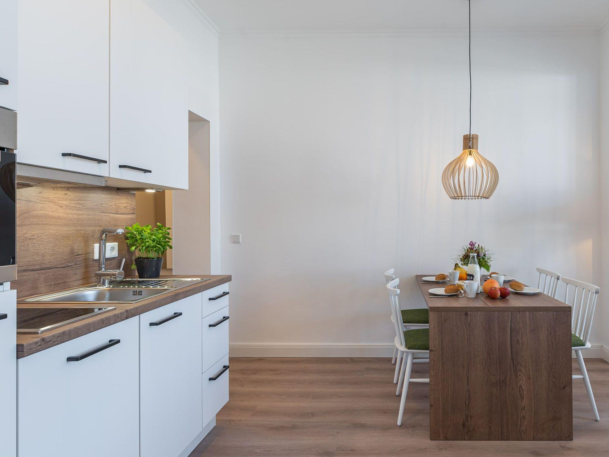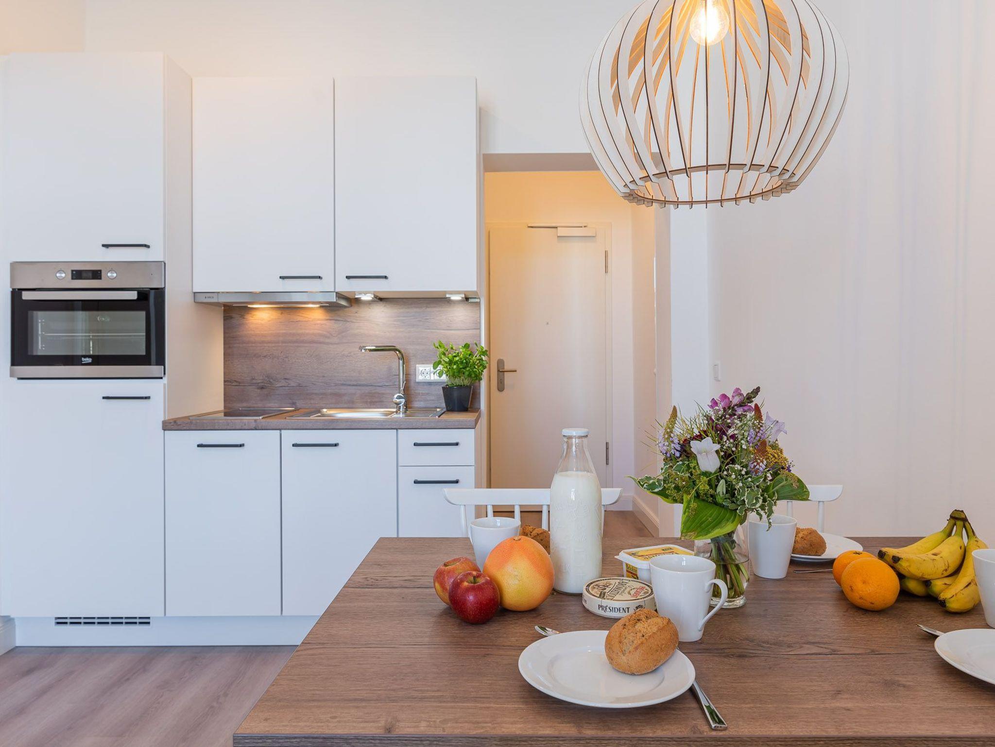 Das Bad verfügt über eine Dusche, einem Haartrockner und einem Handtuchtrockner. Zu Ihrem Apartment gehört ebenfalls ein großer und lichtdurchfluteter Wohn- und Essbereich mit offener Küche.