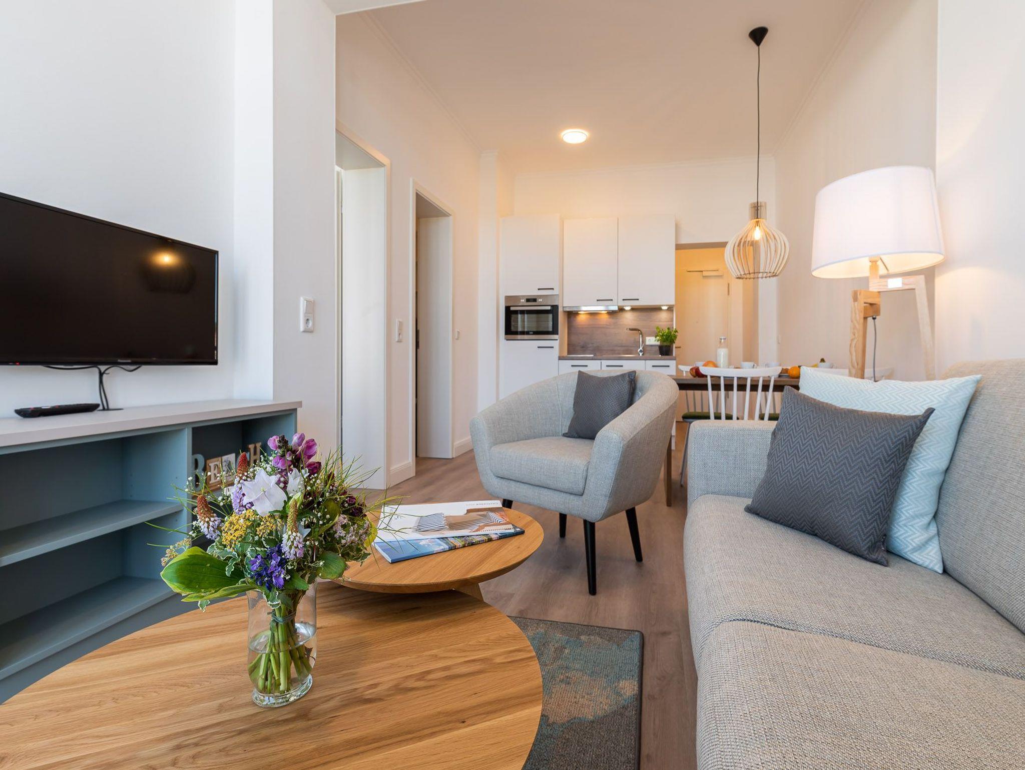 Das Apartment bietet mit seinen zwei Zimmern Platz für 4 Personen. Außerdem verfügt es neben seiner Wohnfläche von ca. 43 qm auch über zwei Balkone. Diese sind mit Balkonmöbeln und einem Sonnenschirm ausgestattet.