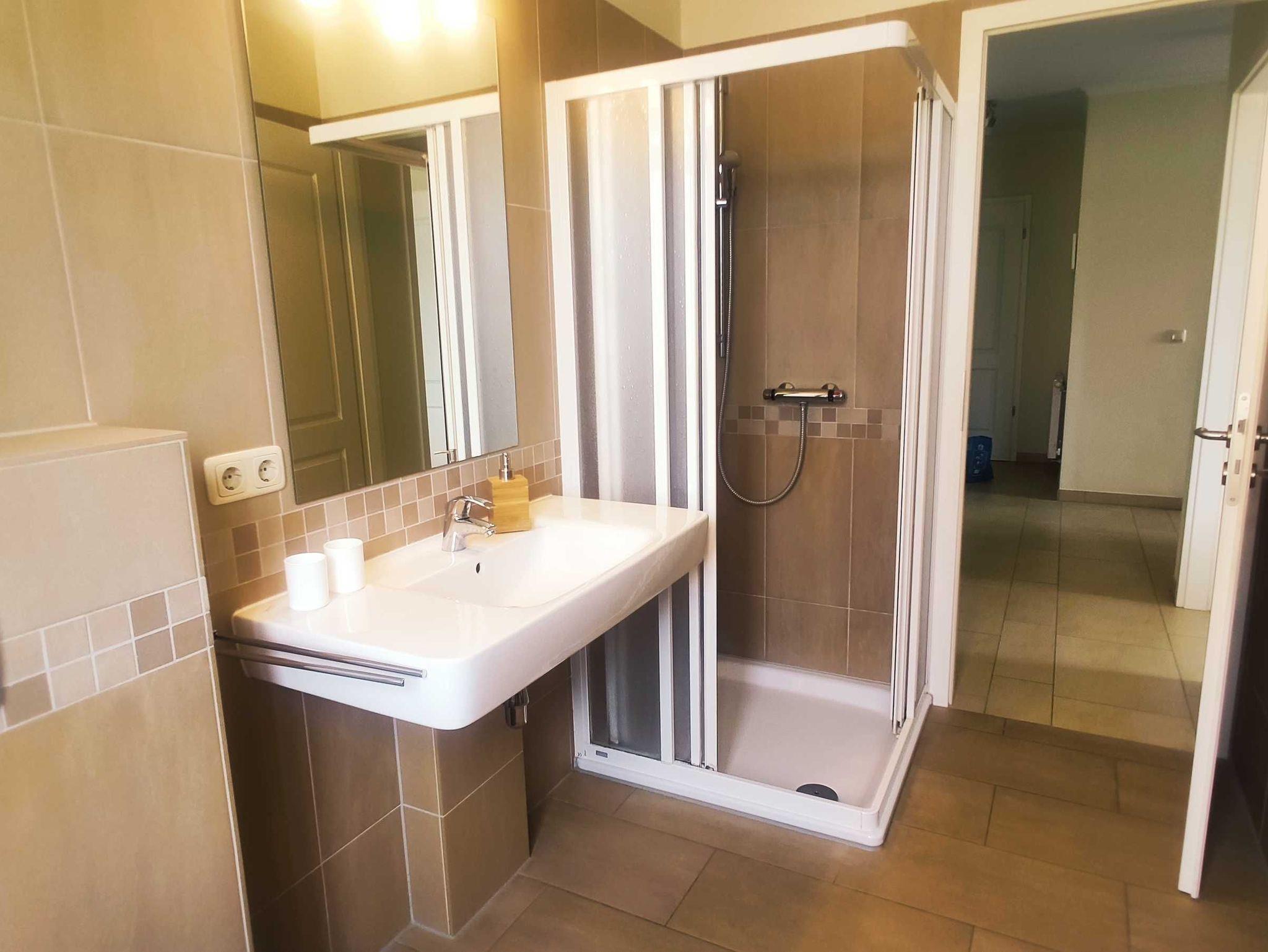 2-Zimmer-Ferienwohnung im Obergeschoss, bestehend aus Wohnzimmer (Fernsehcouch, TV, Essecke), Schlafzimmer (Ehebett mit getrennten Matratzen), Küche (Mikrowelle, Geschirrspüler), Bad mit WC/Dusche, Balkon und Loggia zur Westseite.