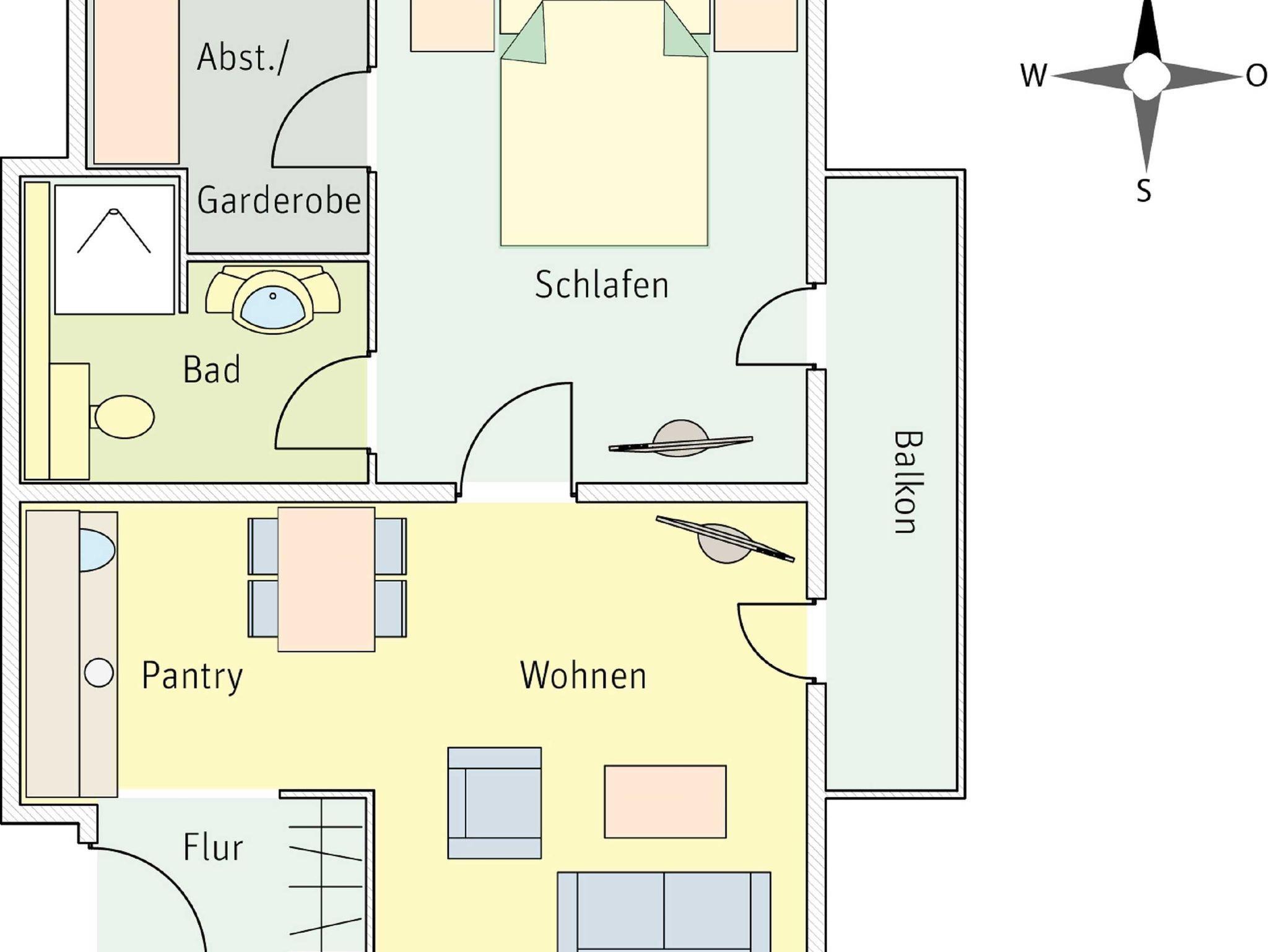 Die Ferienwohnung Queen ist eine schöne Zweiraum-Wohnung mit Balkon. Sie ist ca. 44 qm groß.