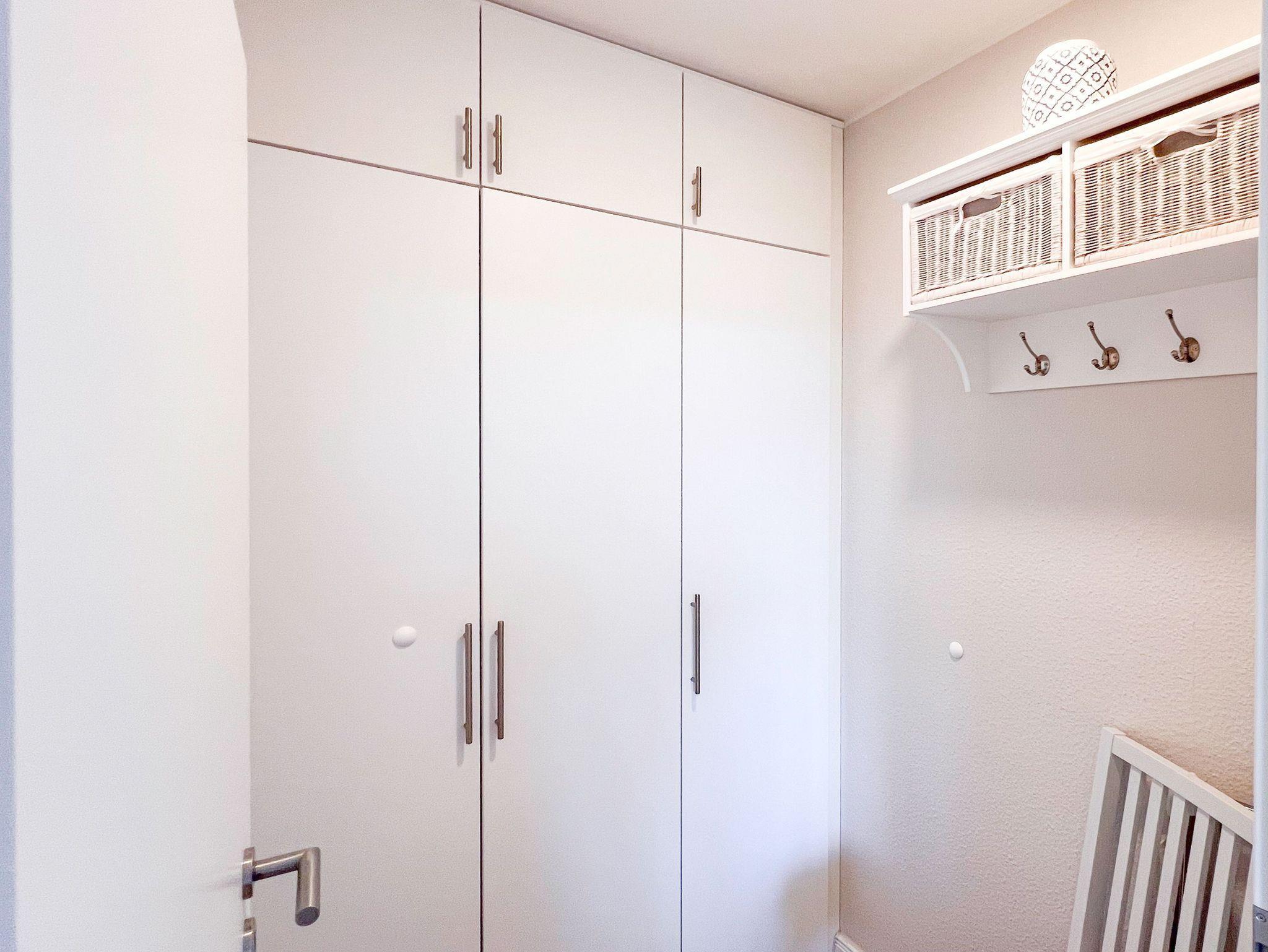 Die praktisch gestaltete Ferienwohnung in der 2. Etage hat einen offenen Wohnbereich mit Küchenzeile und Essbereich, ein Schlafzimmer mit Doppelbett, kleines Ankleidezimmer. Die funktionale Küchenzeile ist mit 2-Platten-Ceran-Kochfeld, Kühlschrank, Mikrowelle, Kaffeemaschine und div. Geschirr ausgestattet.